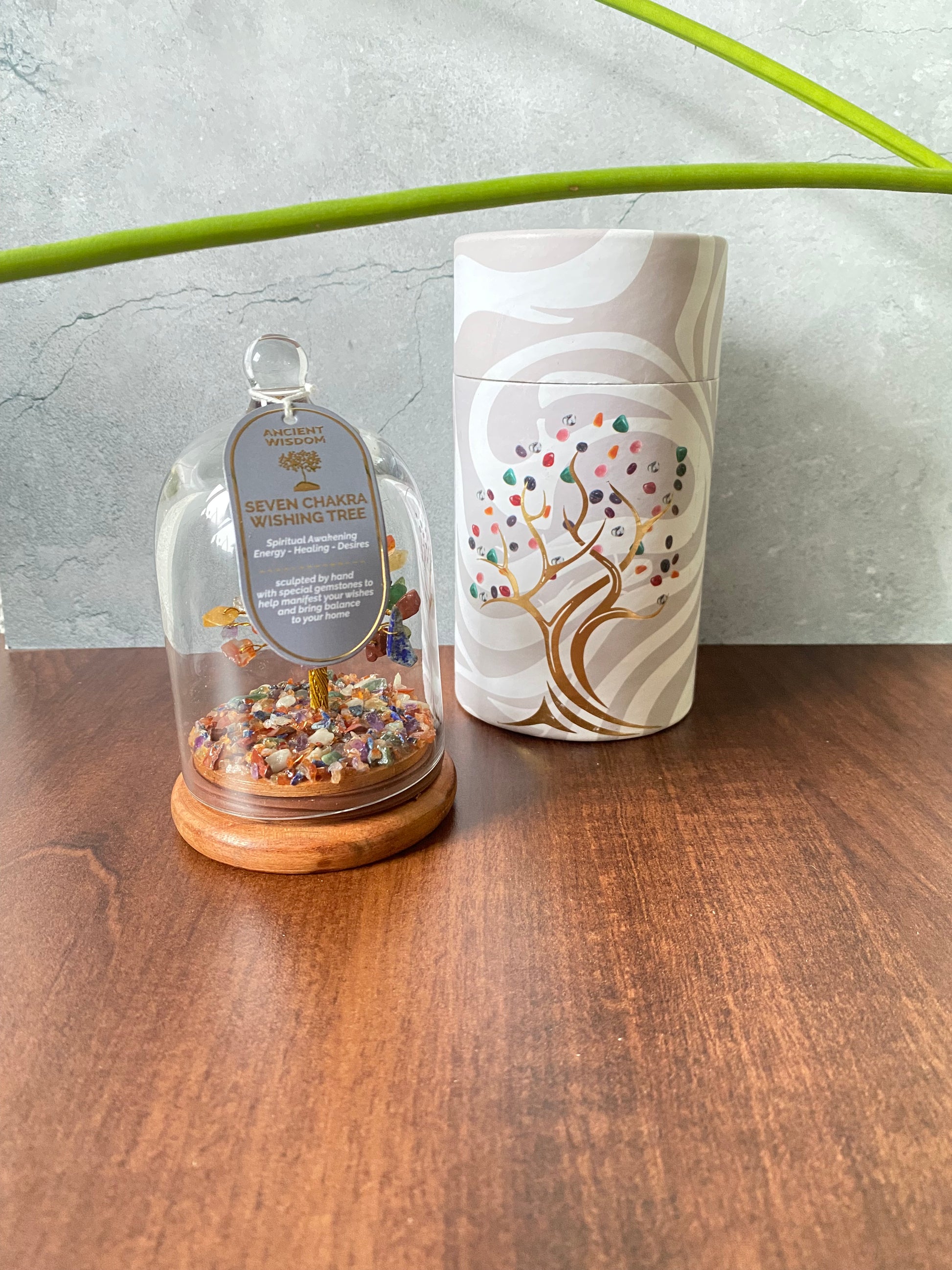 Die elegante Glaskuppel schützt den Baum und verleiht ihm eine edle Ausstrahlung. Verpackt in einer hochwertigen Geschenkbox ist dieser Chakra-Baum ein sofort fertiges Geschenk oder eine inspirierende Dekoration für dein Zuhause, Büro oder deinen Meditationsraum.