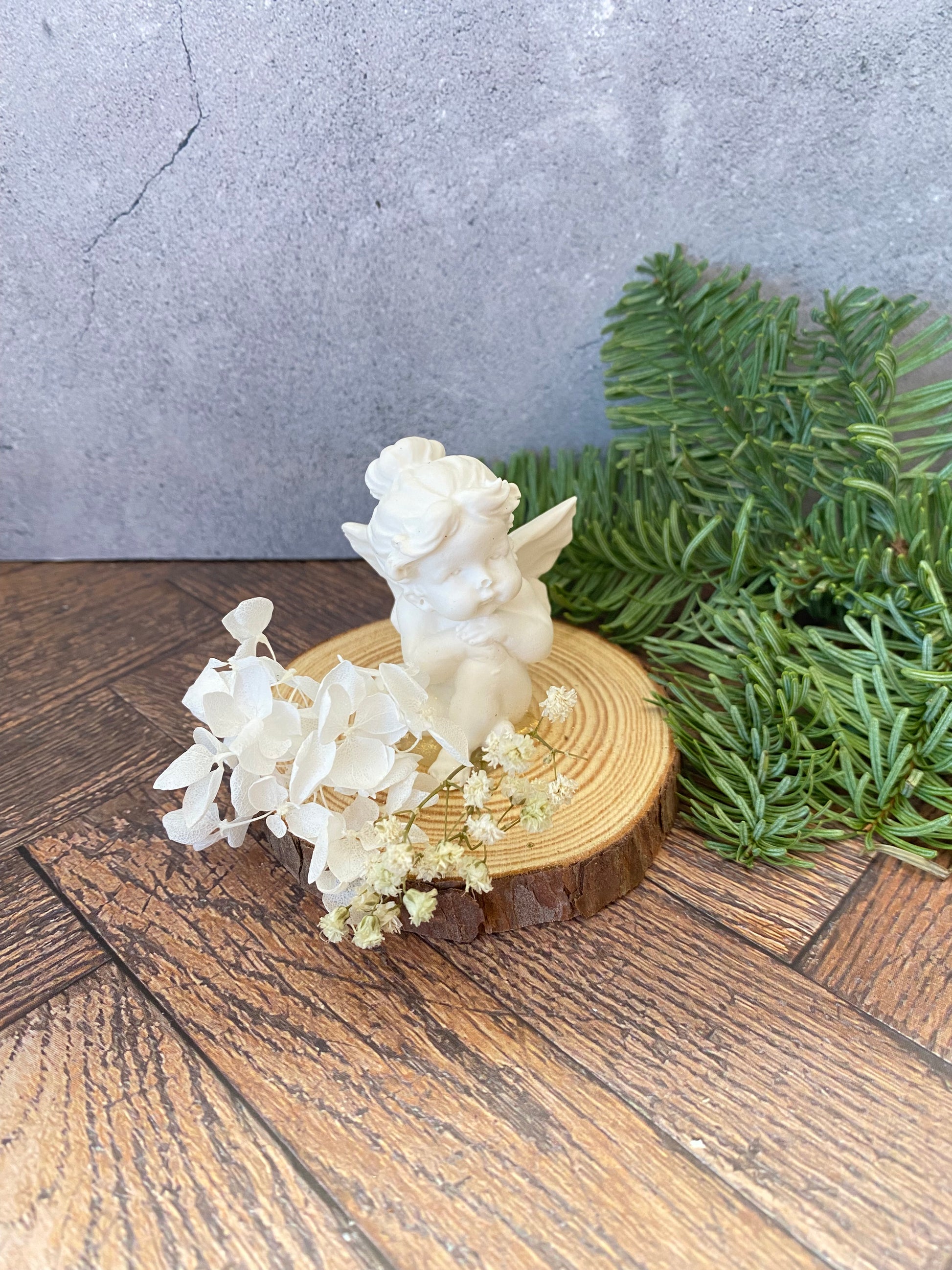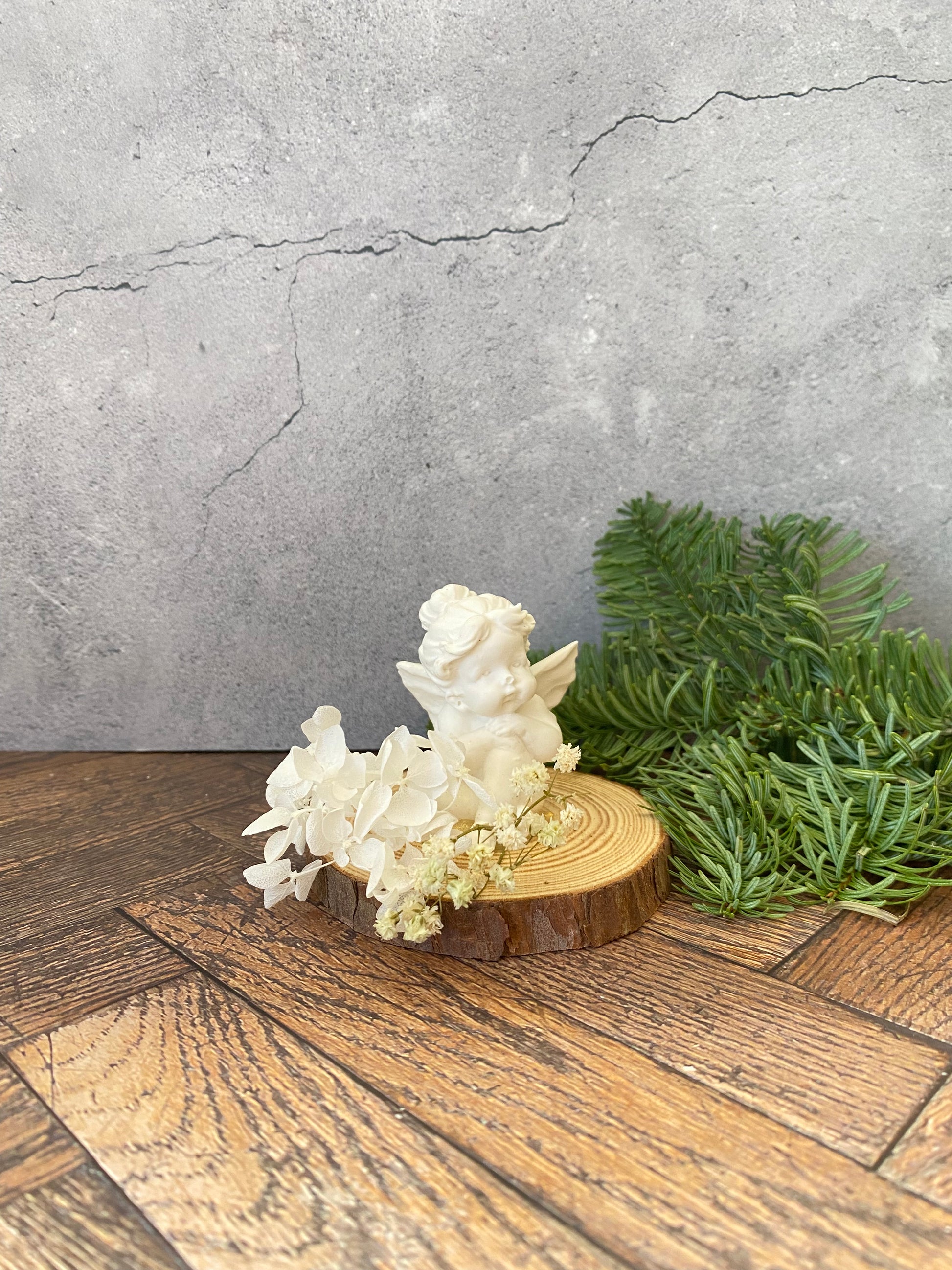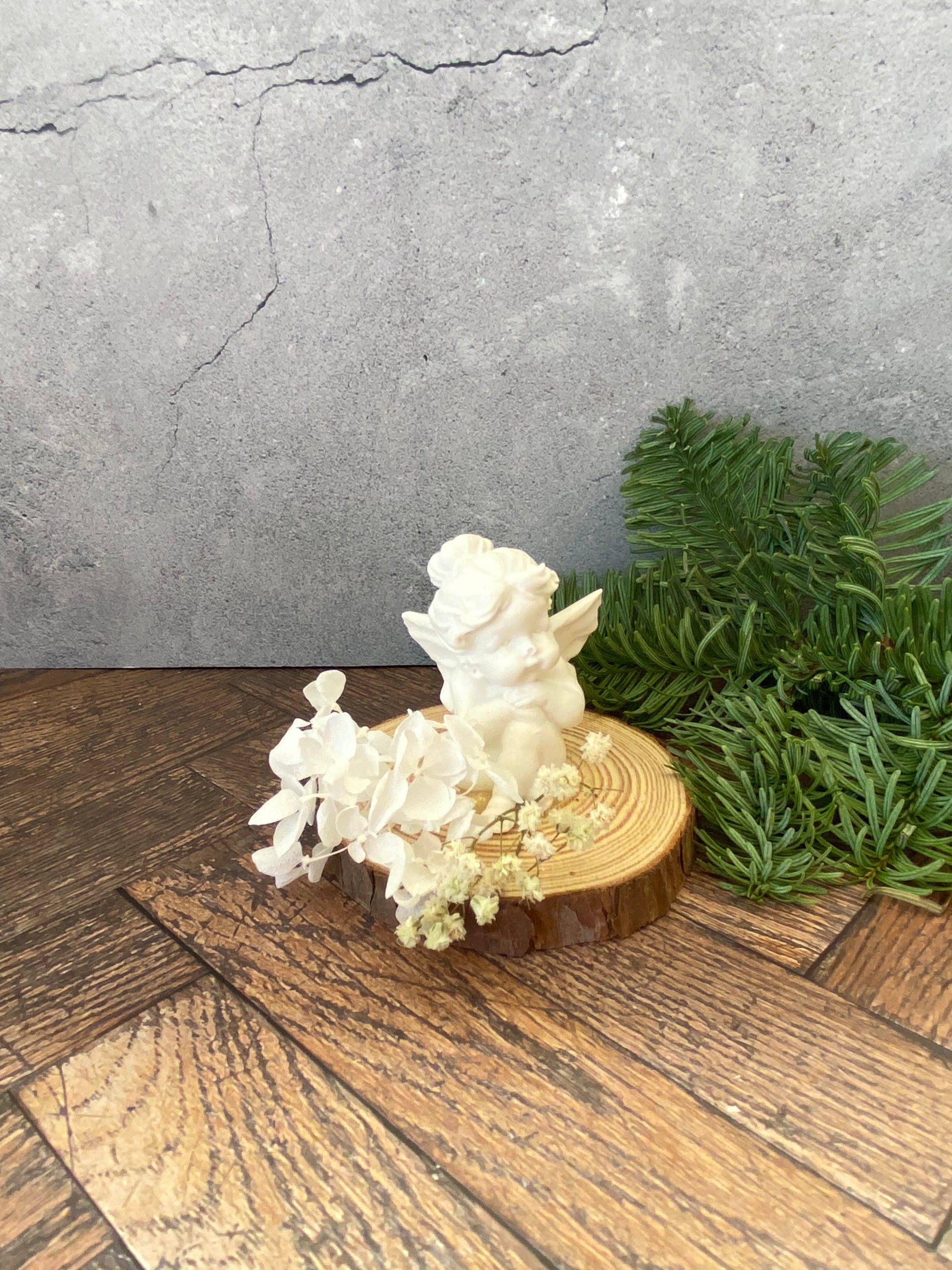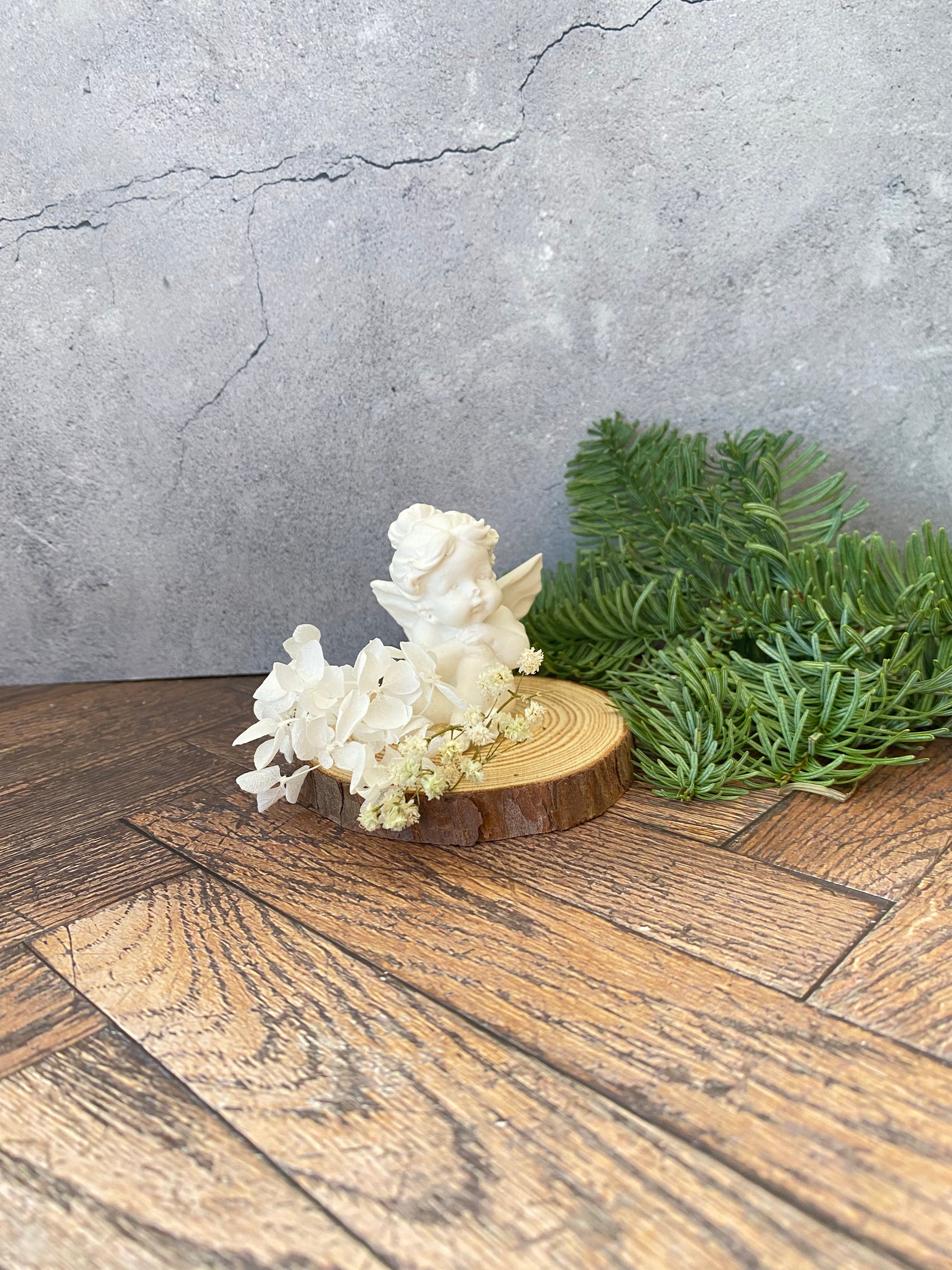 Die Kombination aus naturbelassener Holzscheibe, feinen Blüten und dem sanft wirkenden Engel macht dieses Arrangement zu einer wunderschönen Wohnraumdekoration, ideal für gemütliche Momente, zum Entspannen oder einfach, um deinem Zuhause etwas Zauber zu verleihen.