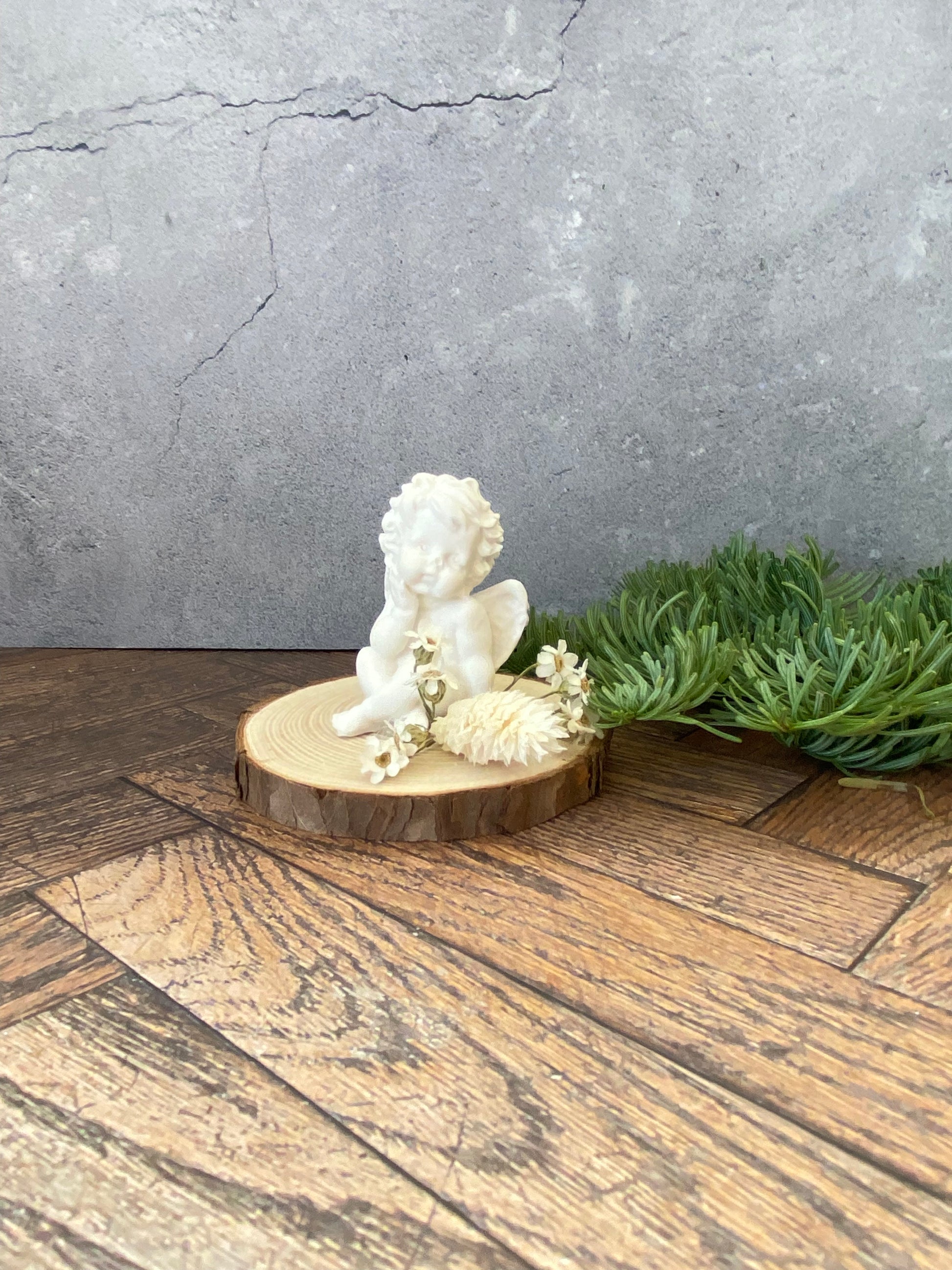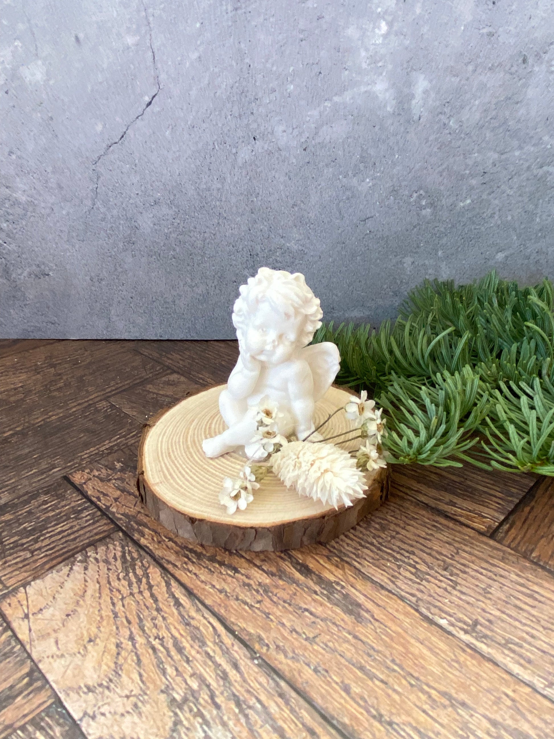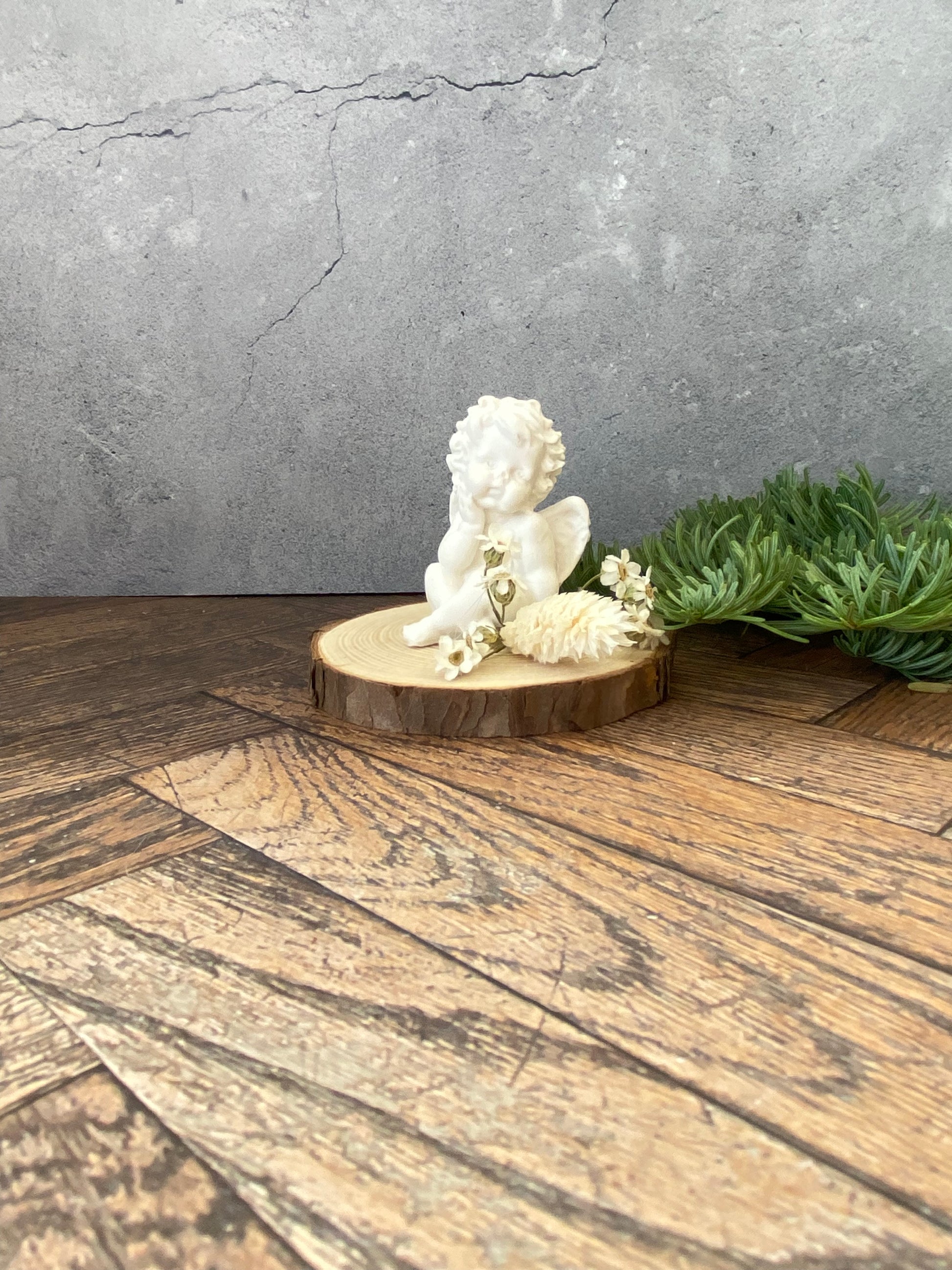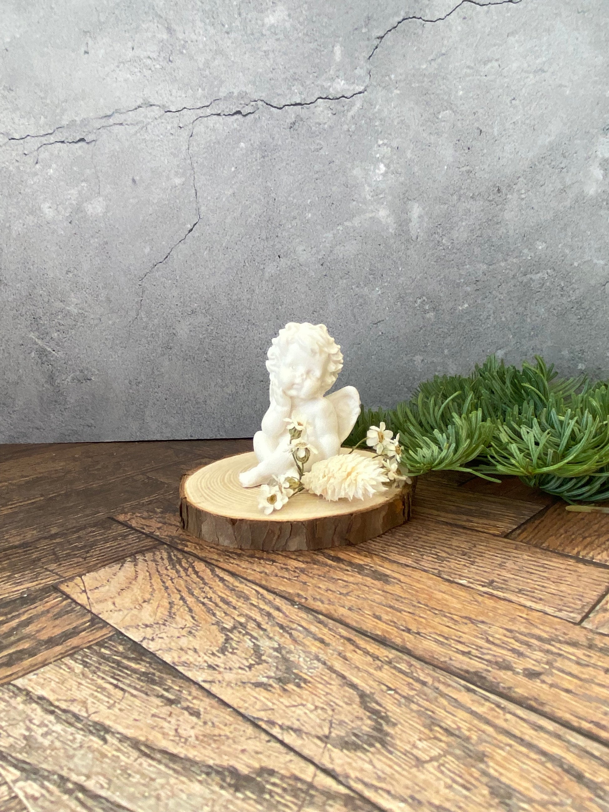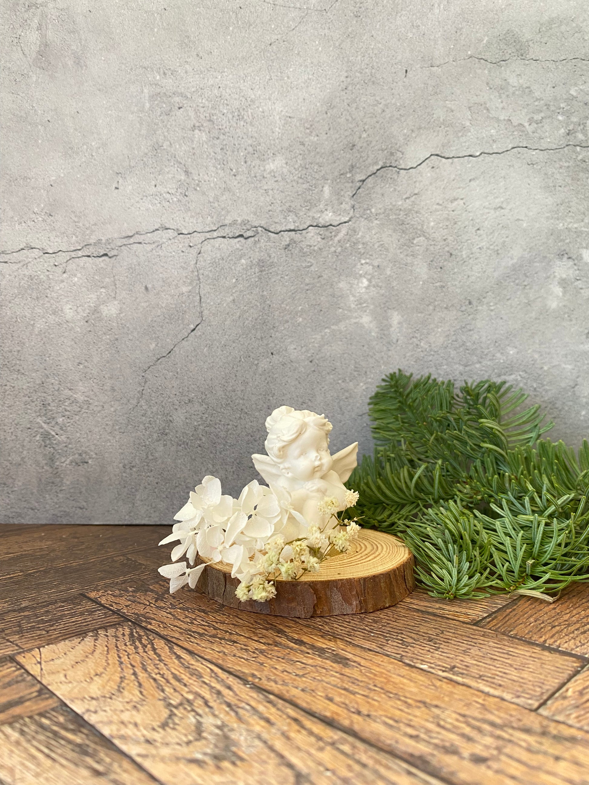 Die Kombination aus naturbelassener Holzscheibe, feinen Blüten und dem sanft wirkenden Engel macht dieses Arrangement zu einer wunderschönen Wohnraumdekoration, ideal für gemütliche Momente, zum Entspannen oder einfach, um deinem Zuhause etwas Zauber zu verleihen.