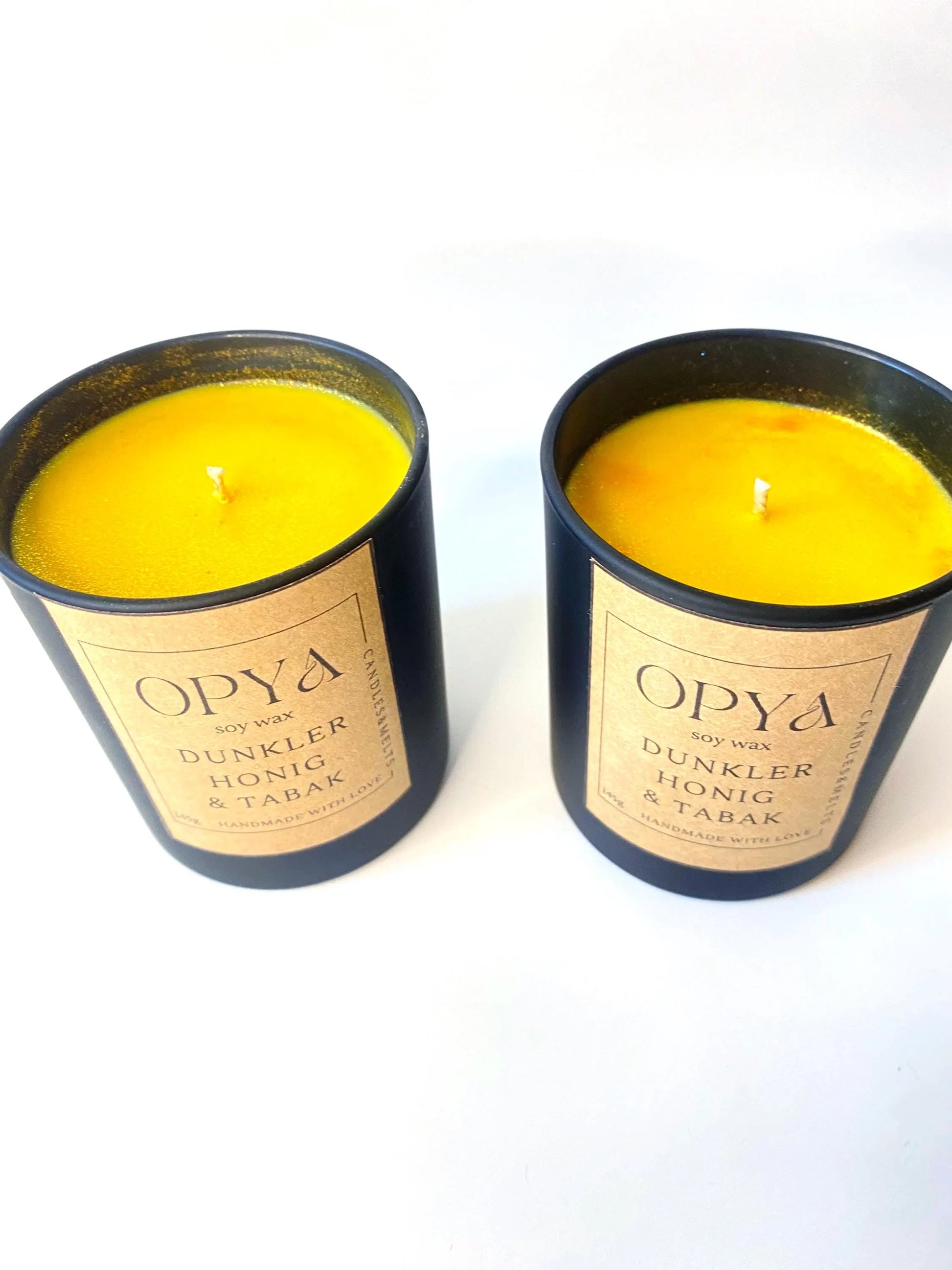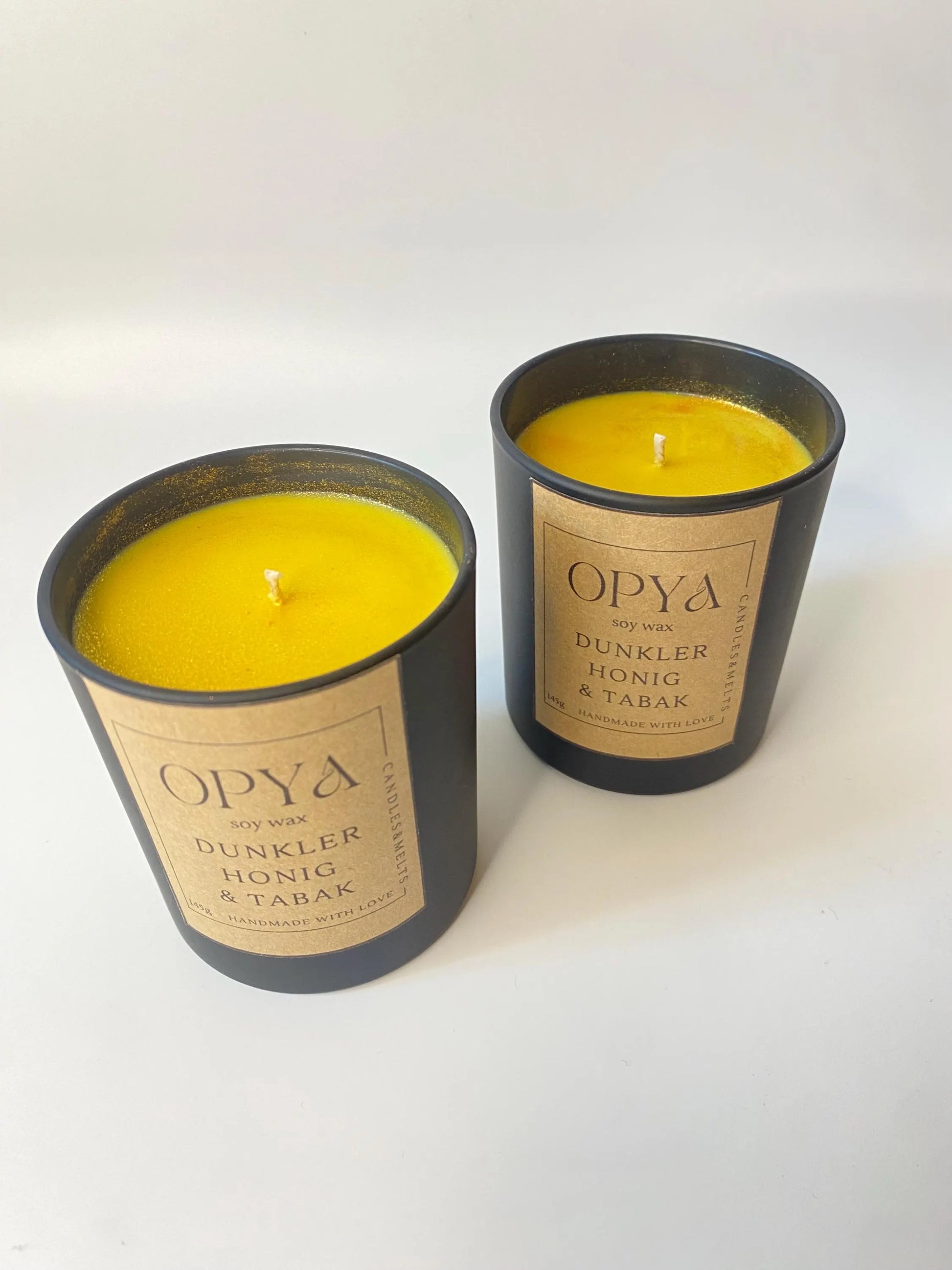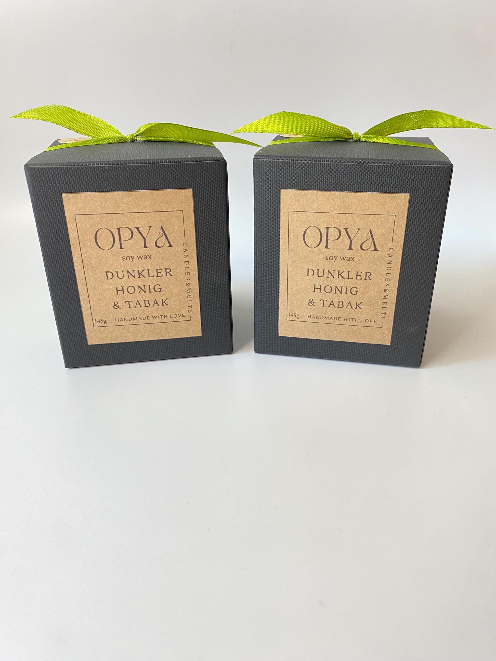Die handgegossene Duftkerze „Dunkler Honig und Tabak“ in einem eleganten, schwarzen matten Kerzenglas / verpackt in schwarzer Kartonage mit Schleife , verströmt einen maskulinen, rauchigen Duft, der Wärme und Geheimnis in jeden Raum bringt. Mit einer Mischung aus Sojawachs, Baumwoll-docht und 145 Gramm Inhalt wird diese Kerze zu einem wahren Highlight für gemütliche Abende. Der Duft vereint die Süße von Honig mit der Intensität von Tabak und Gewürzen und zieht mit einer opulenten, fast winterlichen Note die Sinne in seinen Bann.