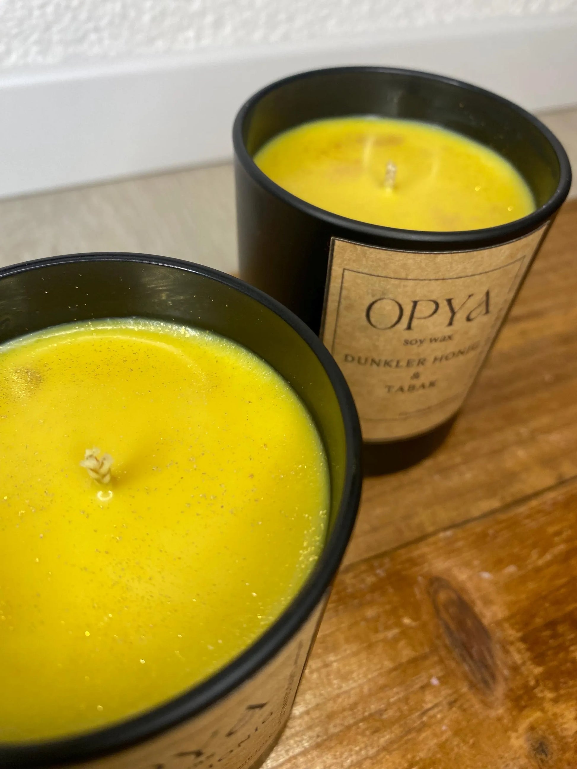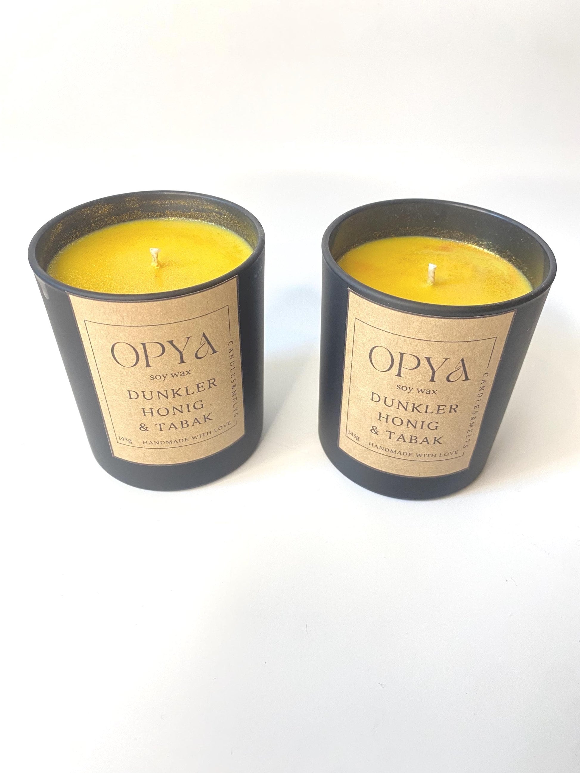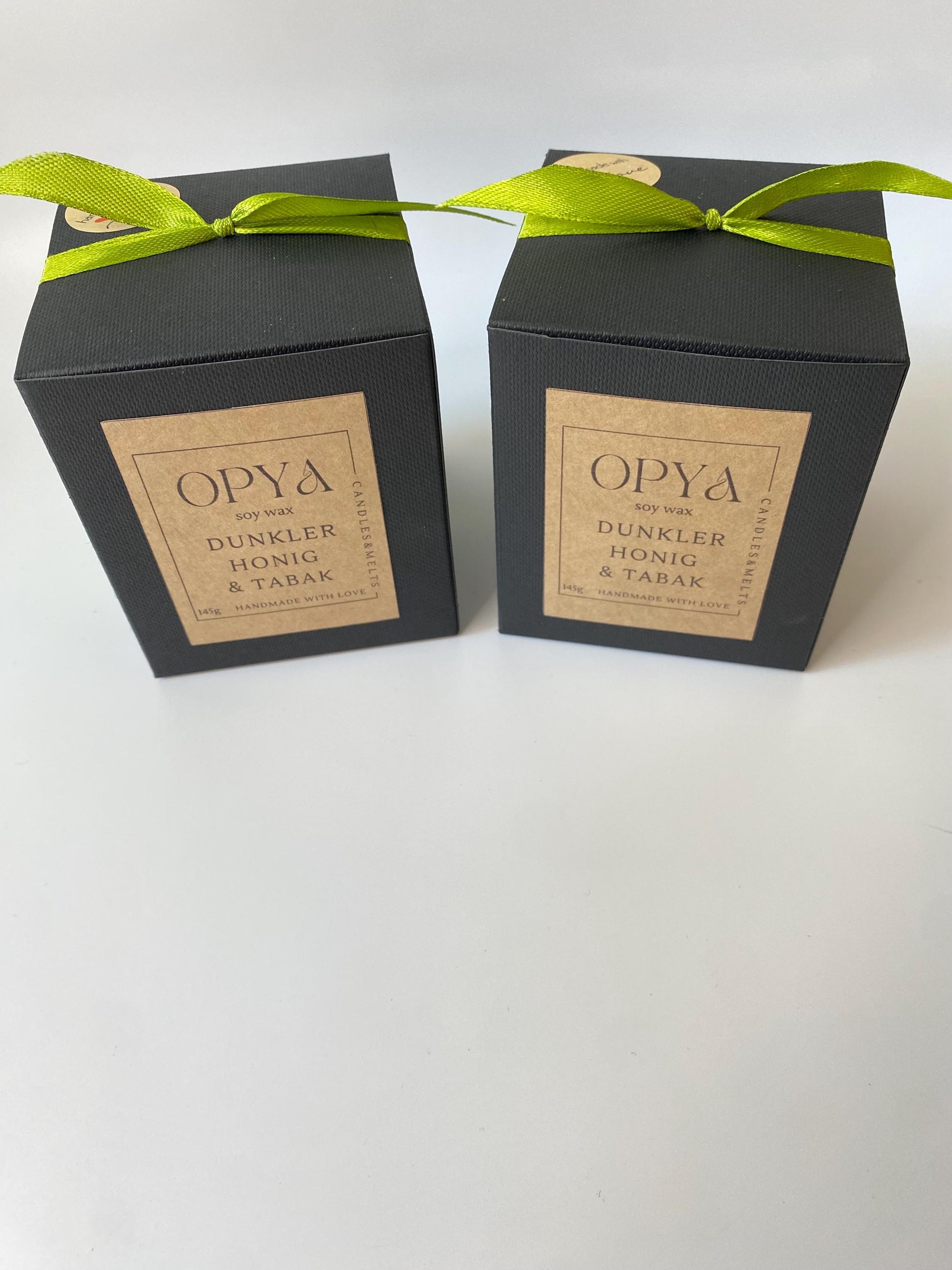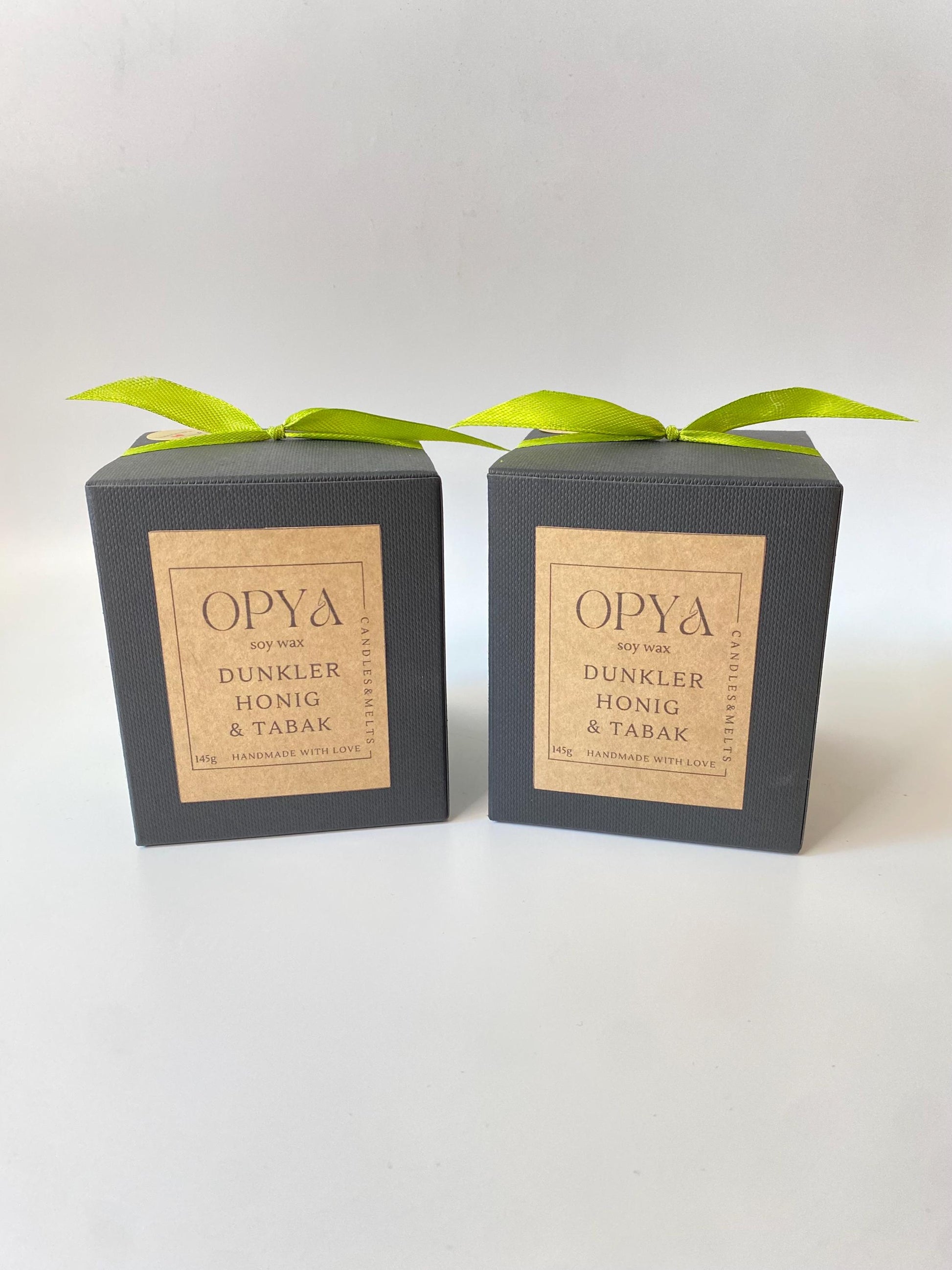 Die handgegossene Duftkerze „Dunkler Honig und Tabak“ in einem eleganten, schwarzen matten Kerzenglas / verpackt in schwarzer Kartonage mit Schleife , verströmt einen maskulinen, rauchigen Duft, der Wärme und Geheimnis in jeden Raum bringt. Mit einer Mischung aus Sojawachs, Baumwoll-docht und 145 Gramm Inhalt wird diese Kerze zu einem wahren Highlight für gemütliche Abende. Der Duft vereint die Süße von Honig mit der Intensität von Tabak und Gewürzen und zieht mit einer opulenten, fast winterlichen Note die Sinne in seinen Bann.