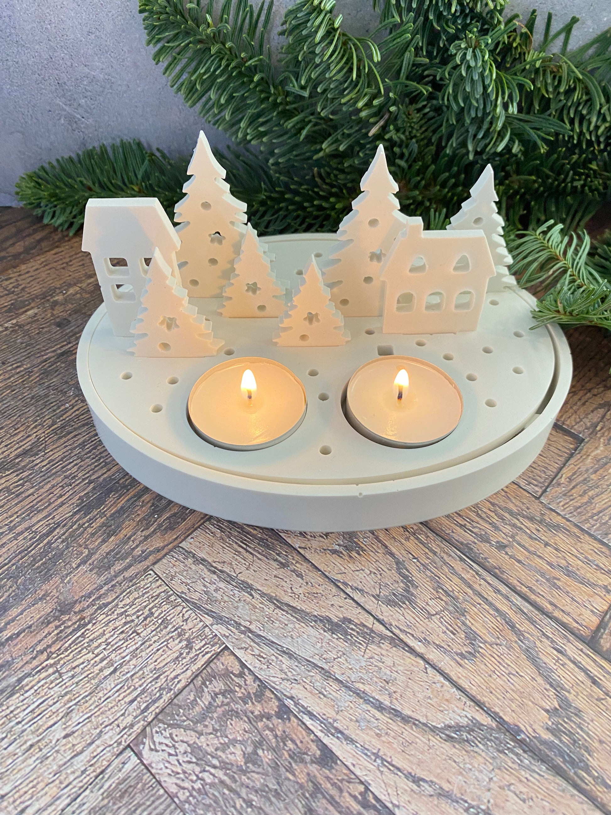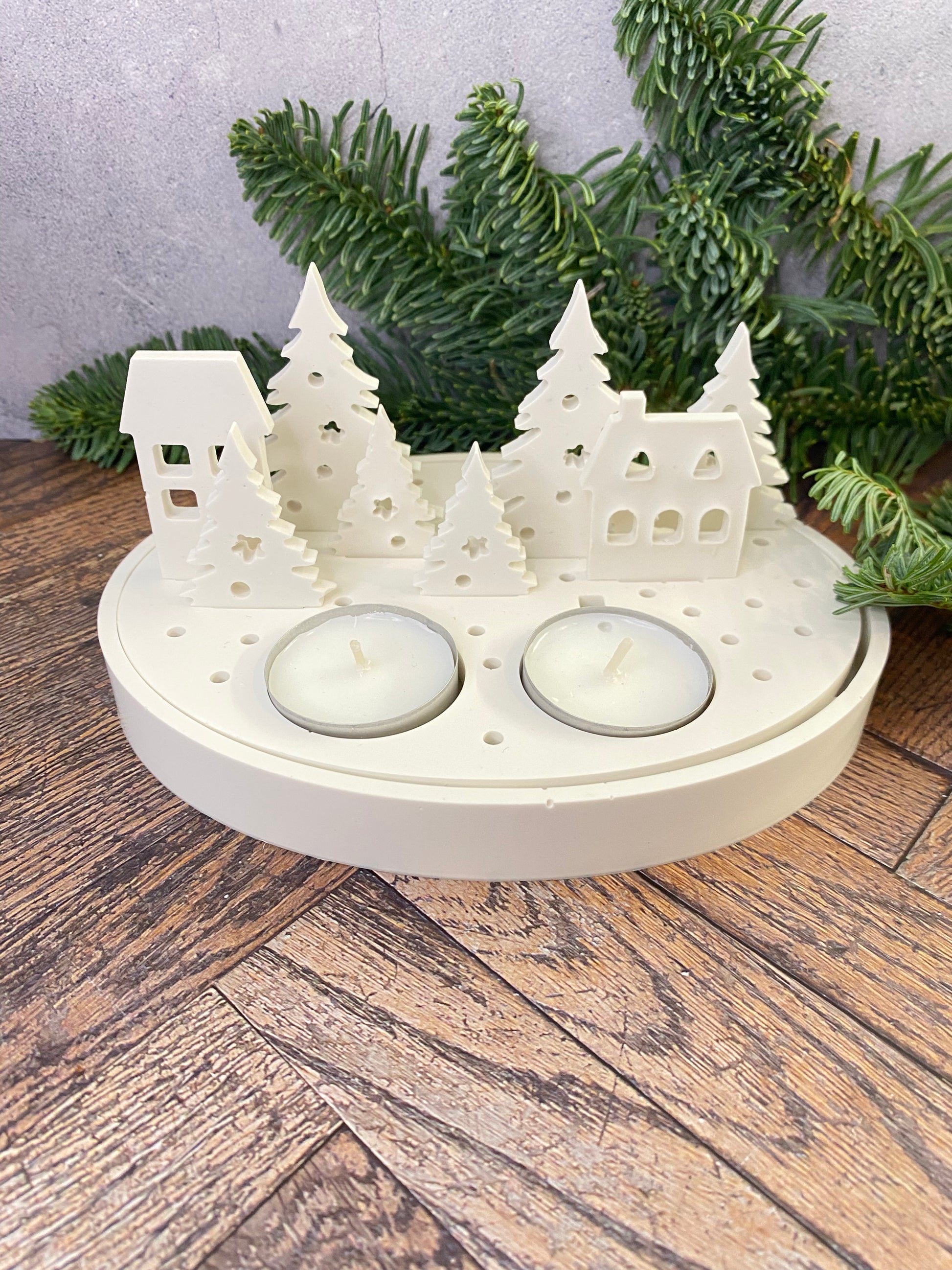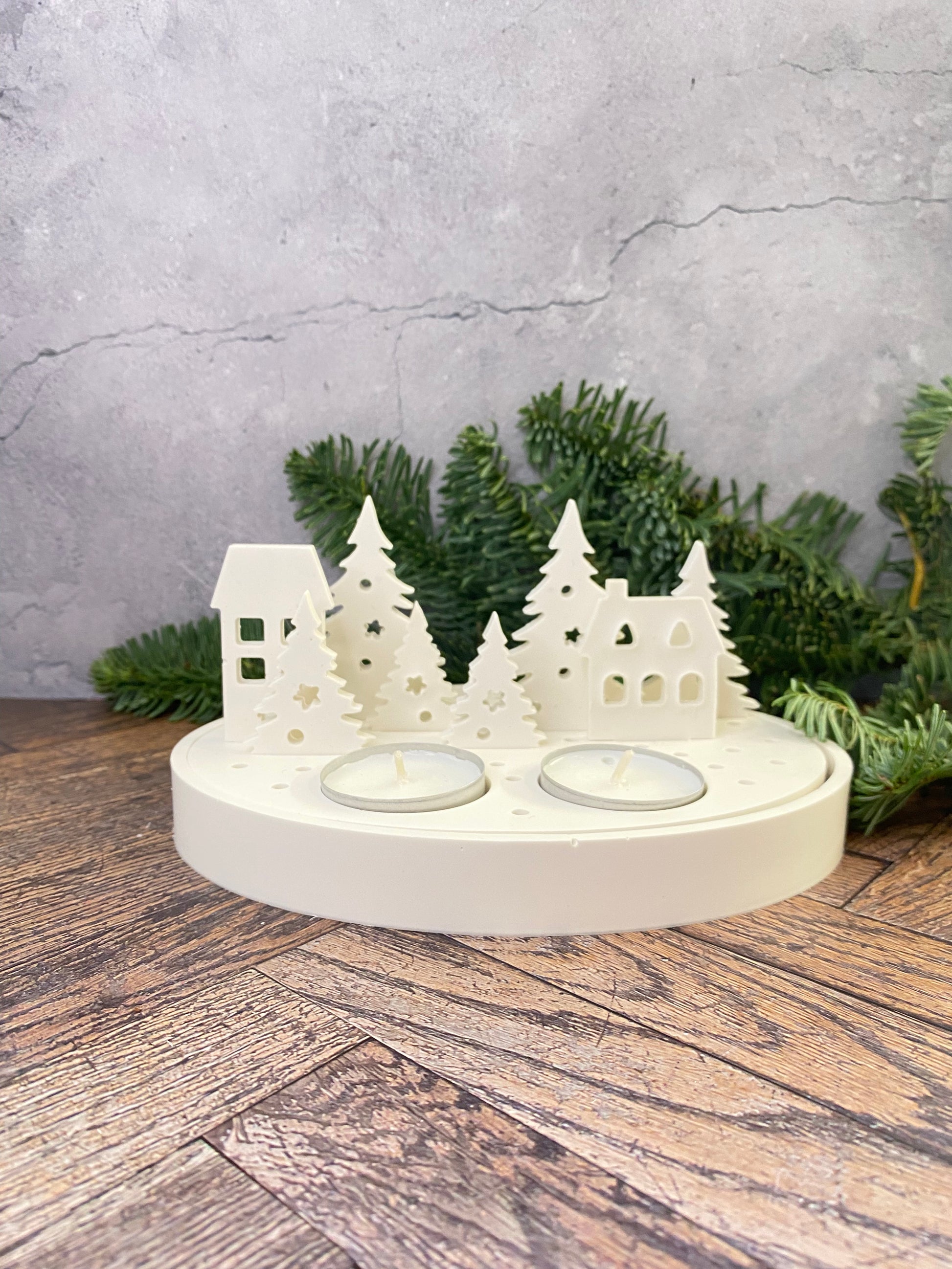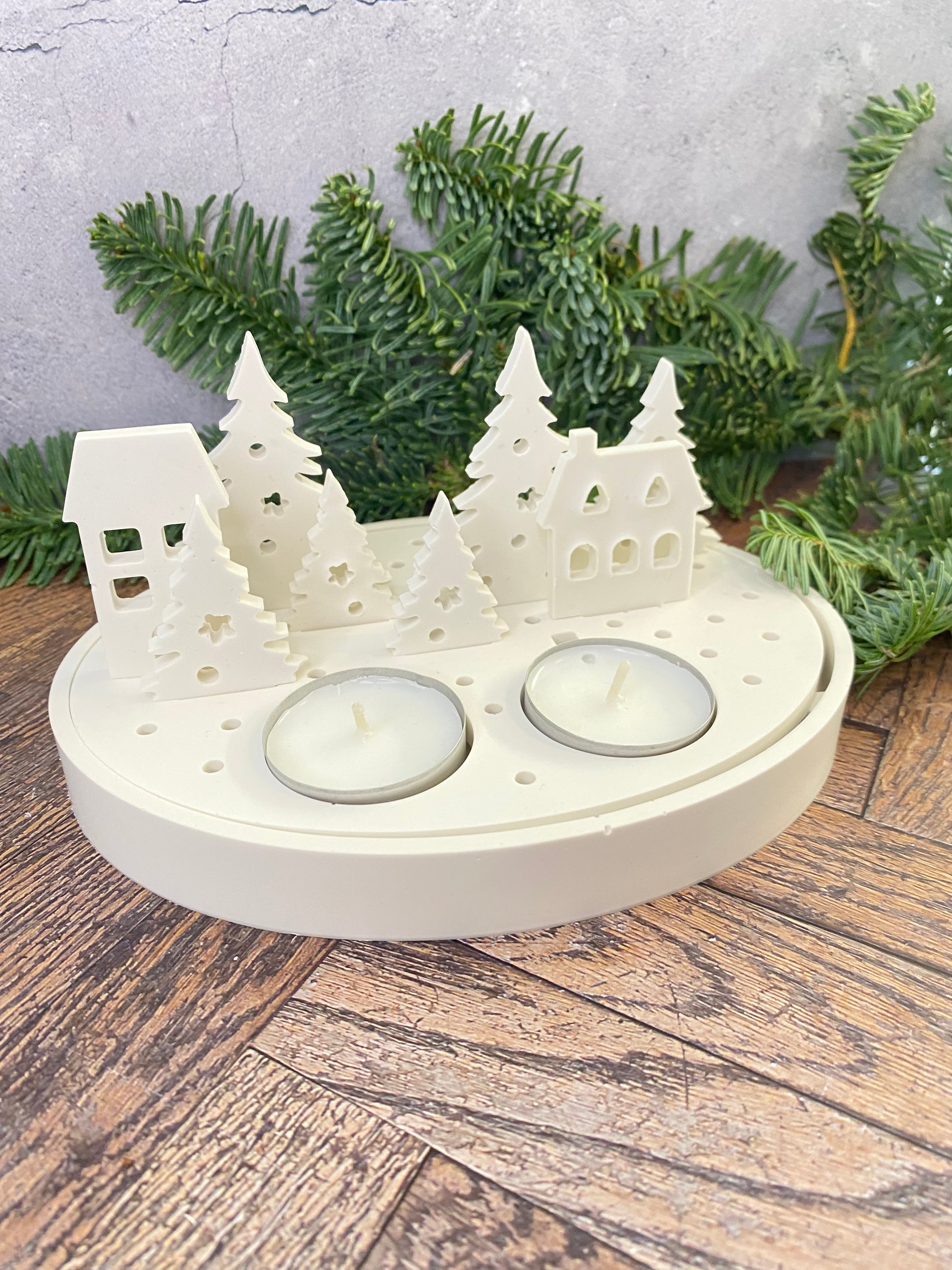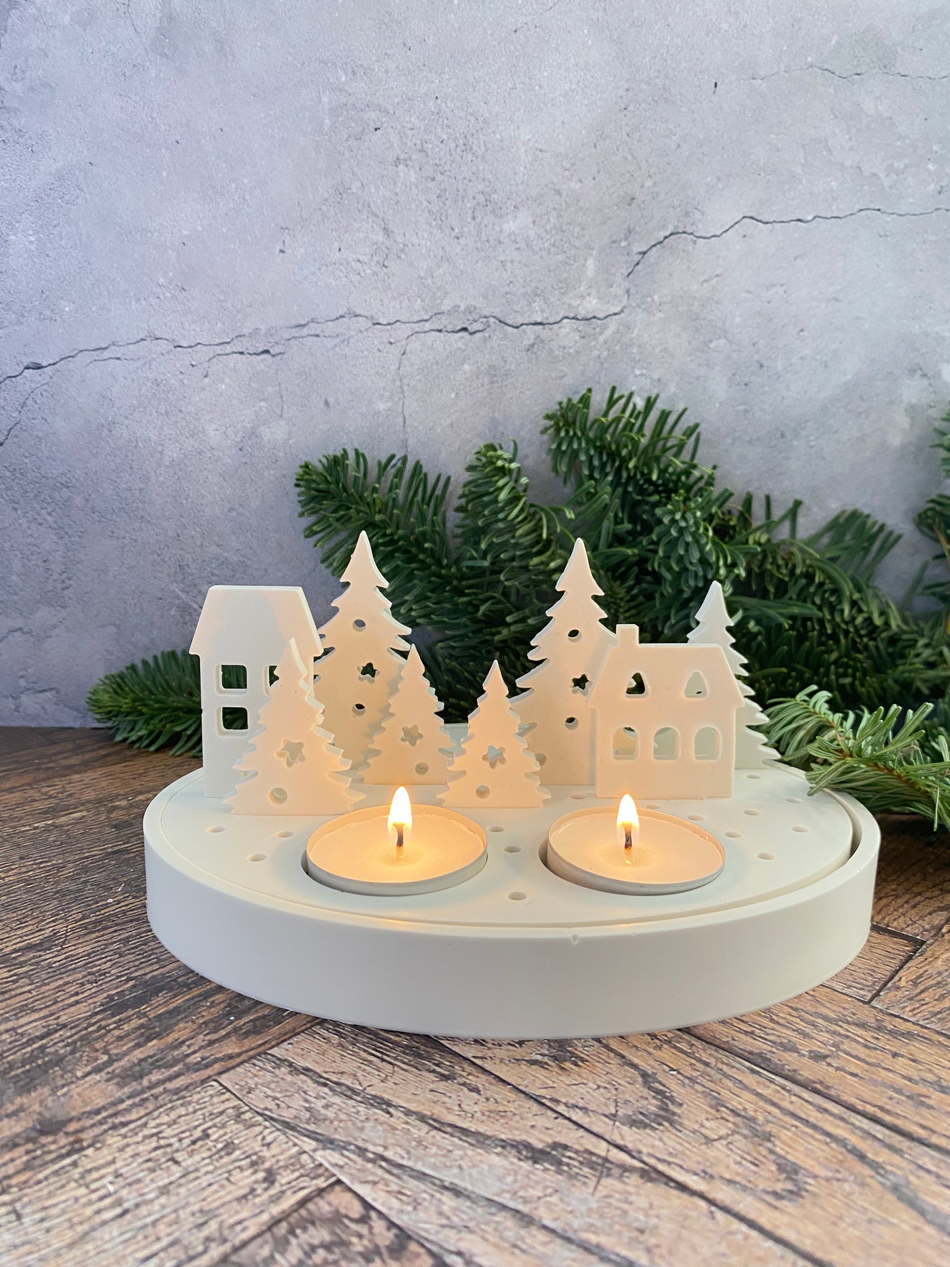 Handangefertigte Jesin Winterlandschaft – Weißes Deko Tablett mit 2 Teelichthaltern, 6 Tannenbäumen & 2 Häusern