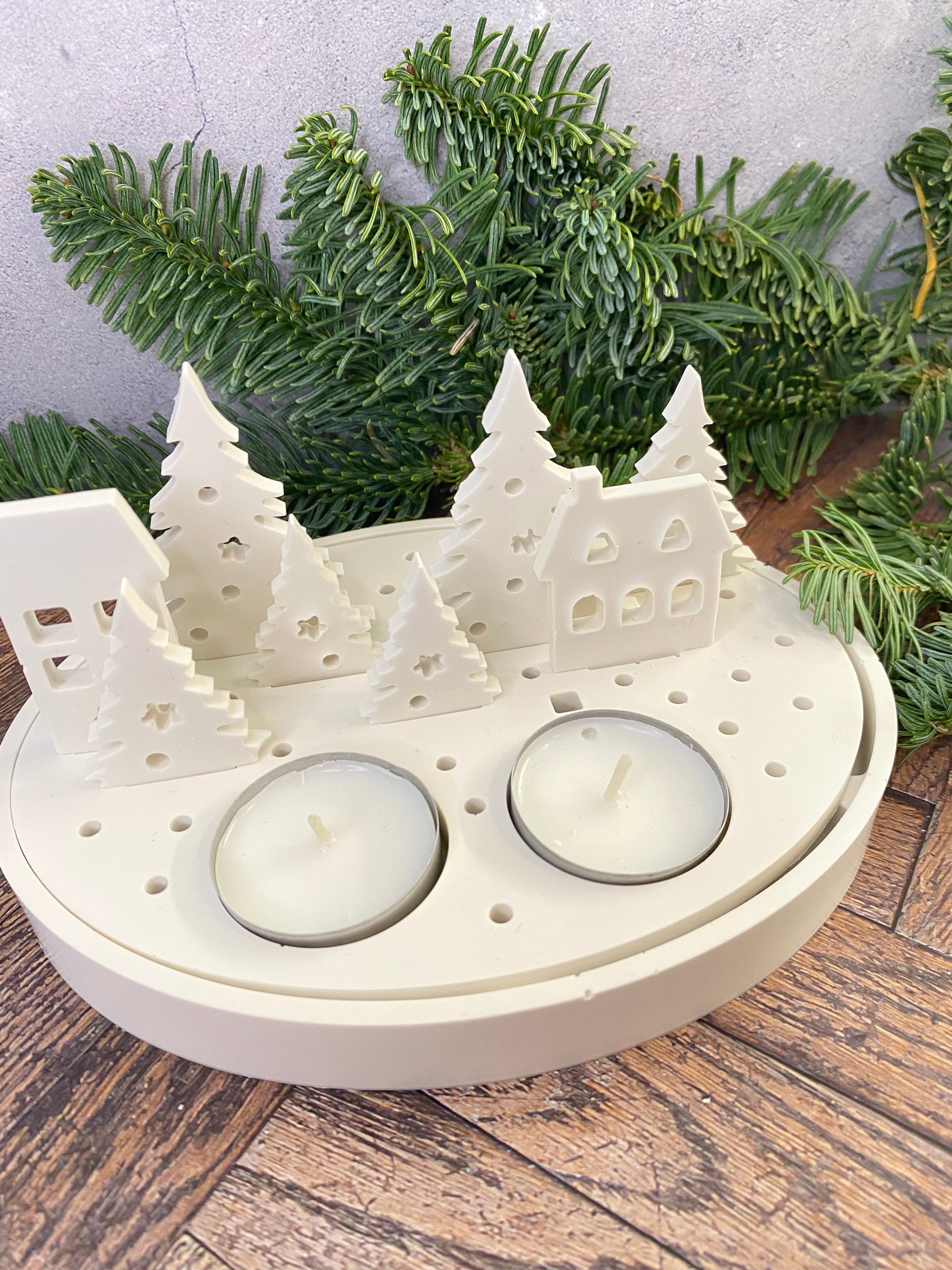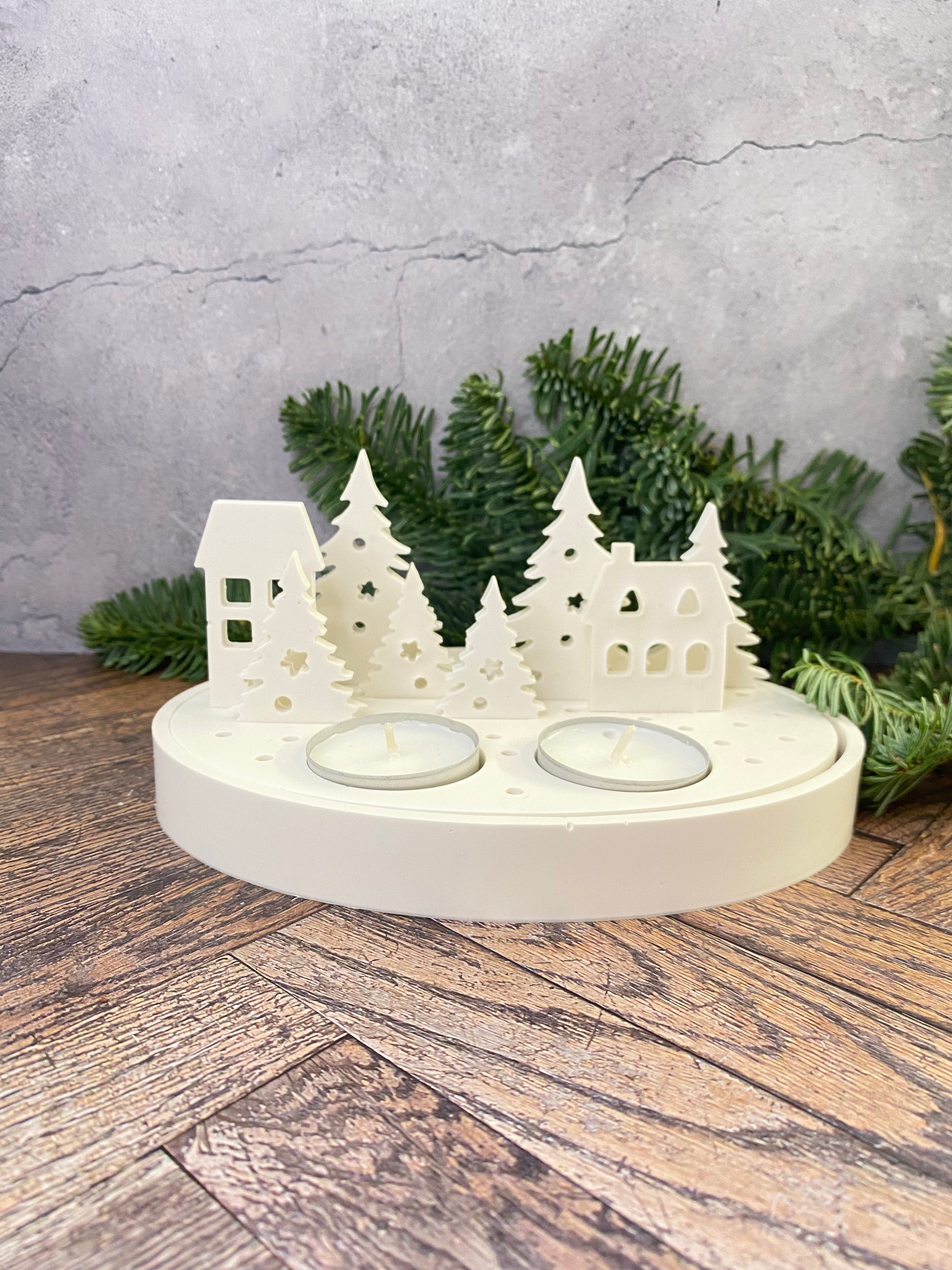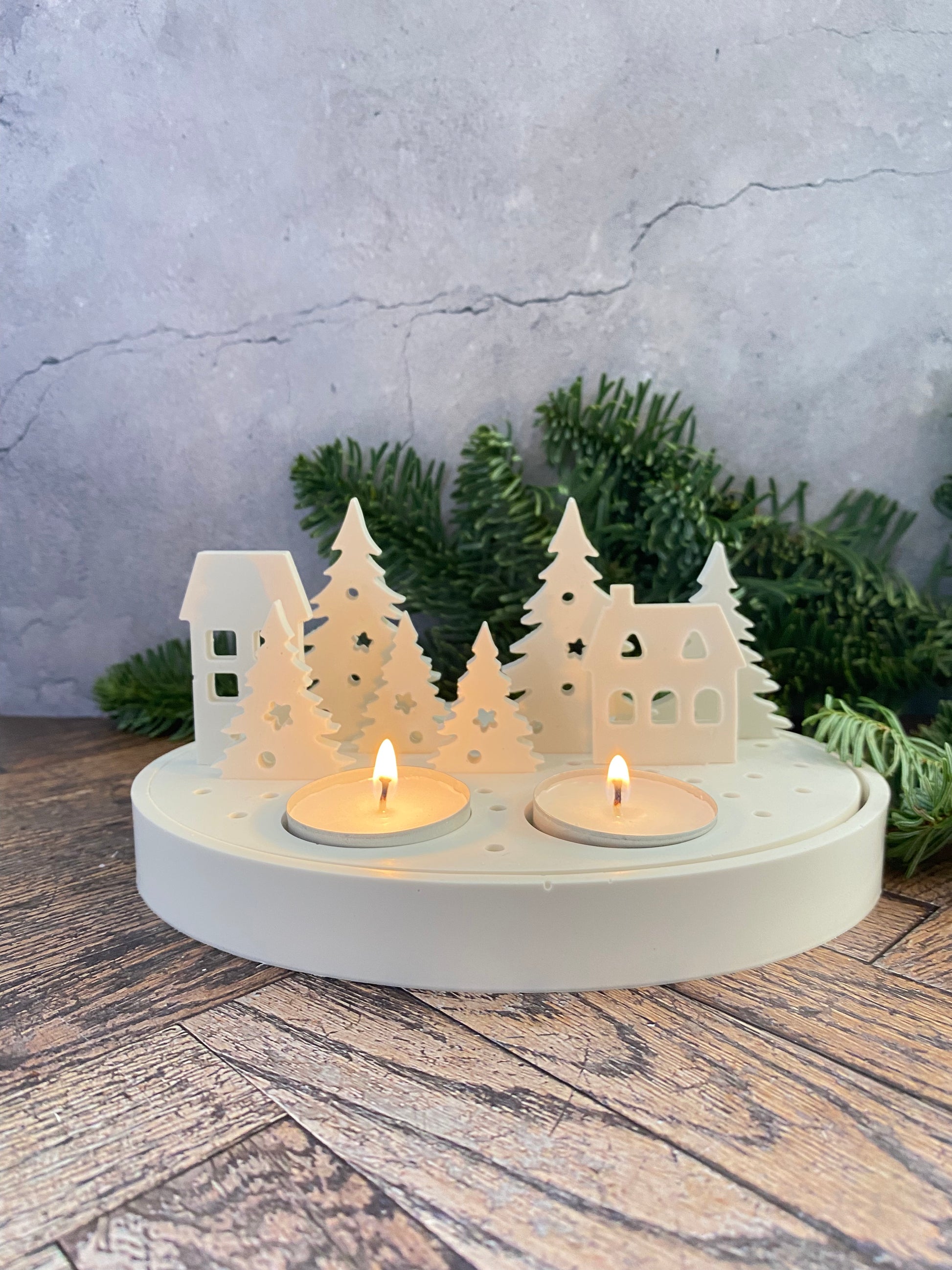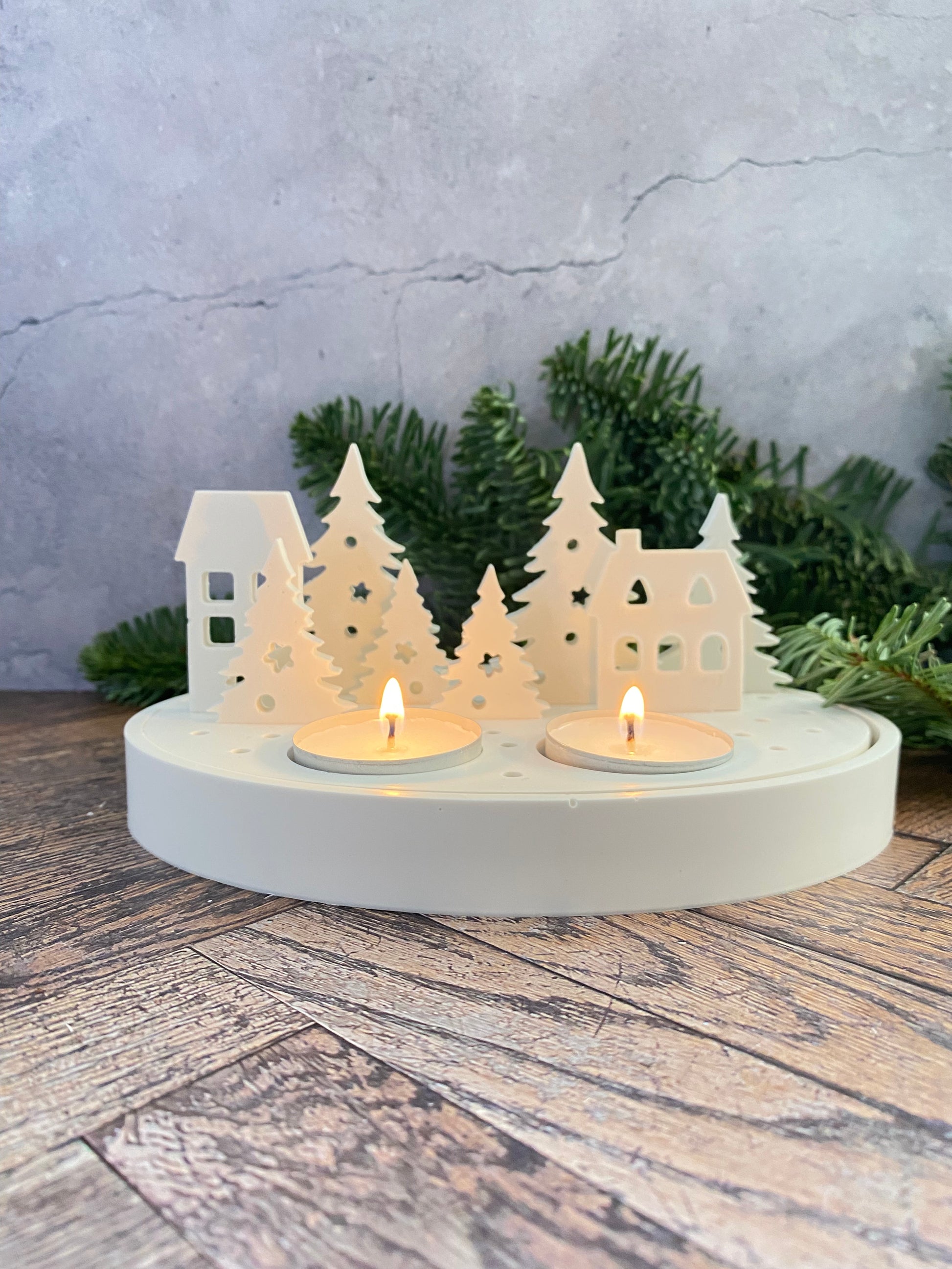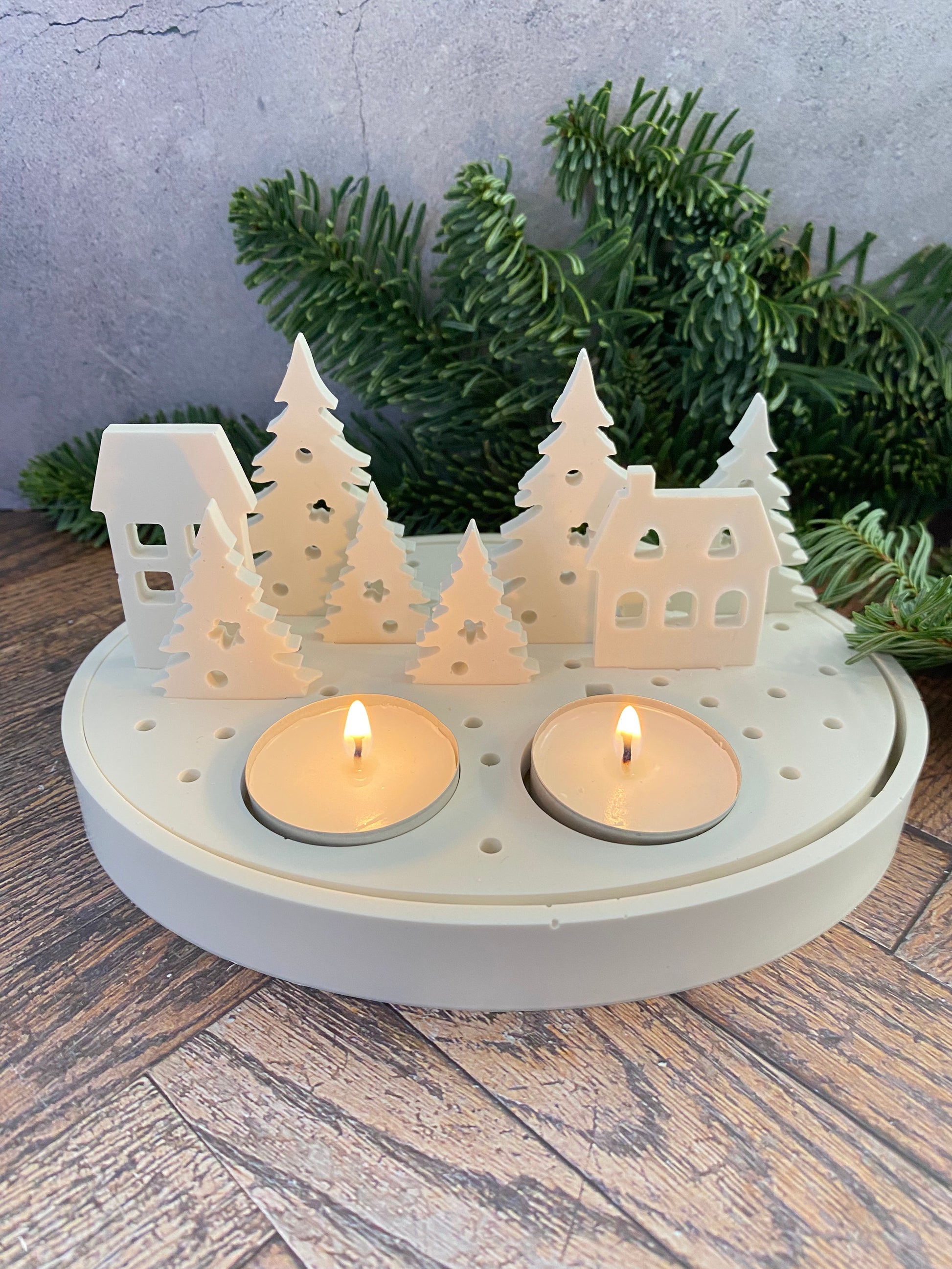 Handangefertigte Jesin Winterlandschaft – Weißes Deko Tablett mit 2 Teelichthaltern, 6 Tannenbäumen & 2 Häusern