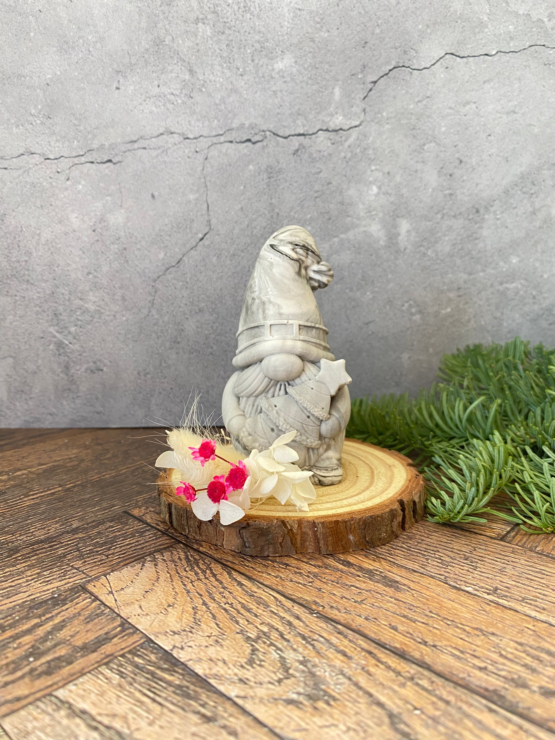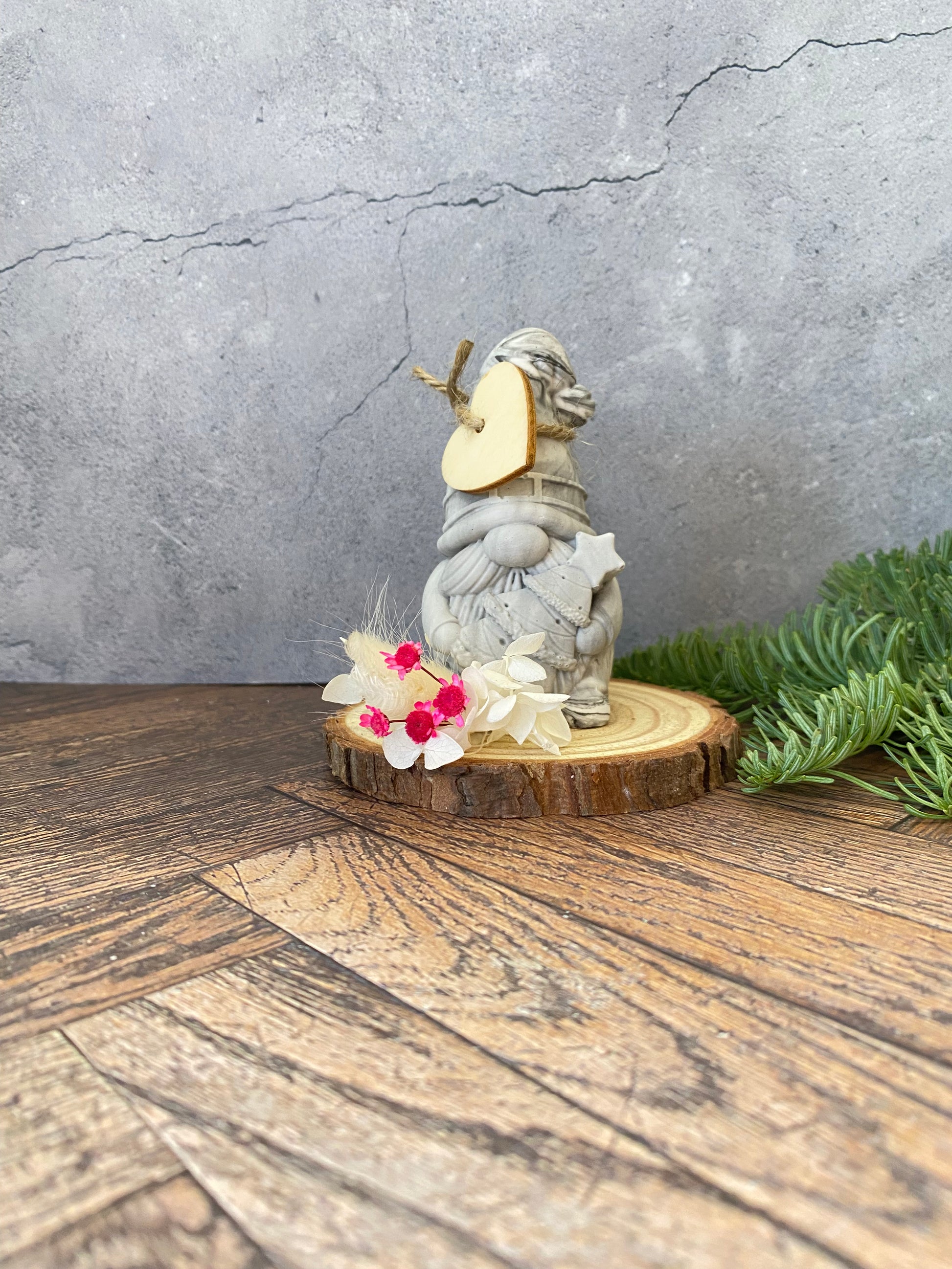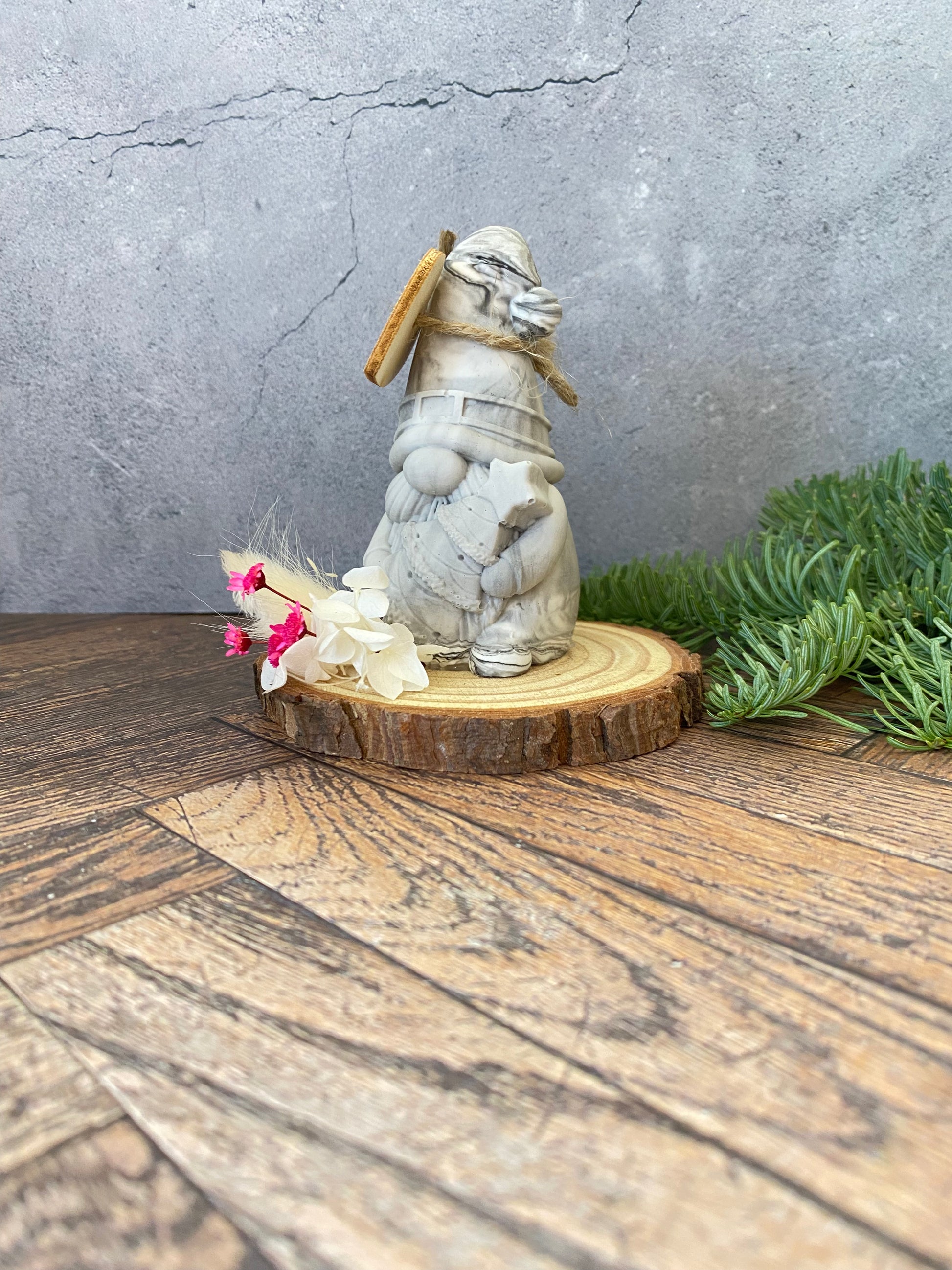 Dieser zauberhafte, handgefertigte Weihnachtsmann bringt sofort winterliche Gemütlichkeit in jedes Zuhause! Die kleine Statue besteht aus umweltfreundlichem, schadstofffreiem Jesin und wird sorgfältig auf einer natürlichen Holzscheibe (ca. 7–10 cm) präsentiert. Ergänzt wird das Ganze durch eine feine Dekoration aus liebevoll arrangierten Trockenblumen – ein echter Hingucker in jeder Weihnachtsdekoration.