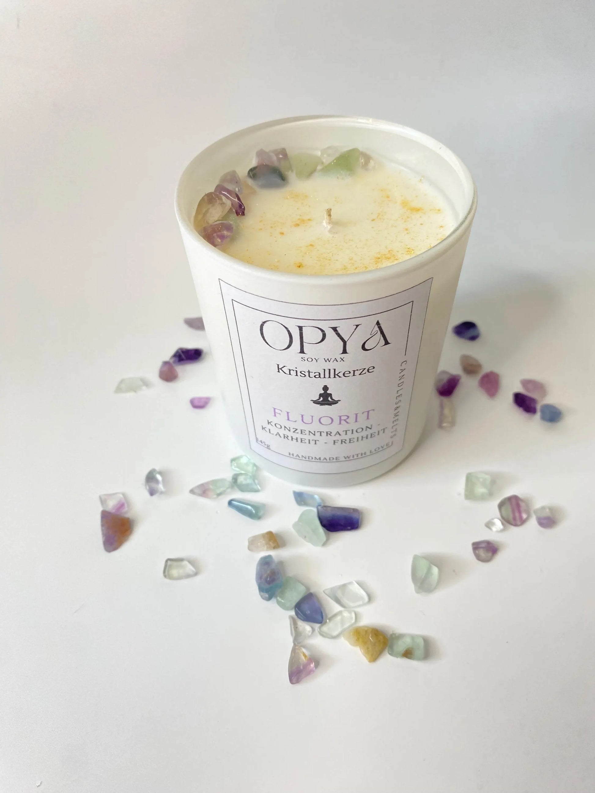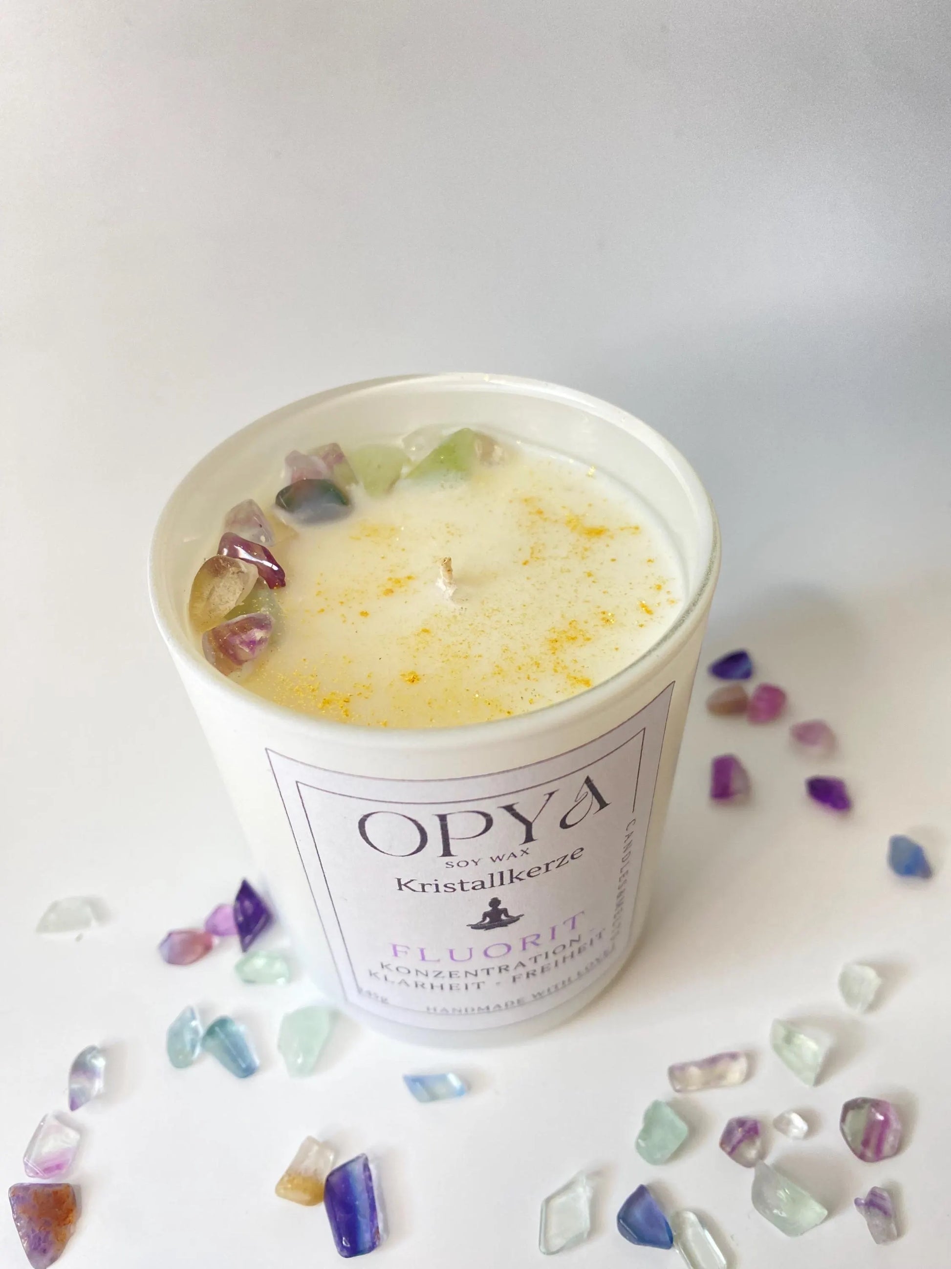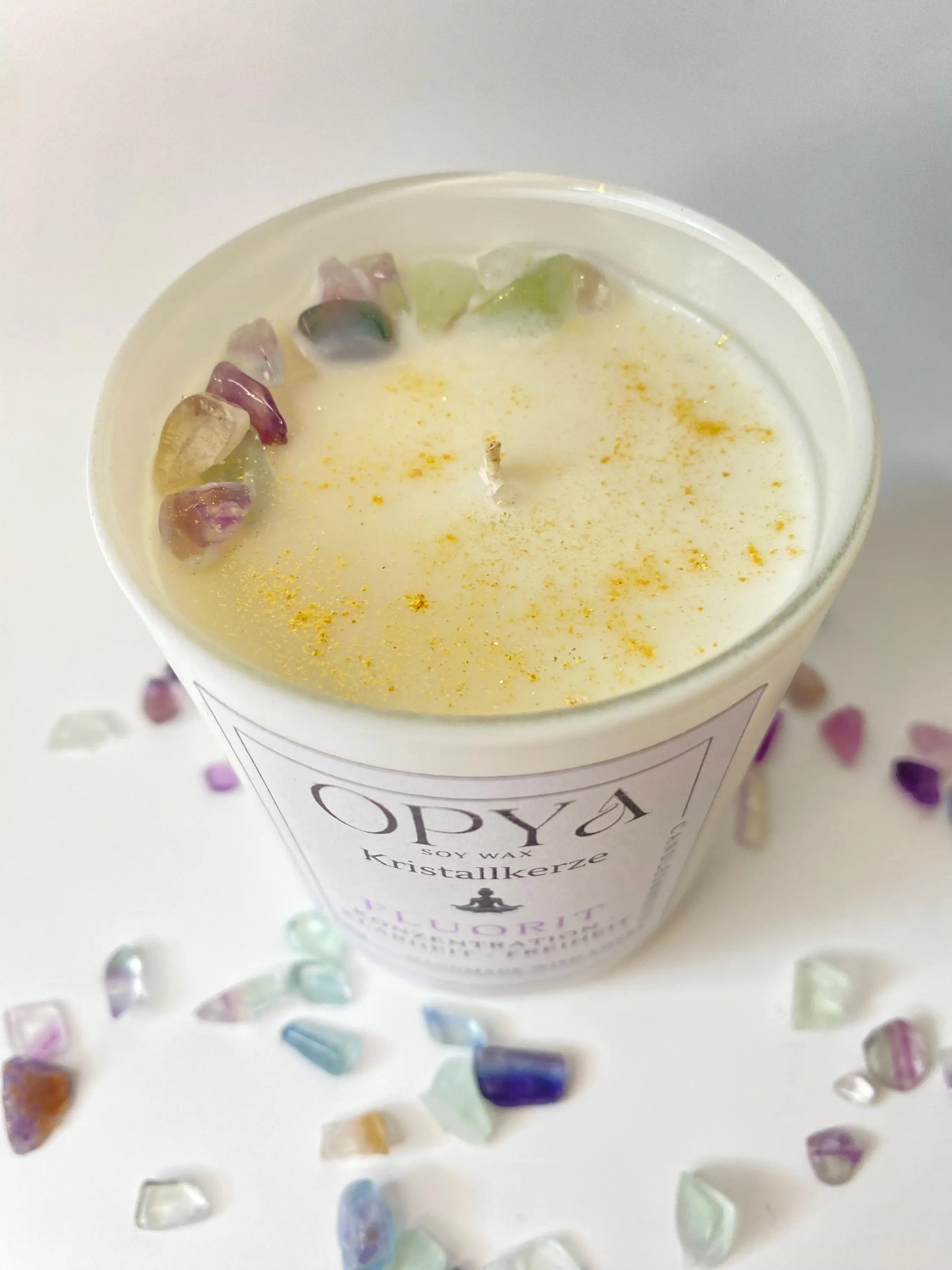 Handgegossen aus 100 % natürlichem Sojawachs, veredelt mit echtem Regenbogenfluorit und goldenem Glitzer. Der Fluorit steht für geistige Klarheit, Schutz, Inspiration und inneres Gleichgewicht – ideal für Meditation, energetische Reinigung oder als besonderes Geschenk.
