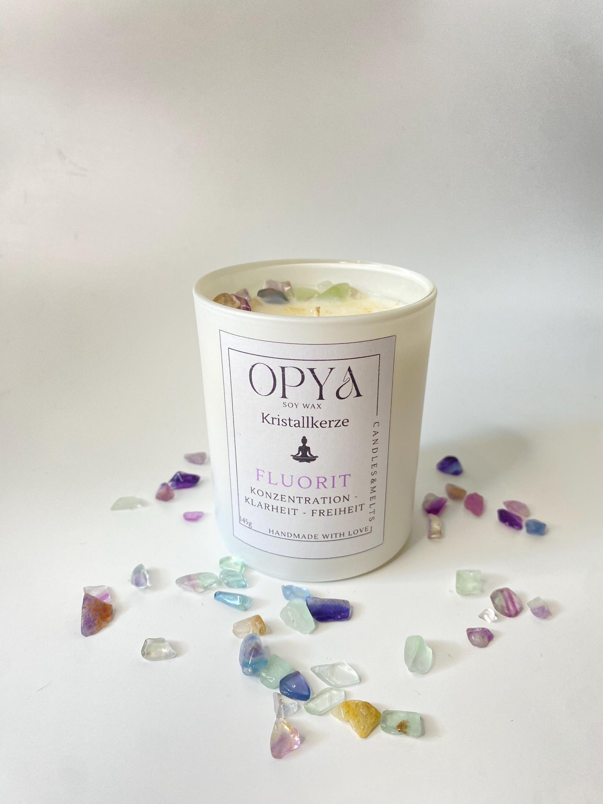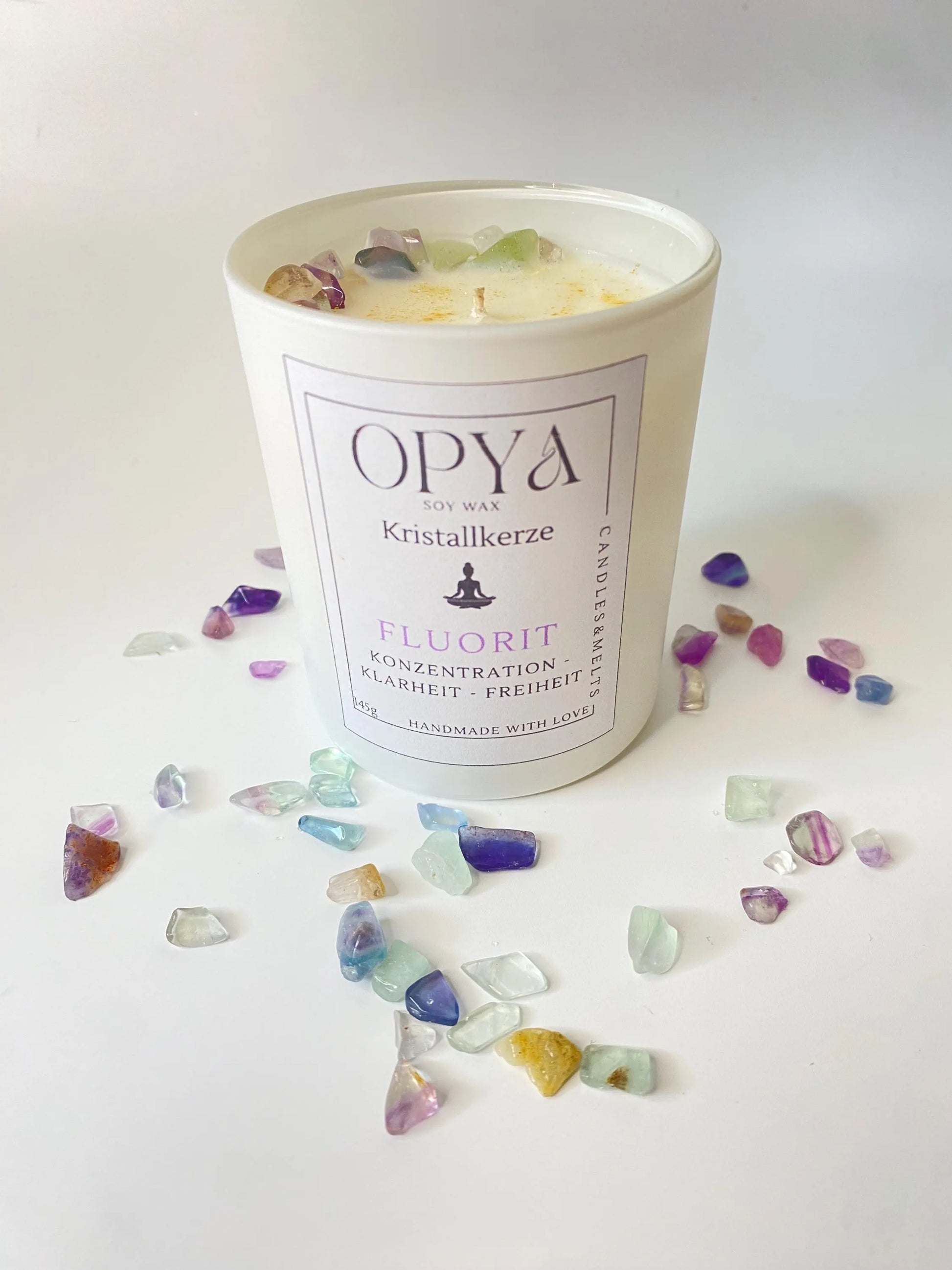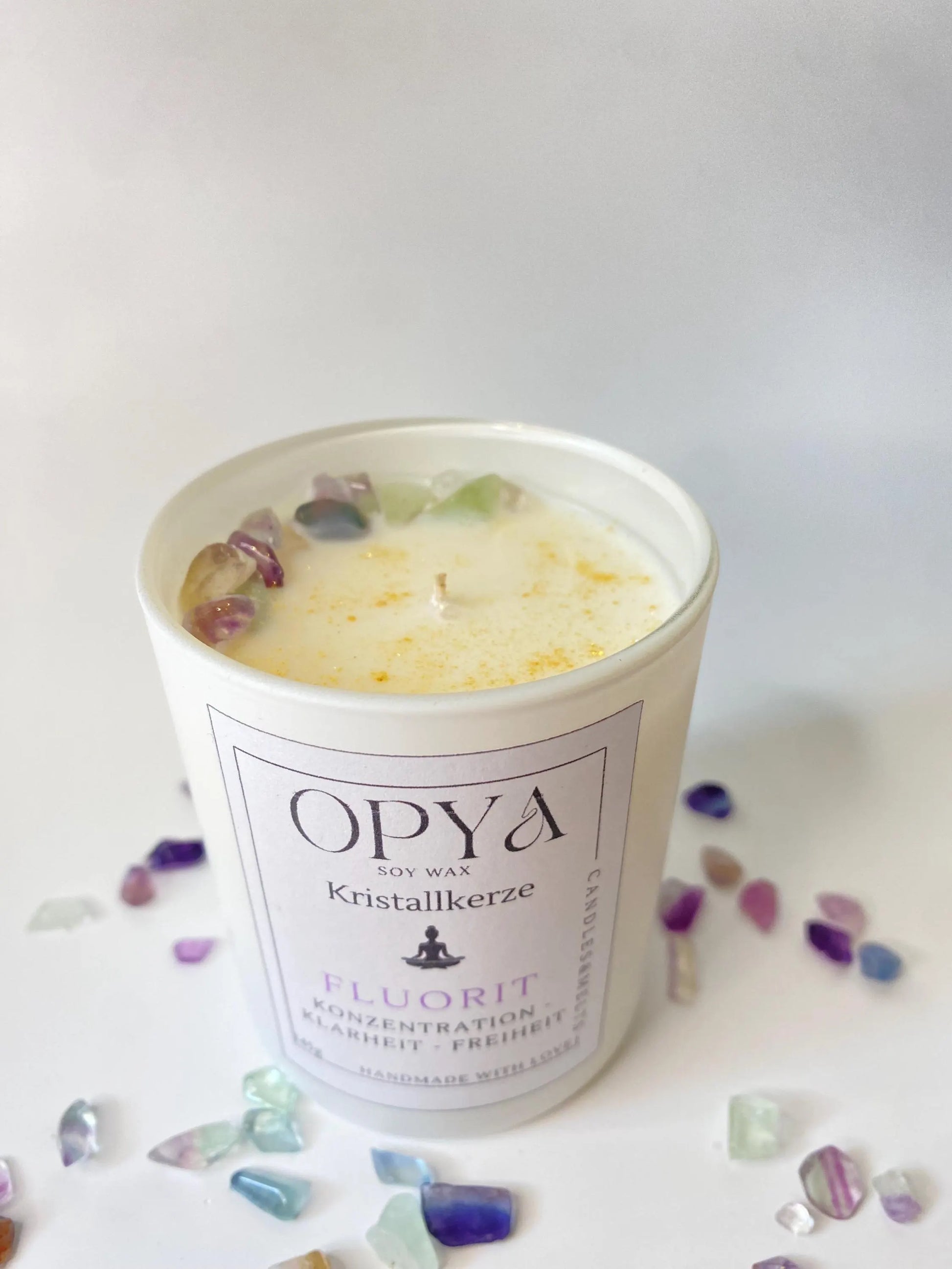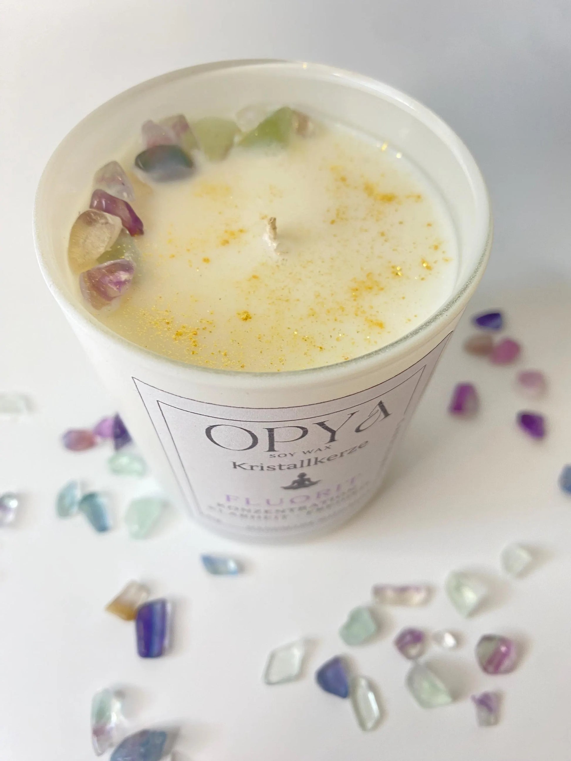 Handgegossen aus 100 % natürlichem Sojawachs, veredelt mit echtem Regenbogenfluorit und goldenem Glitzer. Der Fluorit steht für geistige Klarheit, Schutz, Inspiration und inneres Gleichgewicht – ideal für Meditation, energetische Reinigung oder als besonderes Geschenk.