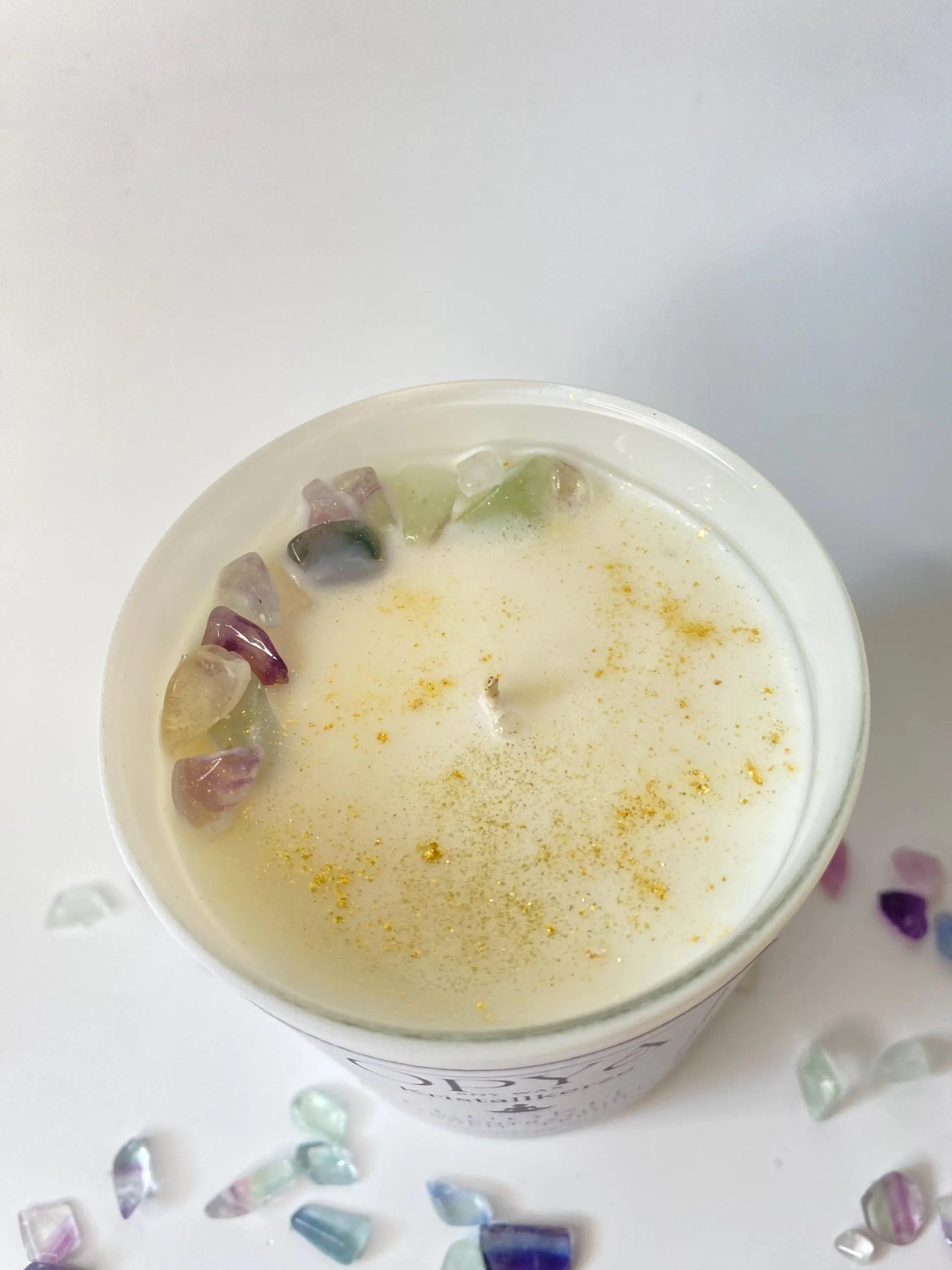 Kristall-Duft-Kerze mit Regenbogenfluorit-Kristallen