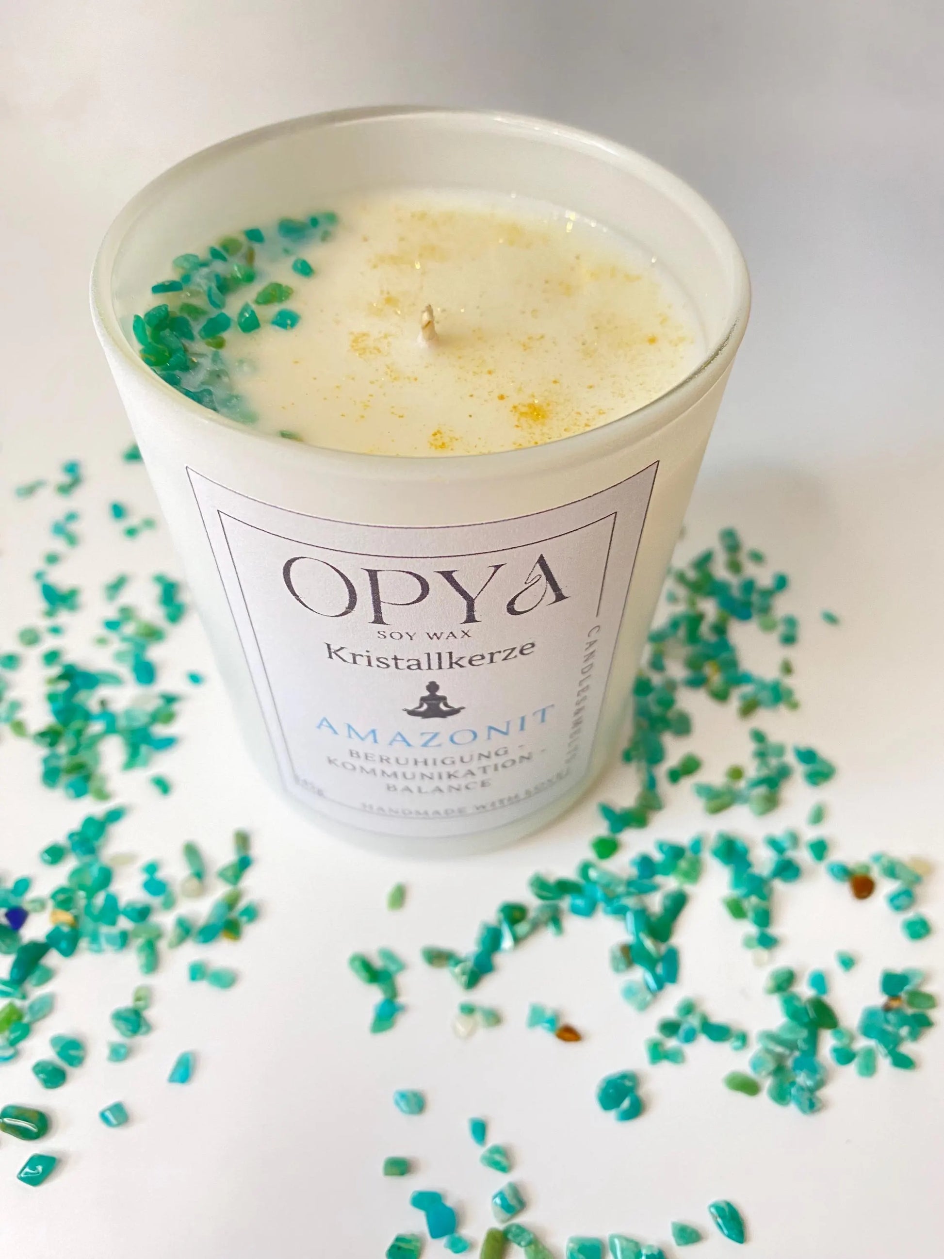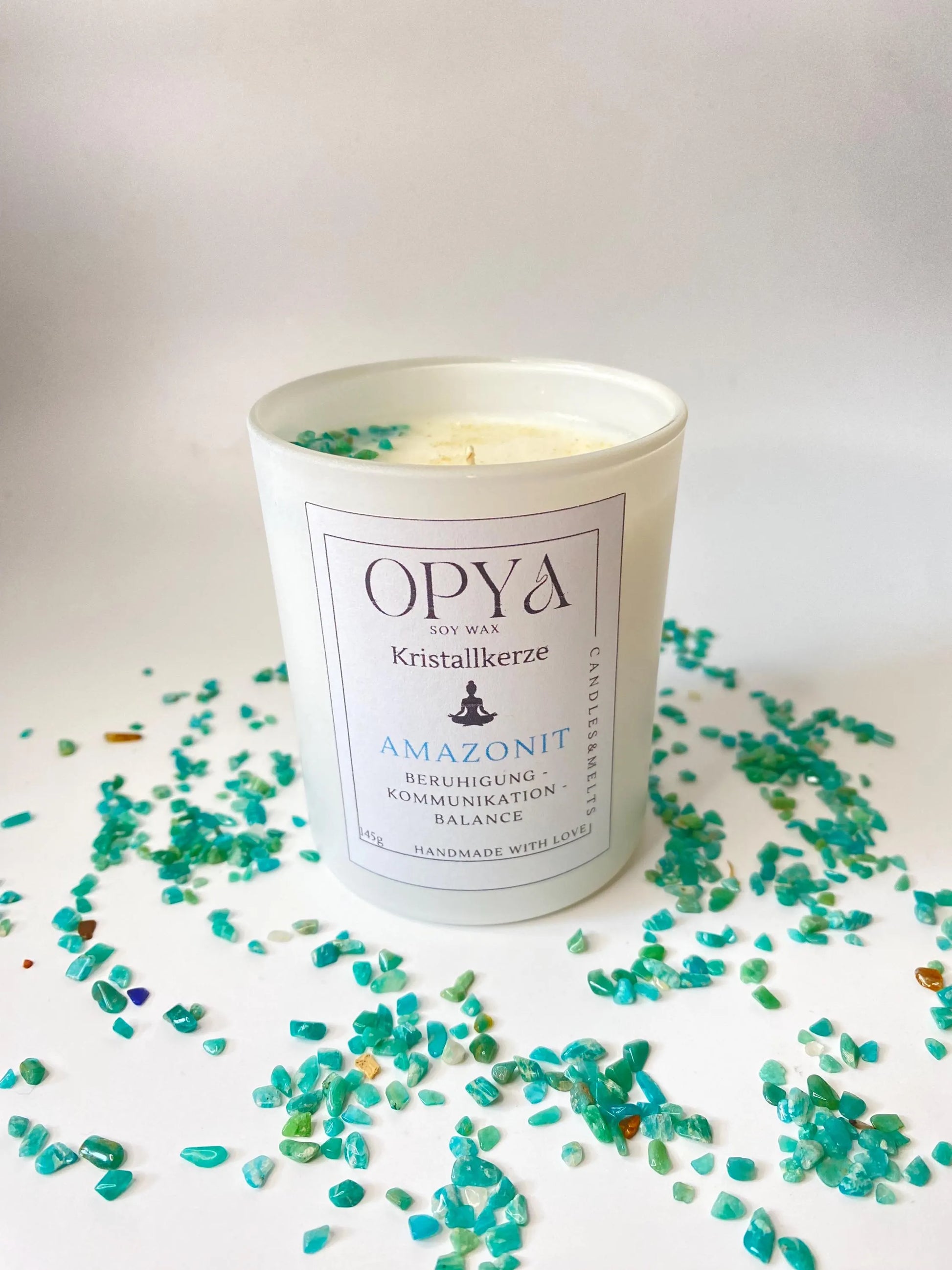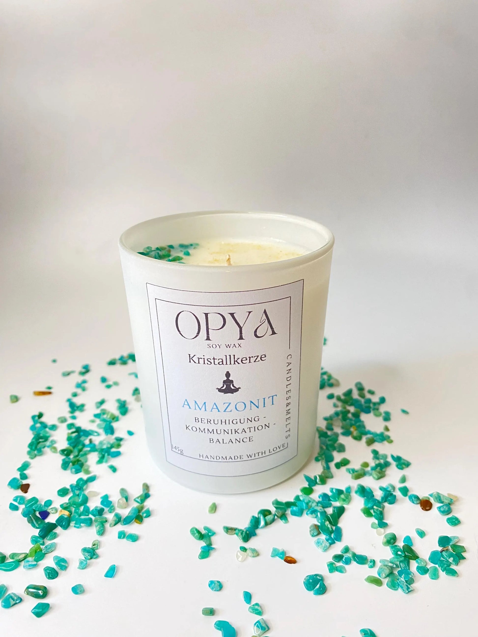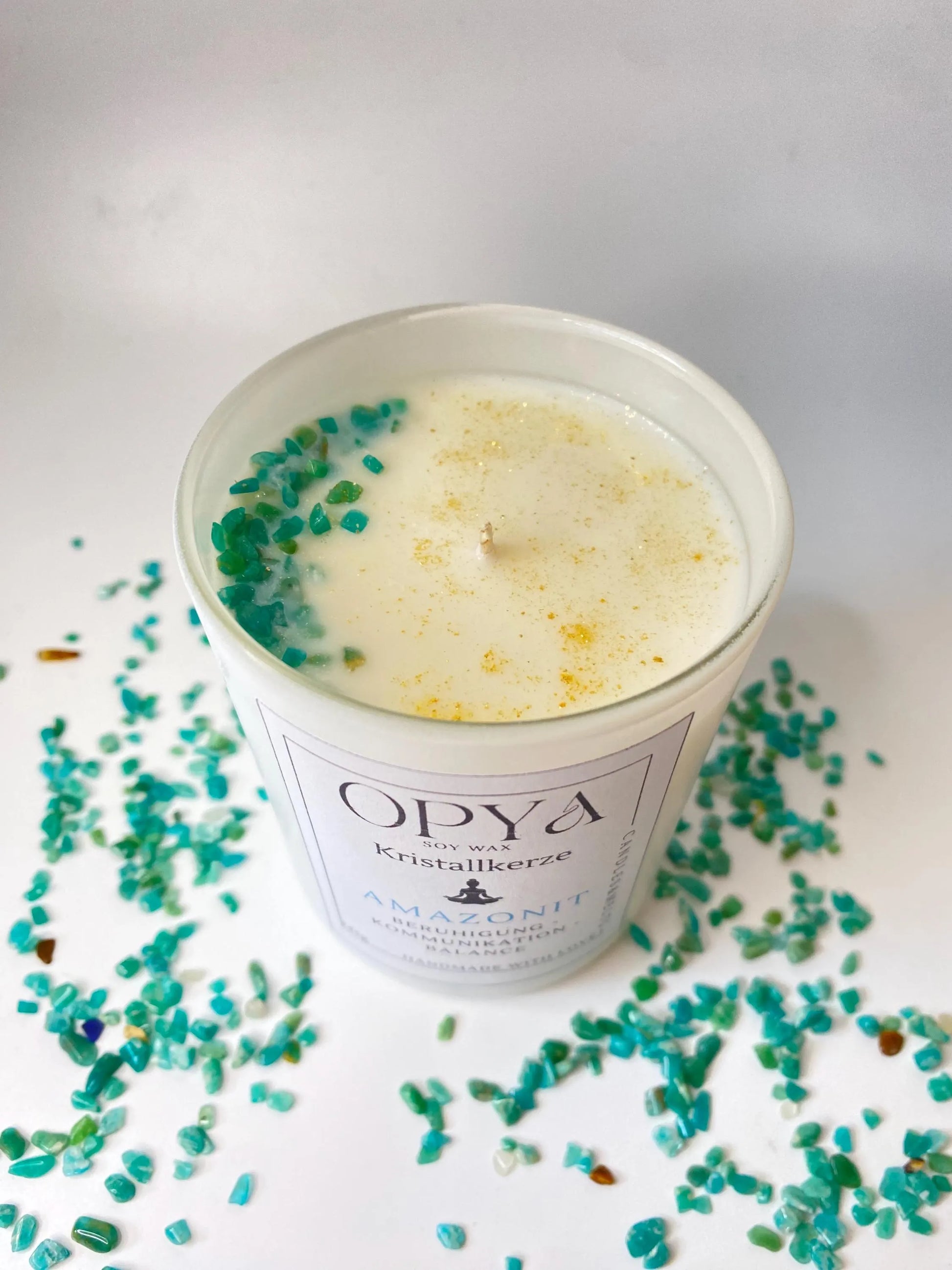 Kristallkerze mit Amazonit – Heilstein Kerze für Seelenfrieden & Herzöffnung