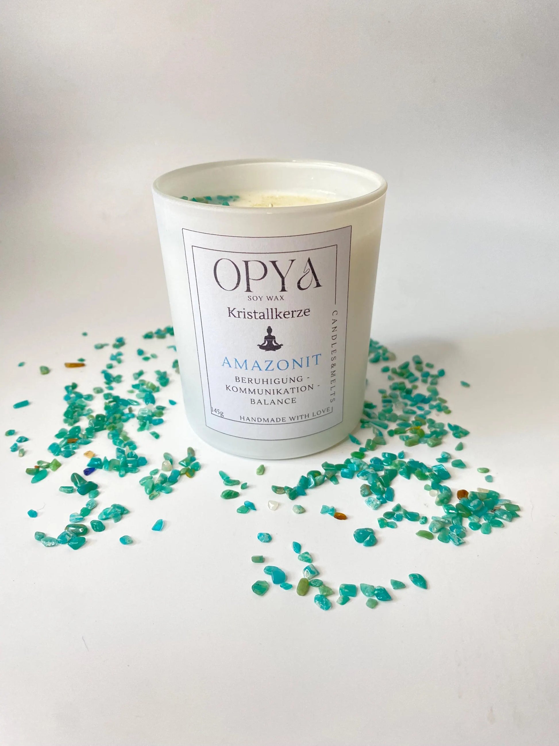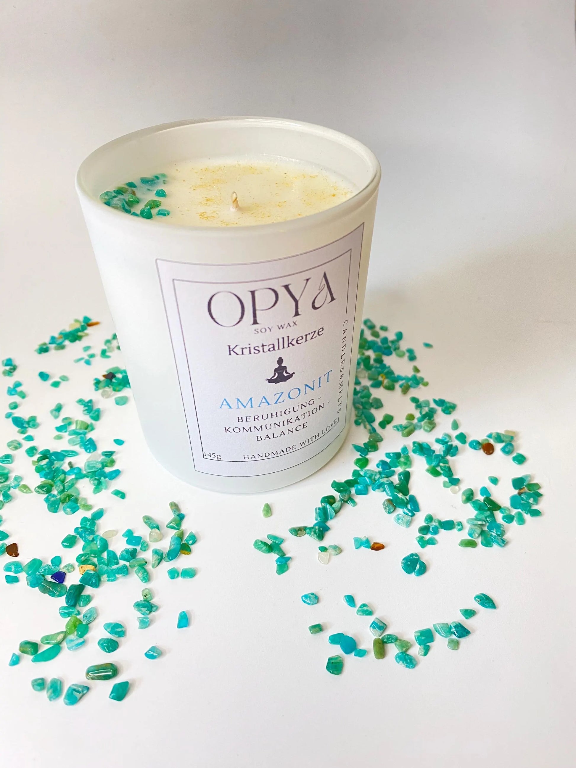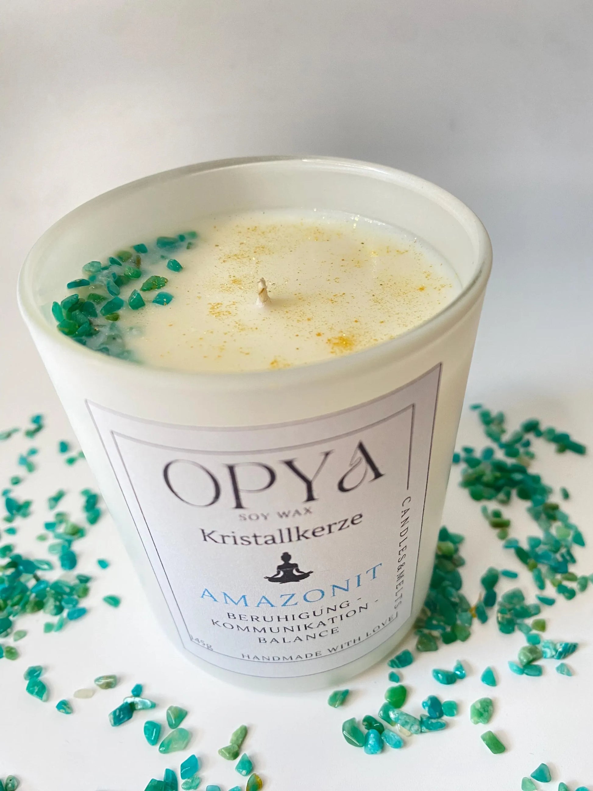 Diese handgegossene Kristallkerze aus 100 % naturreinem Sojawachs ist mit echten Amazonit-Steinen veredelt. Der Heilstein steht für innere Ruhe, Herzöffnung und klare Kommunikation. Ob für Meditation, Rituale oder als besonderes Geschenk – diese spirituelle Kerze schafft eine harmonische Atmosphäre und unterstützt dich dabei, dein energetisches Gleichgewicht zu finden.