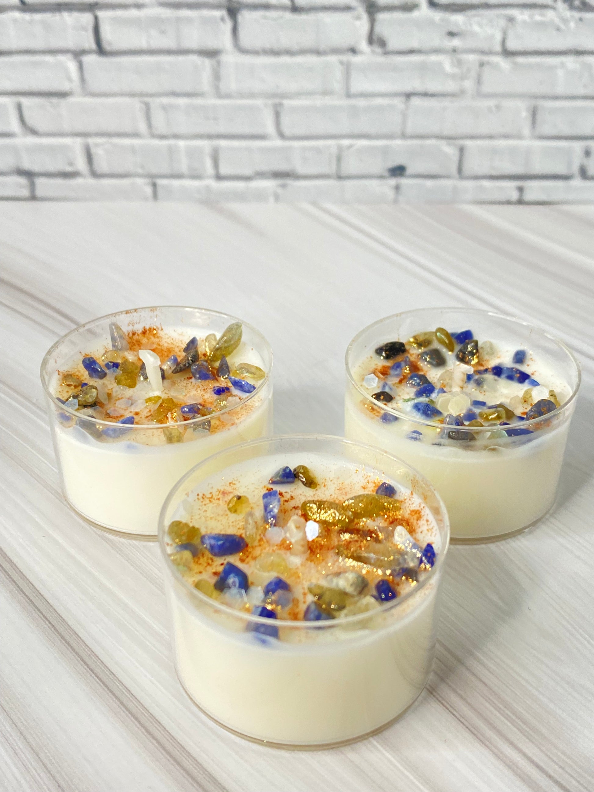 Kristall-Teelicht-Set - mit Labradorit, Opalit & Sodalit Kristallen, handgegossen aus reinem Sojawachs