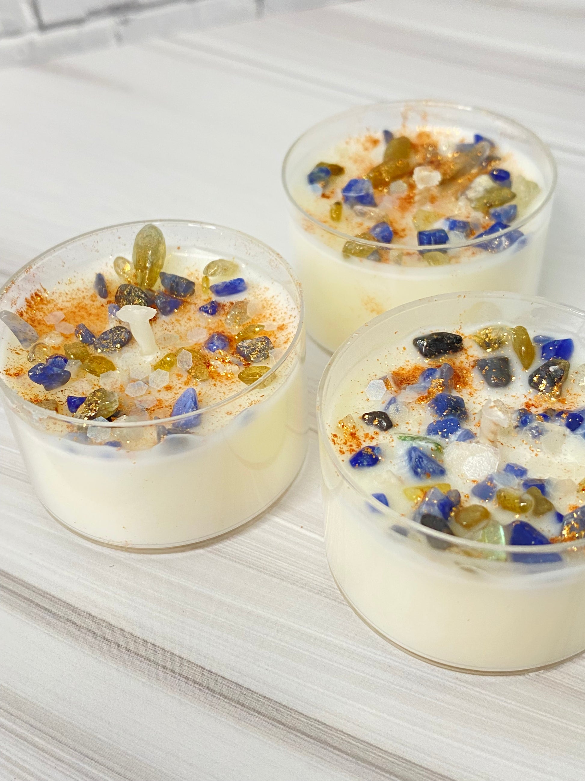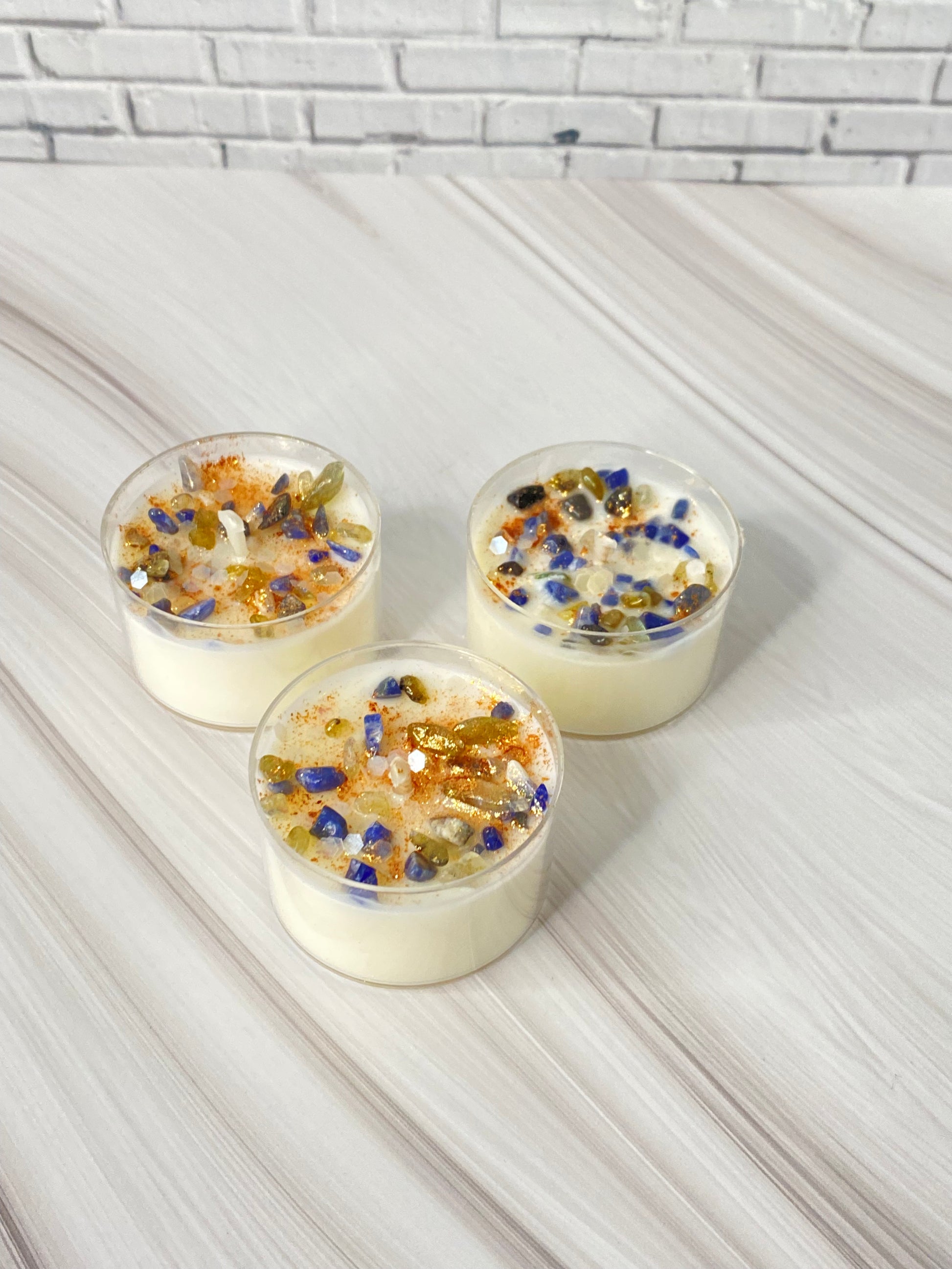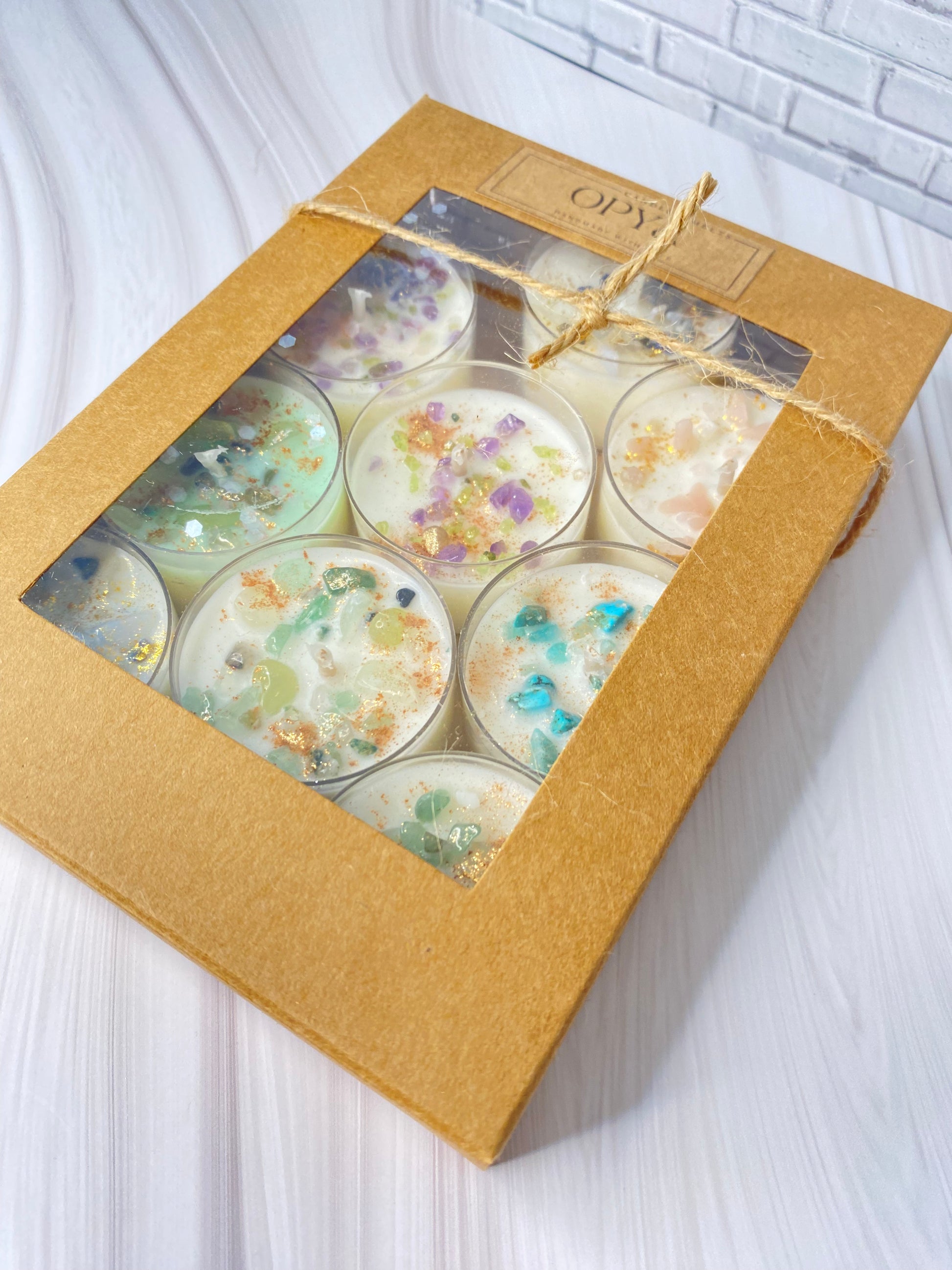 Bringe sanftes Licht und magische Energie in dein Zuhause mit unserem liebevoll handgegossenen Kristall-Teelicht-Setaus 100 % rein natĂĽrlichem Sojawachs.