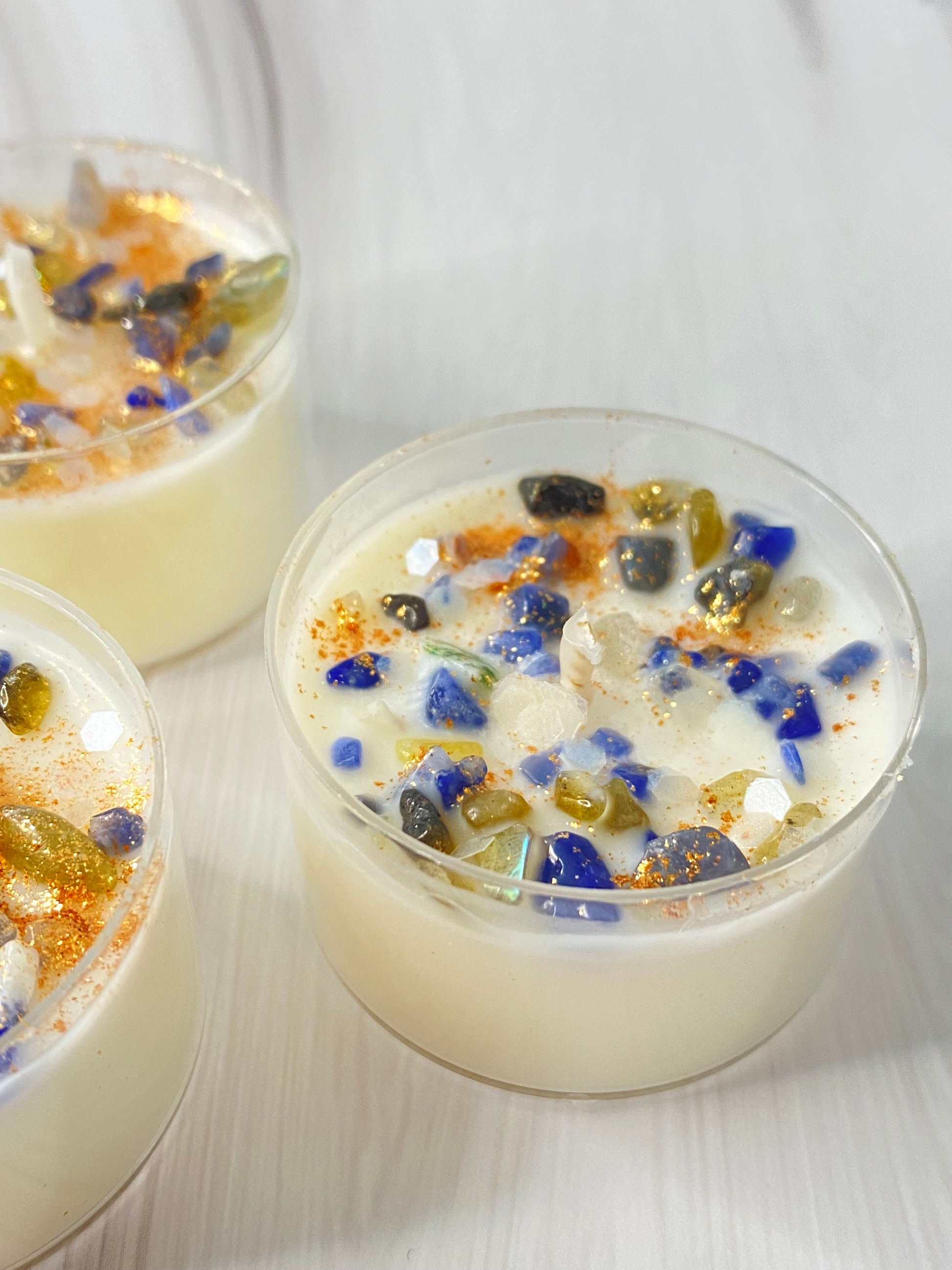 Jedes Teelicht wird einzeln gefertigt und mit einer harmonischen Kombination aus drei kraftvollen Edelsteinen versehen: