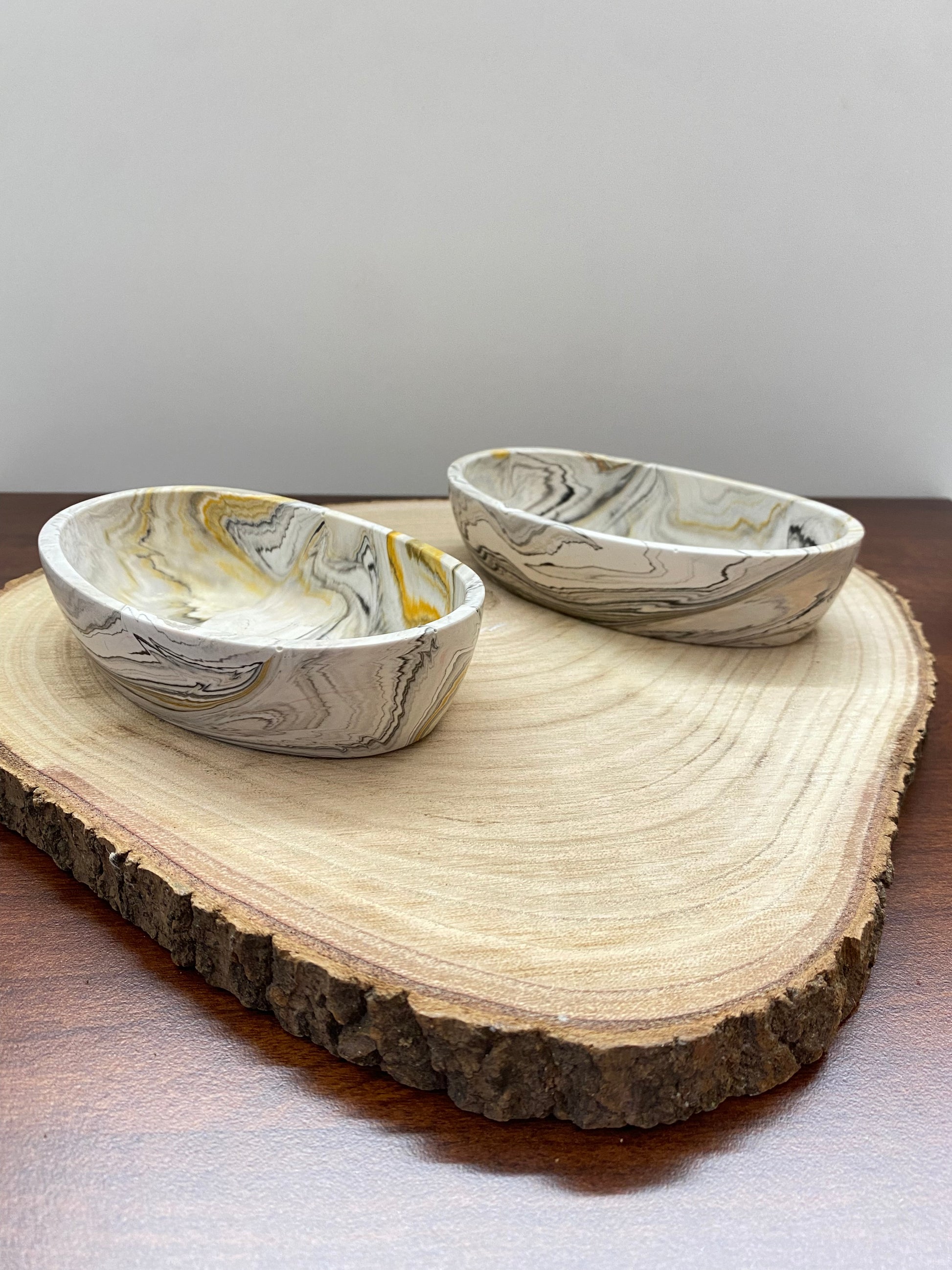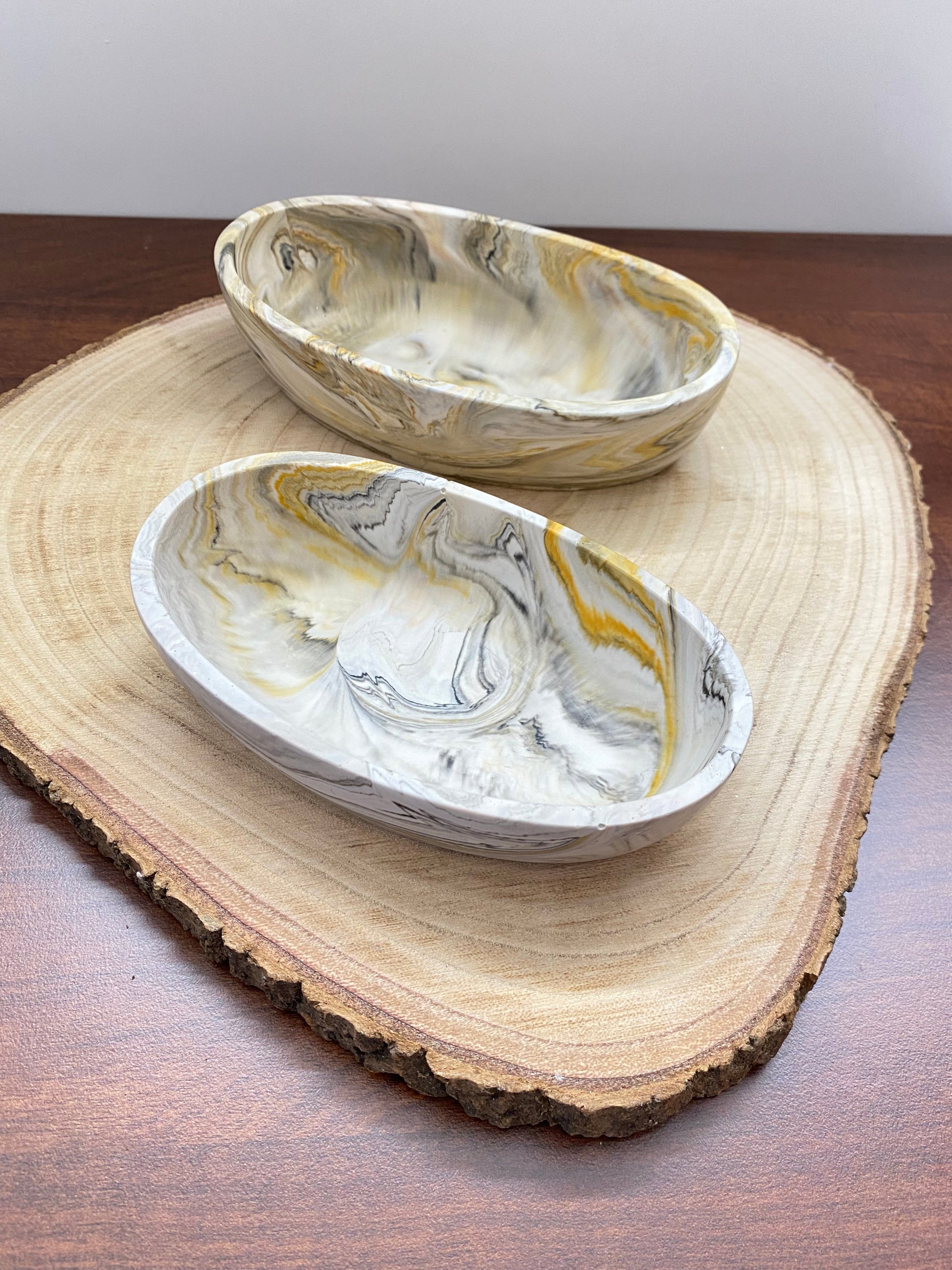 Diese handgegossene ovale Schale aus Jesin vereint ruhige Formen mit einer einzigartigen Maserung. Jede Schale entsteht einzeln im Gießprozess und erhält dadurch ihren individuellen Farbverlauf.