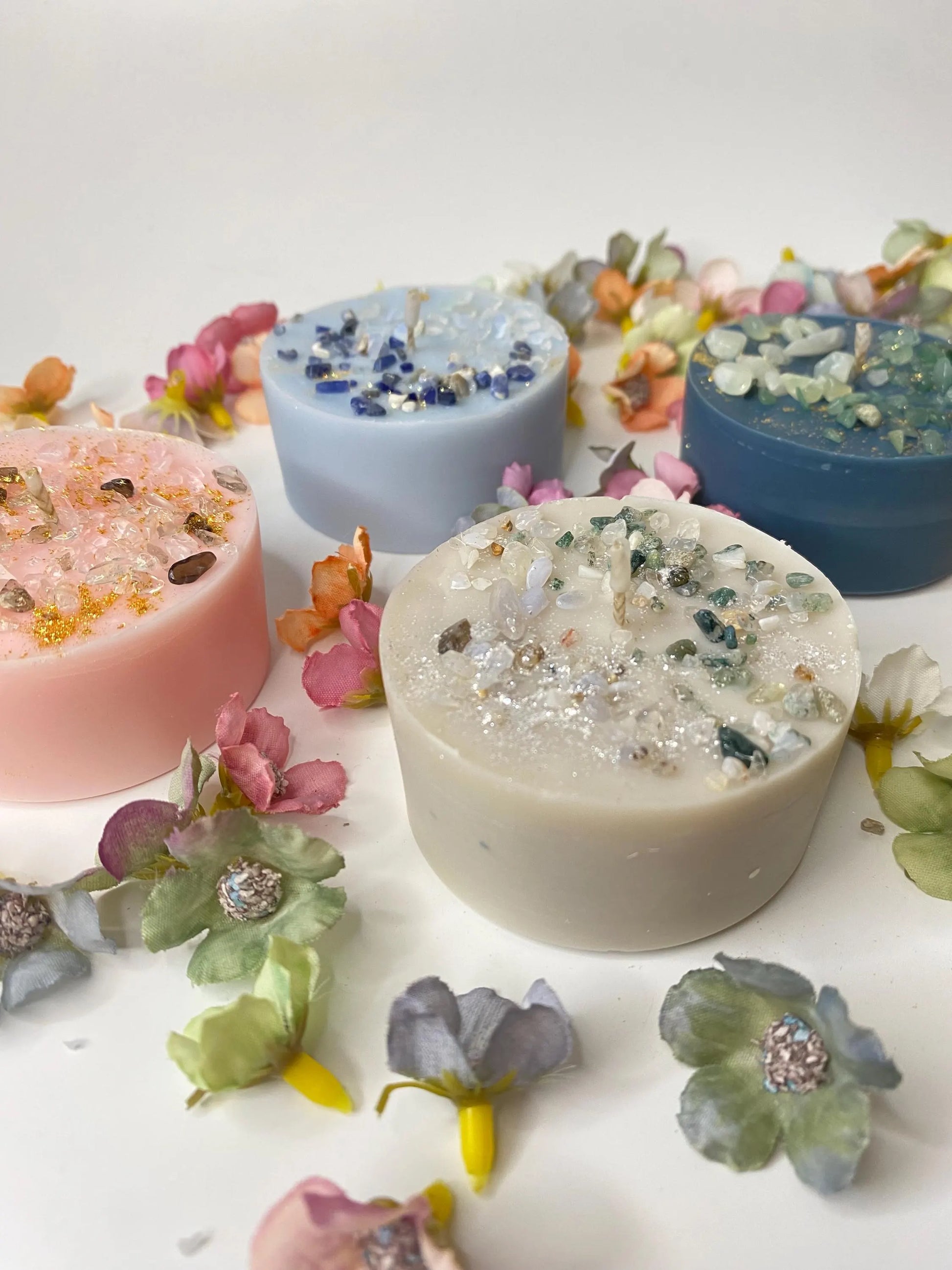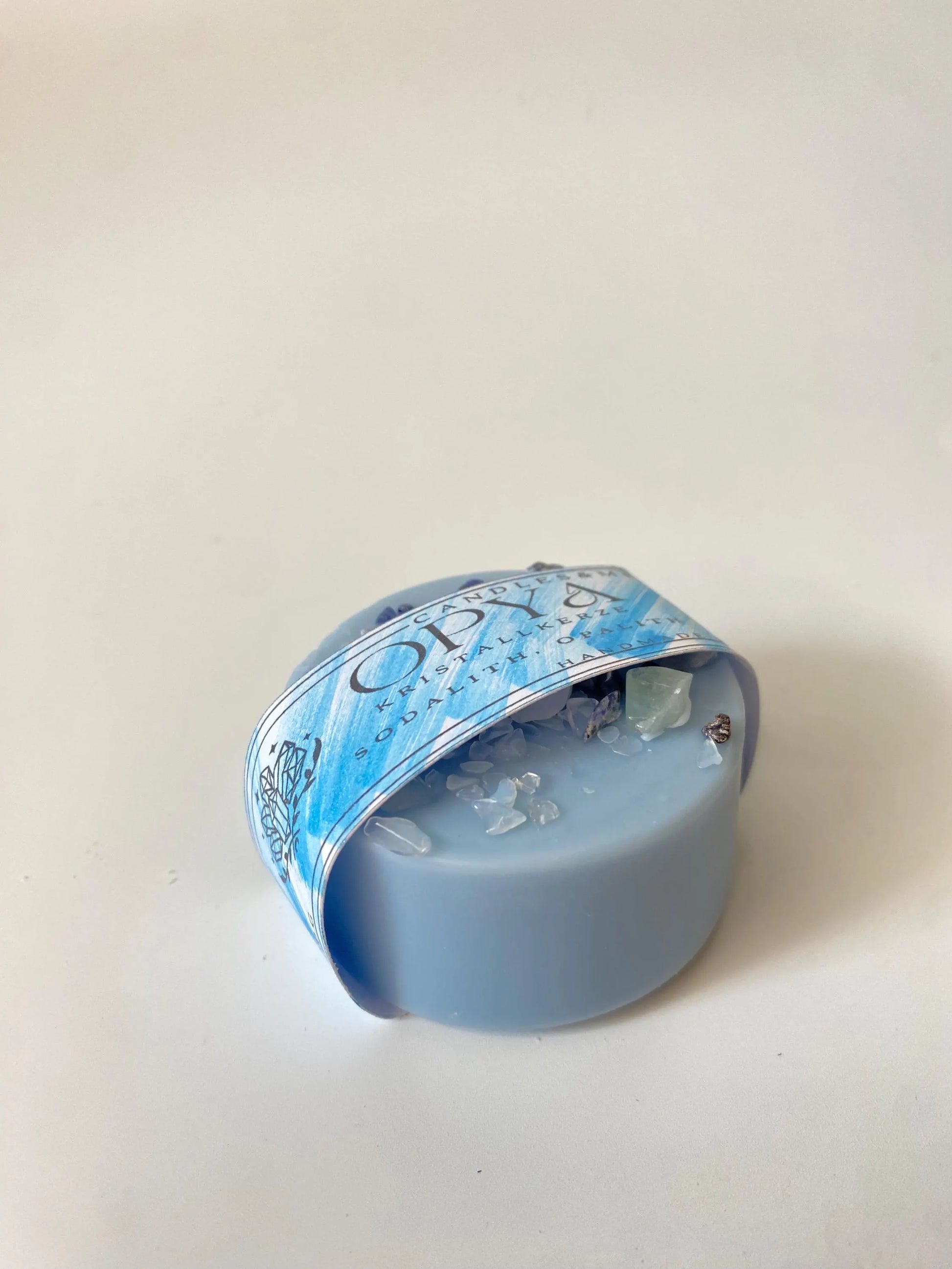 Tauche ein in die magische Welt der Kristalle und Düfte mit dieser liebevoll handgegossenen Ritualkerze. Veredelt mit Sodalith, Opalit und Fluorit Kristallen vereint sie energetische Reinigung mit ästhetischer Schönheit. Der zarte, blumig-frische Duft „Jasmin Lilac“ erfüllt den Raum mit Leichtigkeit und Harmonie.