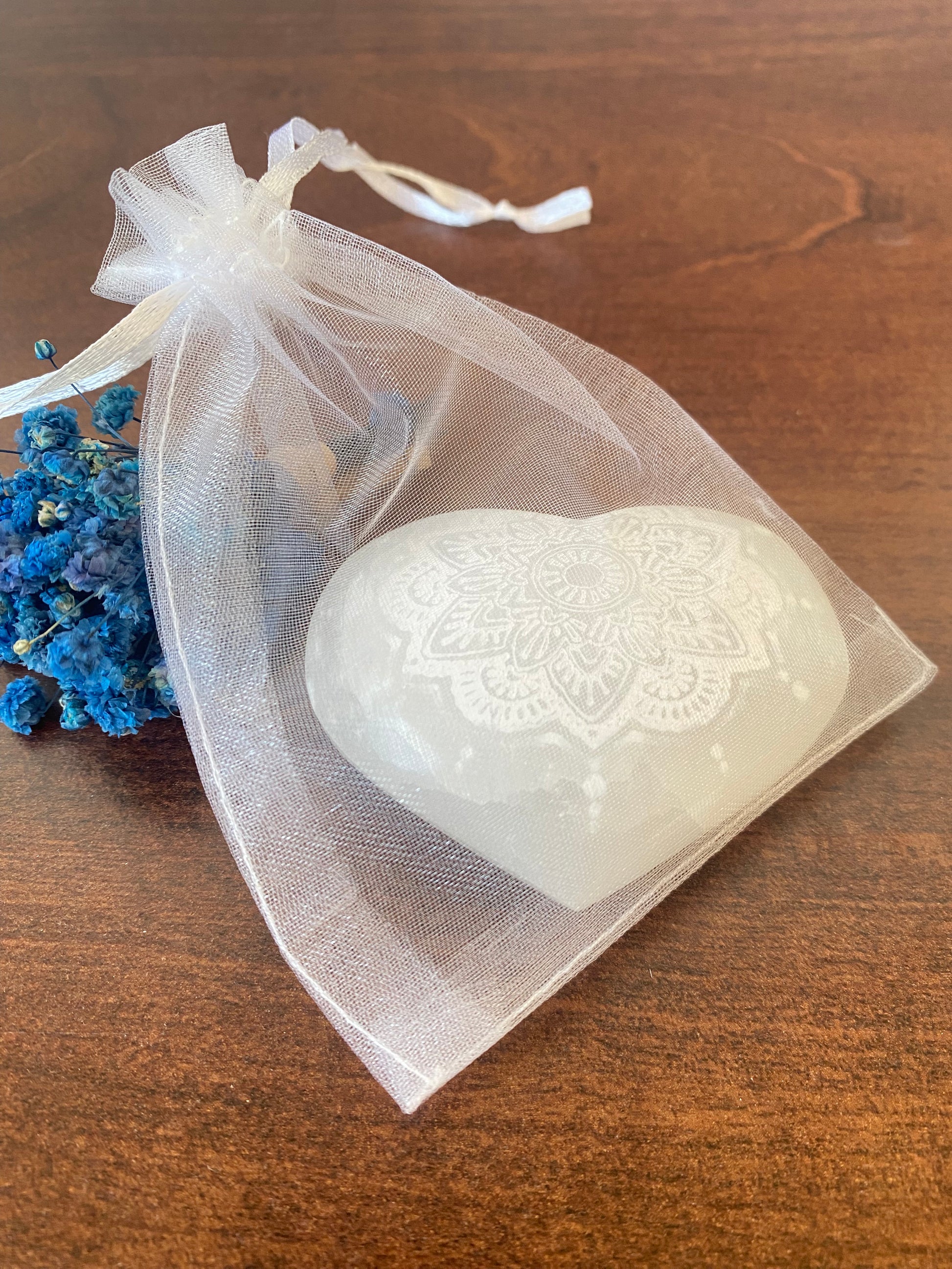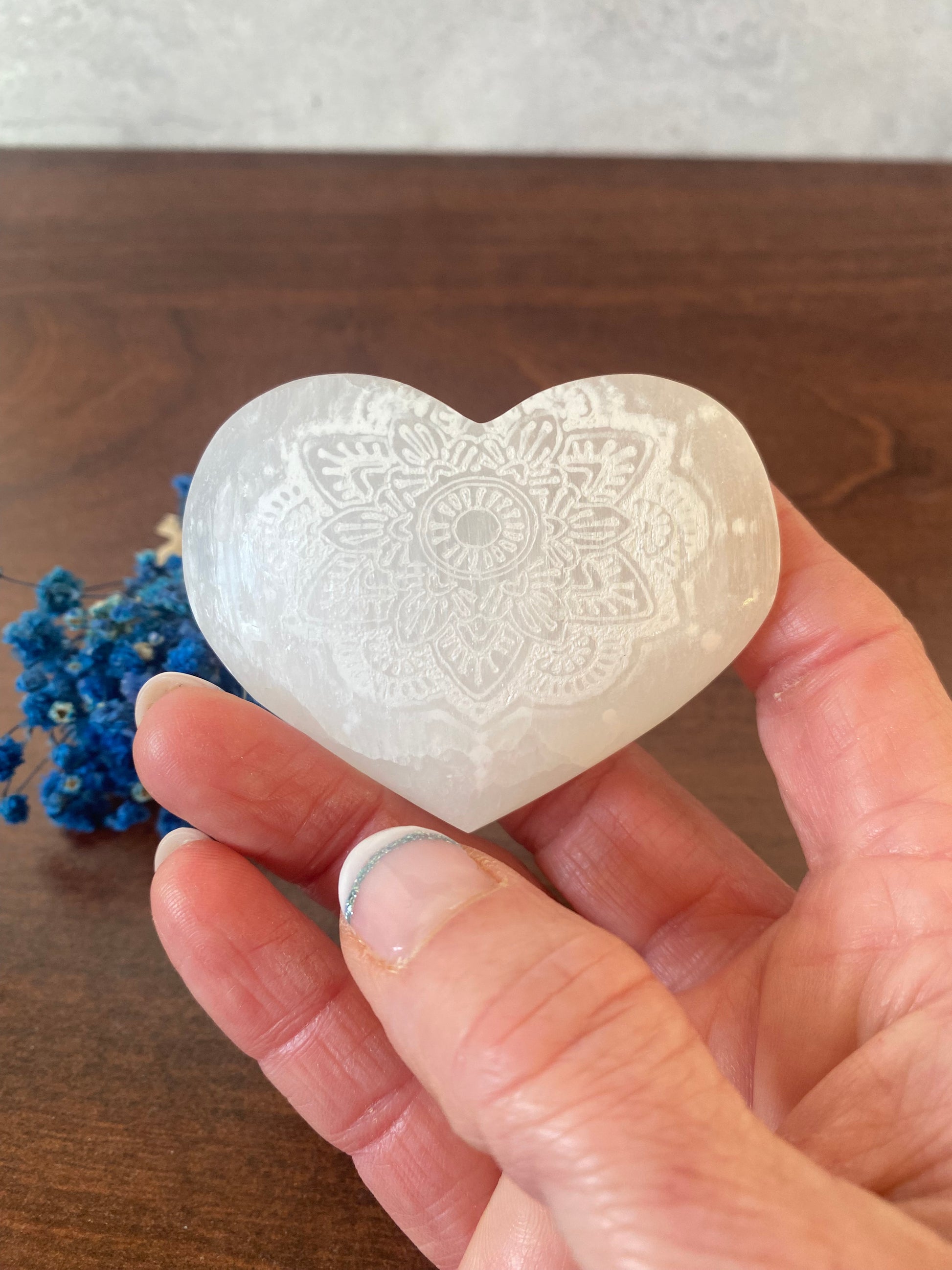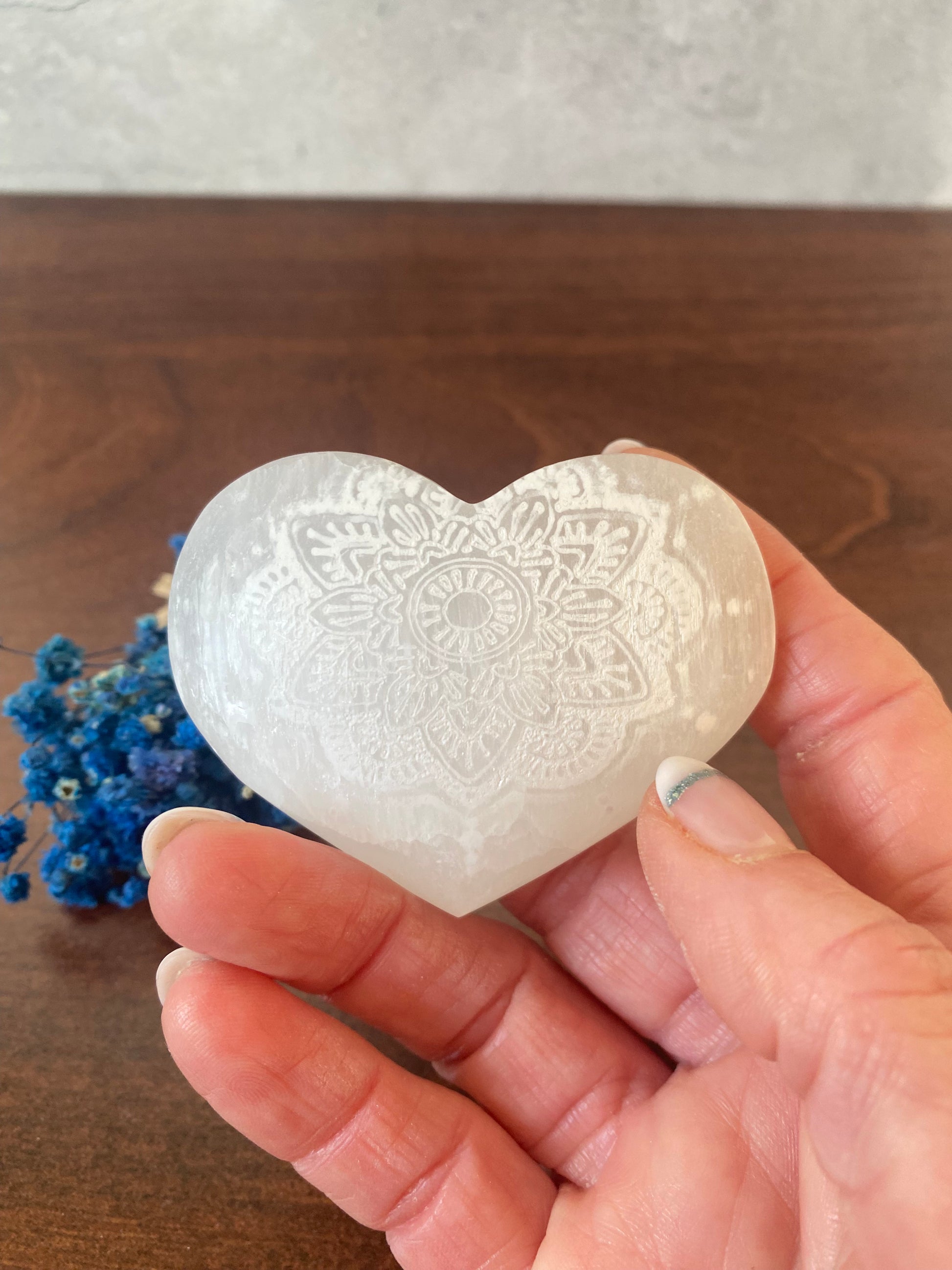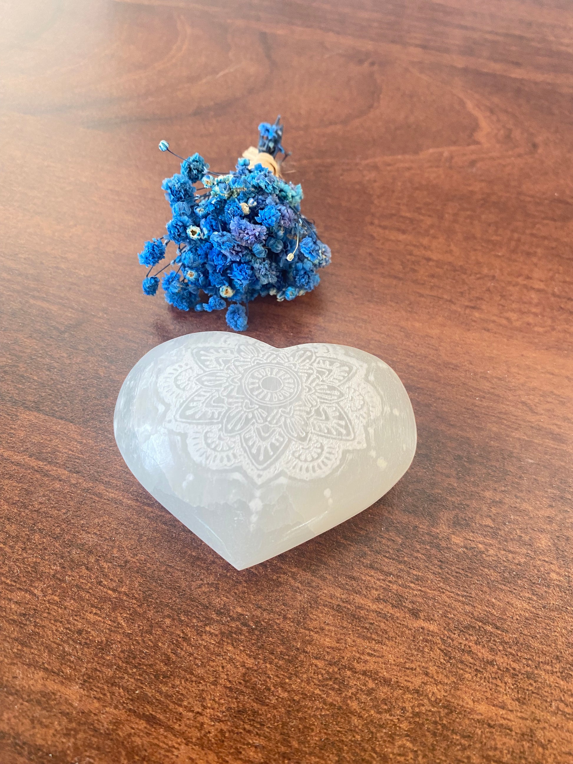 Selenit Herz , mit Mandala - Muster, Meditation mit Selenit, Reinigung, Altardekoration, Selenit – Stein der Klarheit und Reinigung