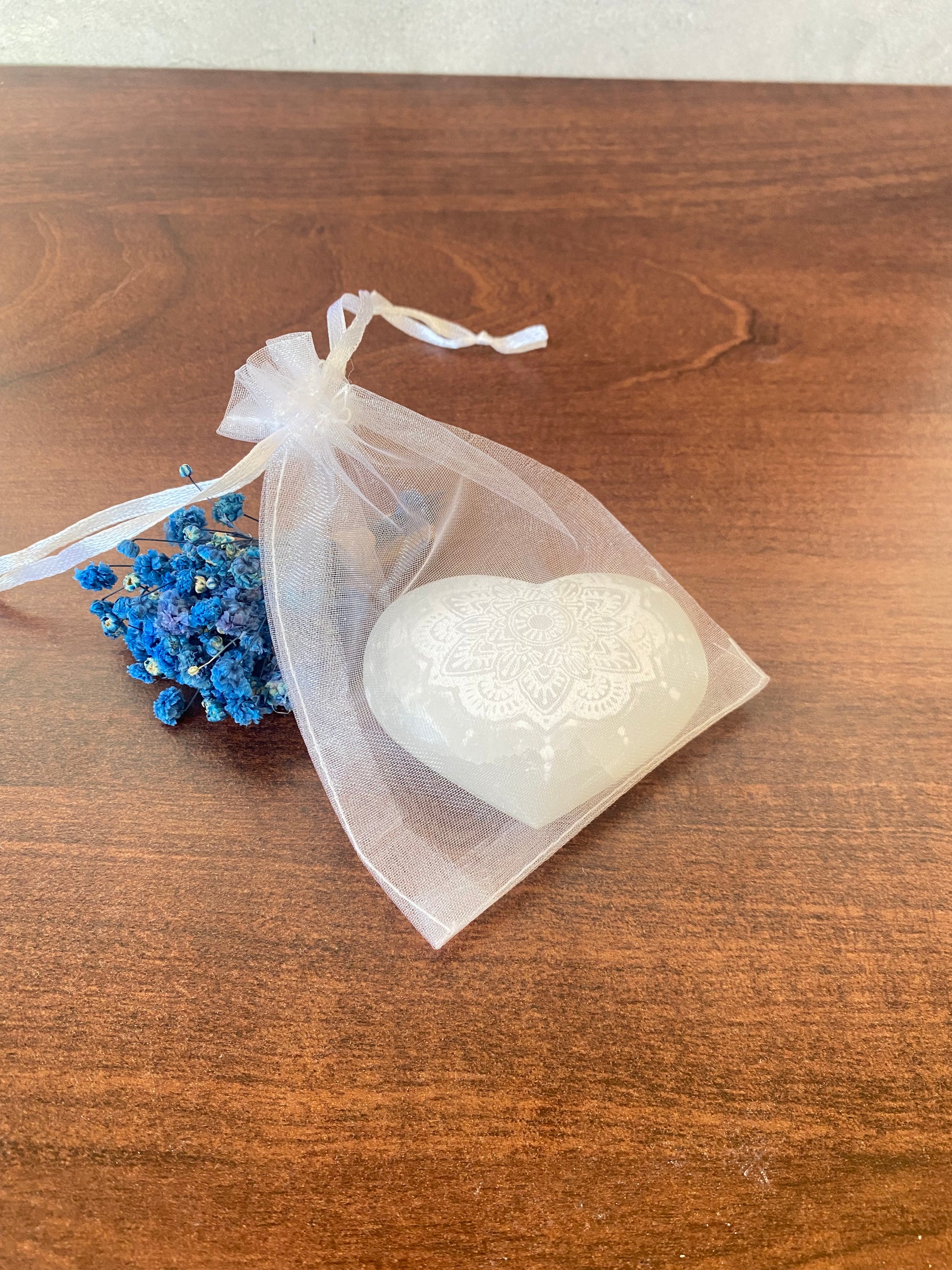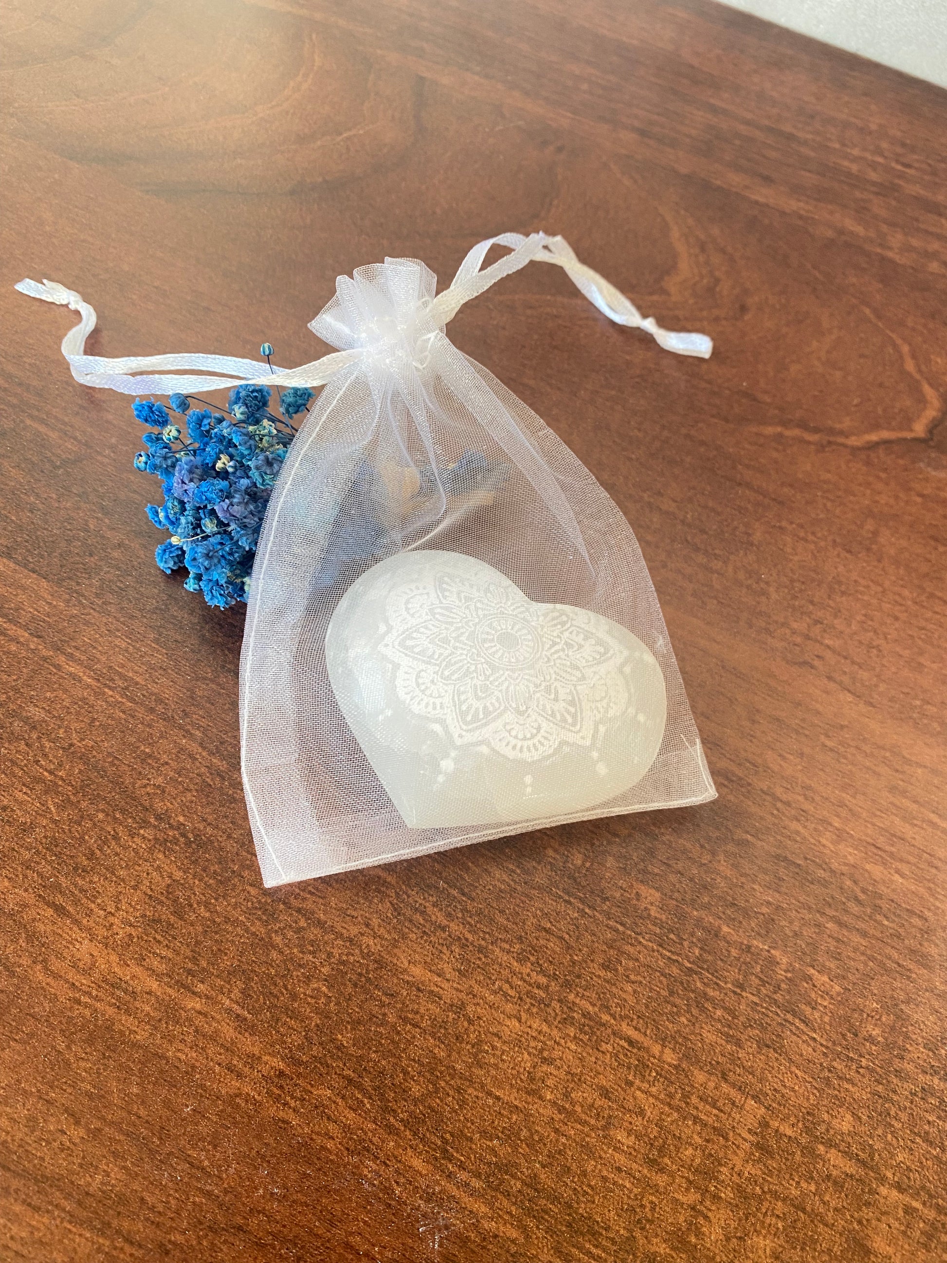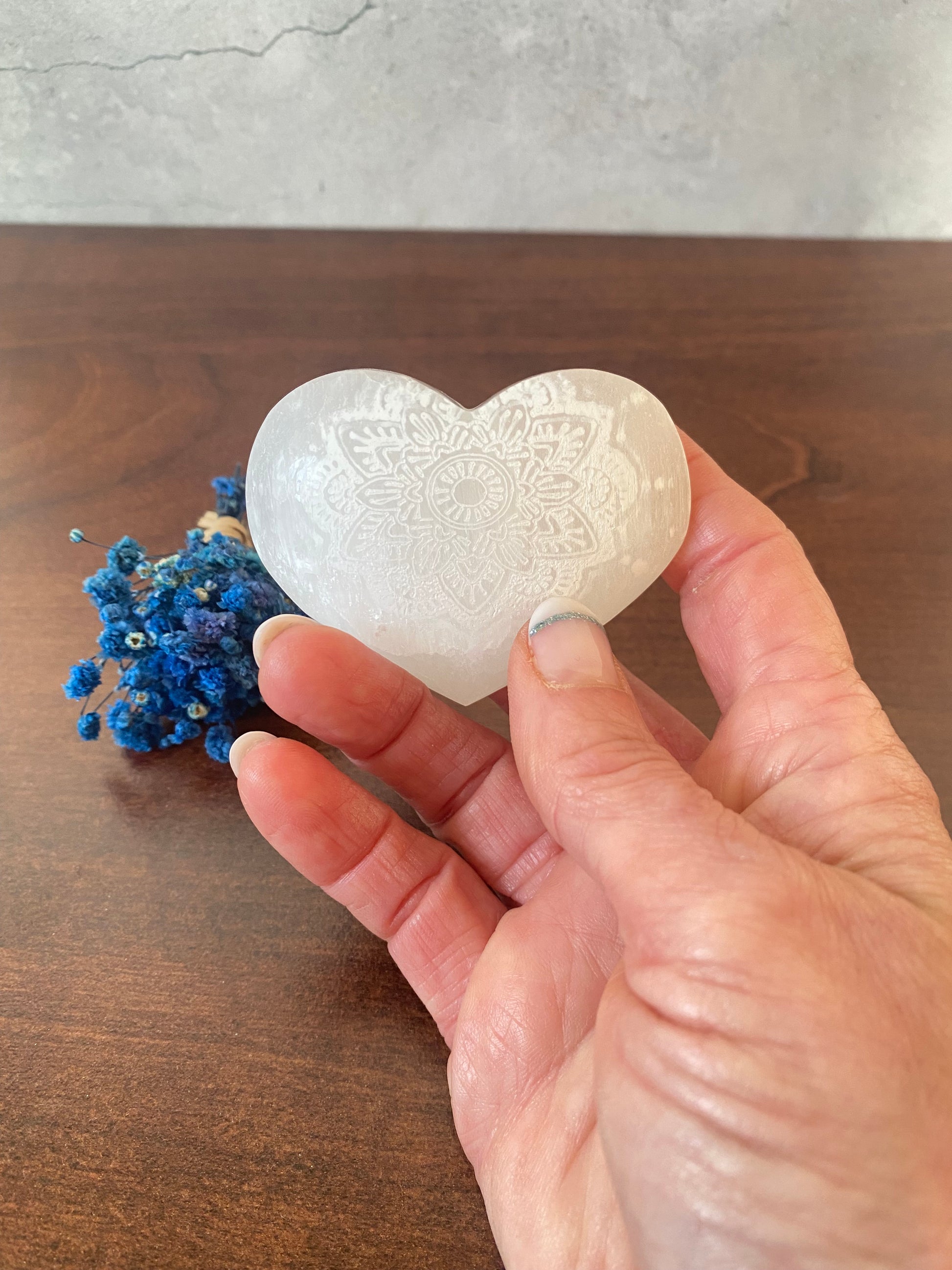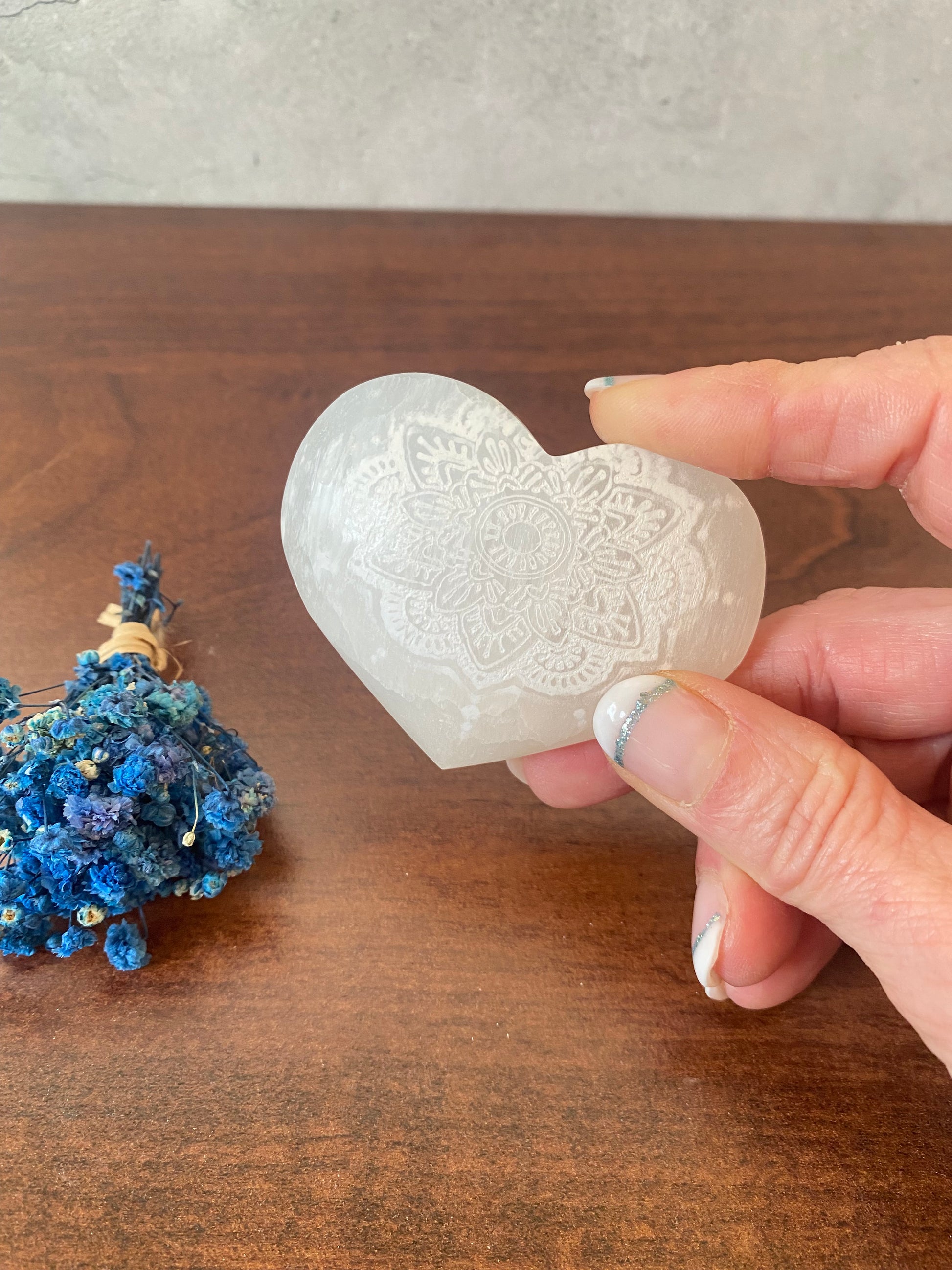 Selenit Herz , mit Mandala - Muster, Meditation mit Selenit, Reinigung, Altardekoration, Selenit – Stein der Klarheit und Reinigung