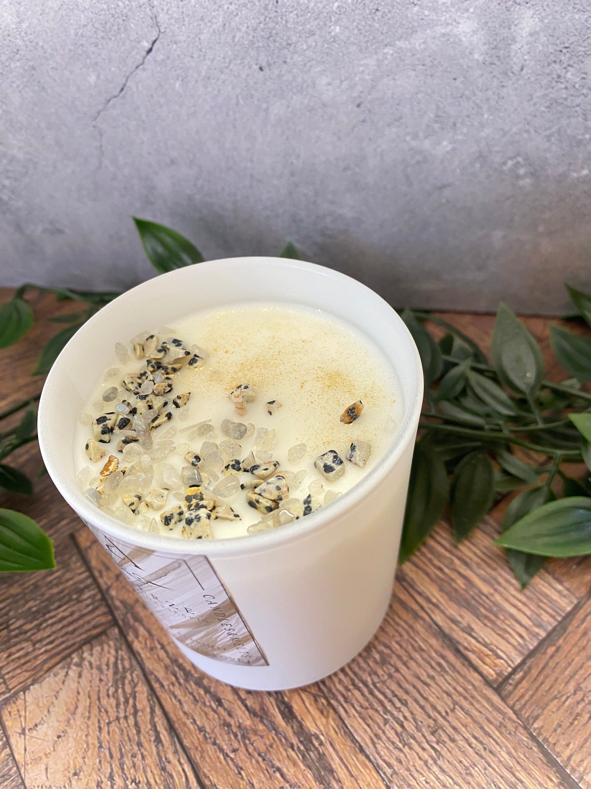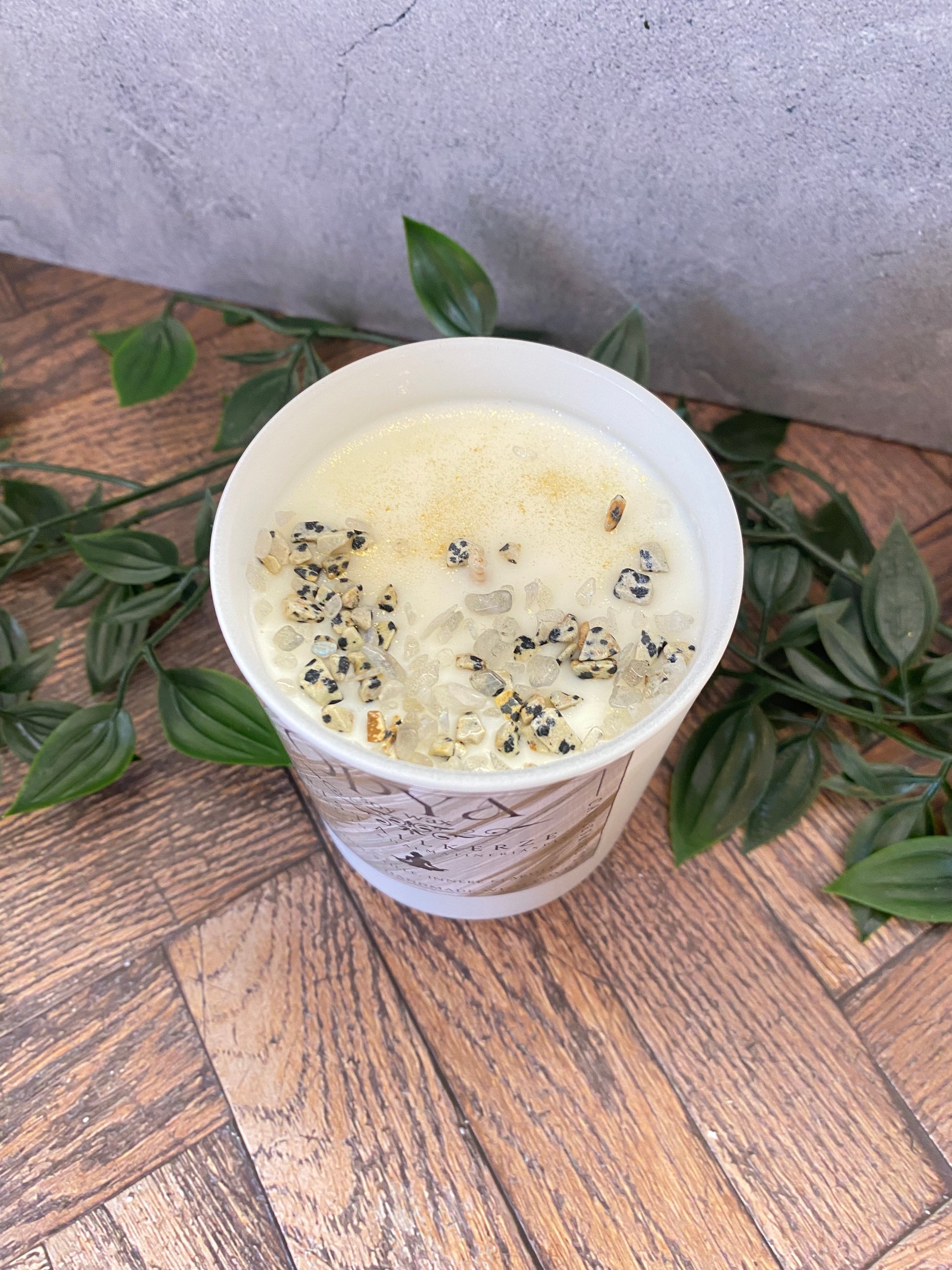 Diese liebevoll handgegossene Kristall - Duftkerze -Duft Cashmeran-aus 100 % reinem Sojawachs vereint die kraftvolle Energie von Dalmatiner Jaspis und Mondstein. Jede Kerze ist ein Unikat und wird mit einem ausgefallenen, handgemachten Etikett geliefert, das die spirituelle Bedeutung der Edelsteine beschreibt.
