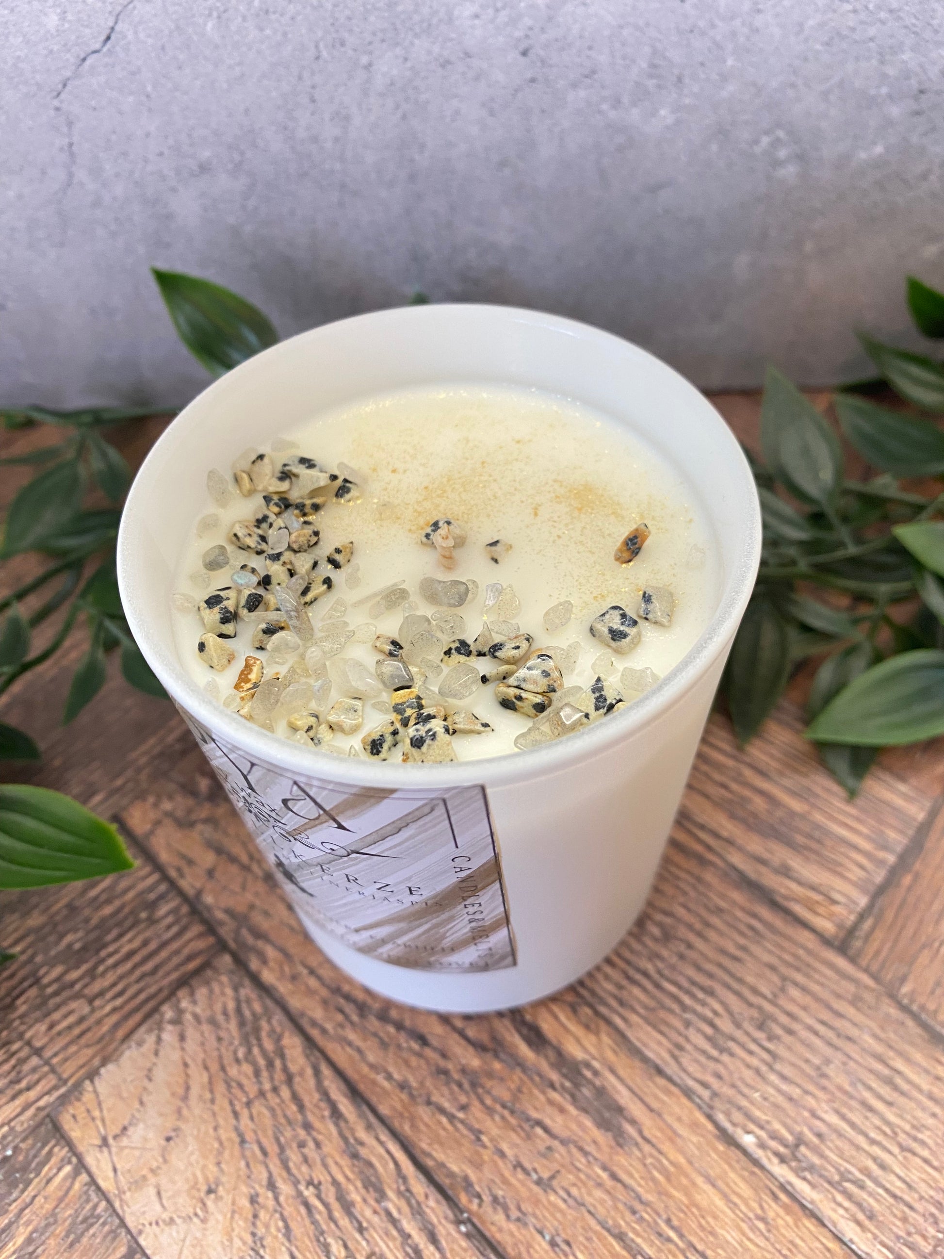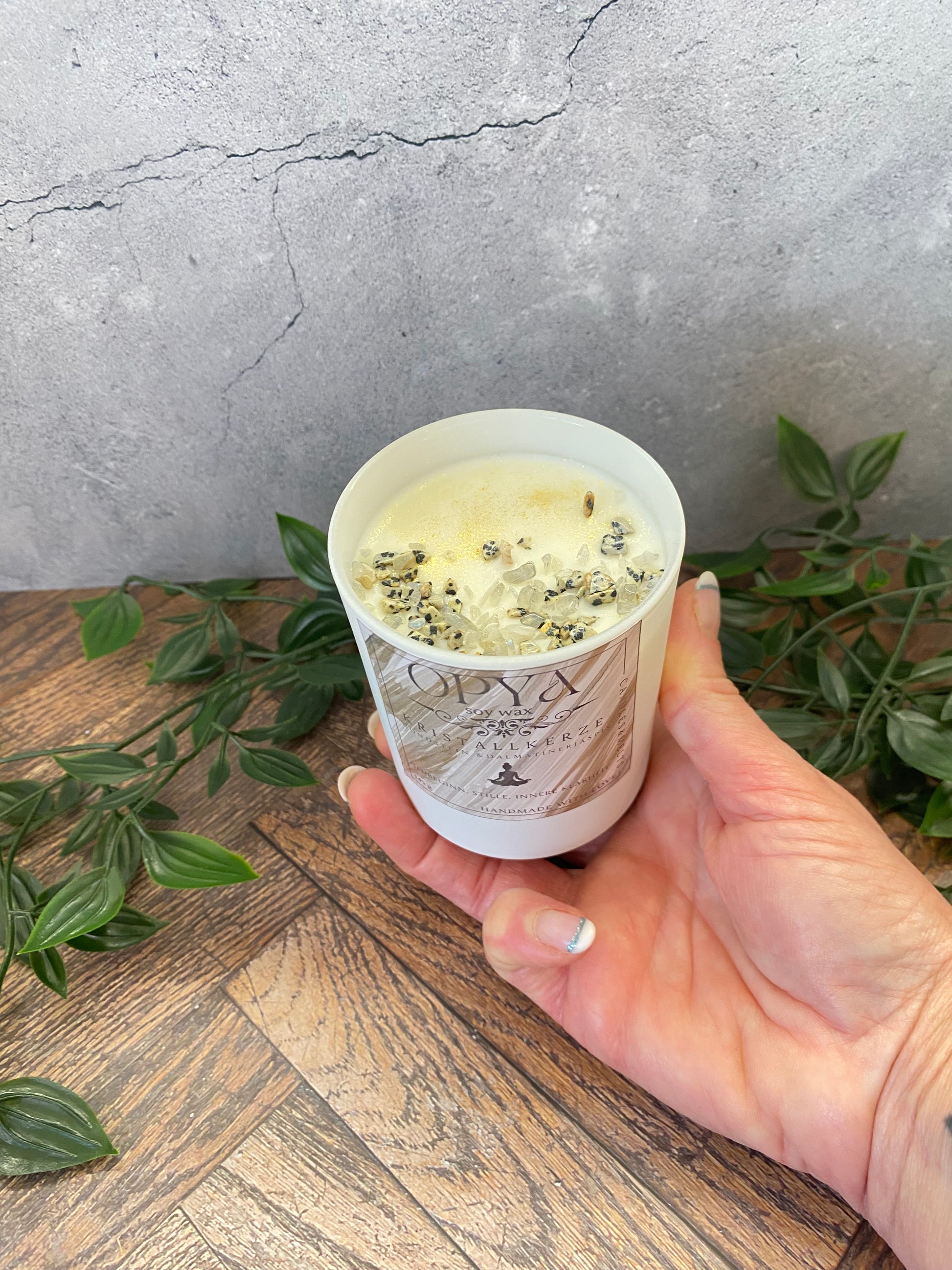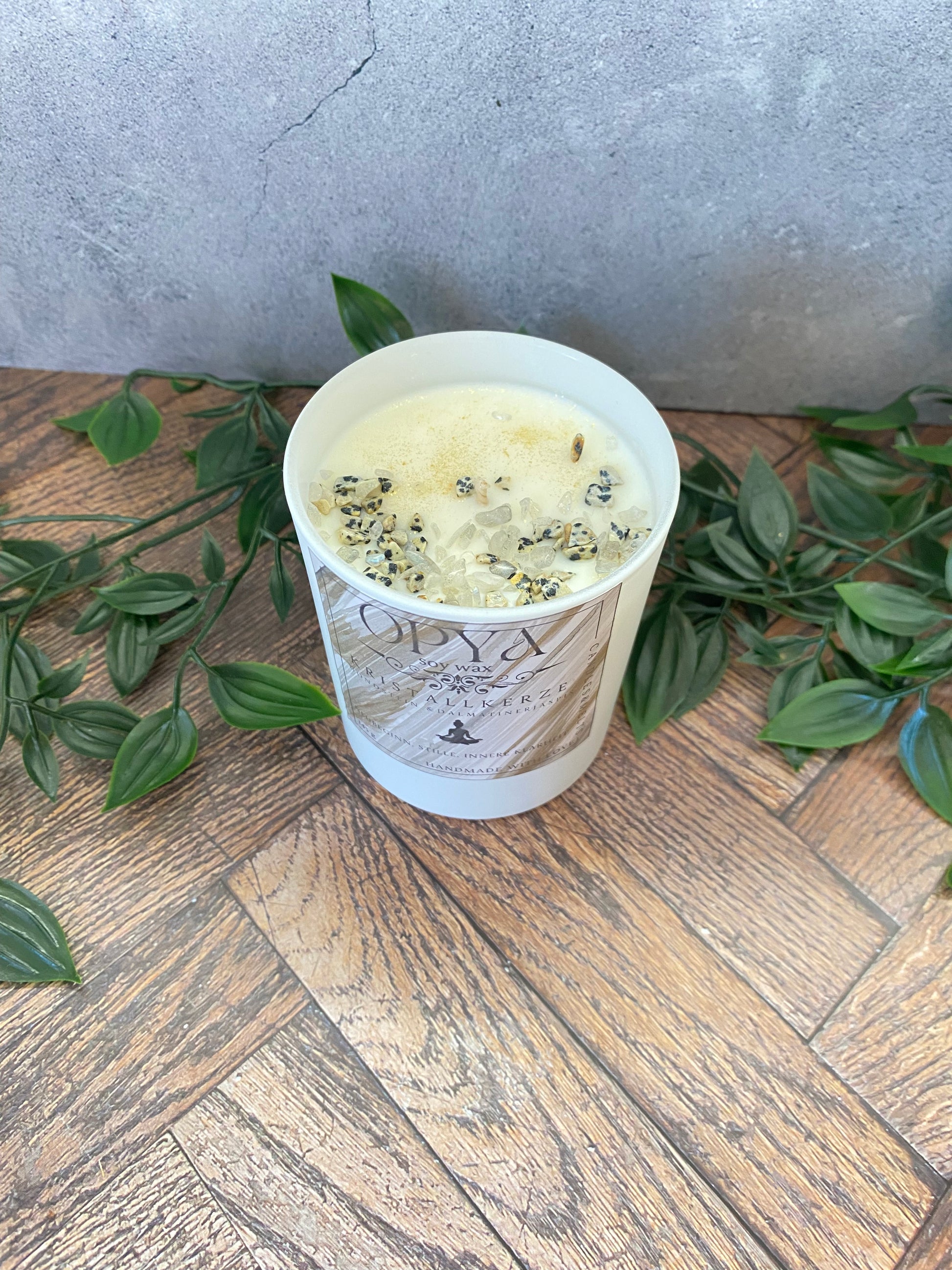 Handgegossene Kristallkerze aus Sojawachs – Dalmatiner Jaspis & Mondstein | Schutz, Intuition & Meditation