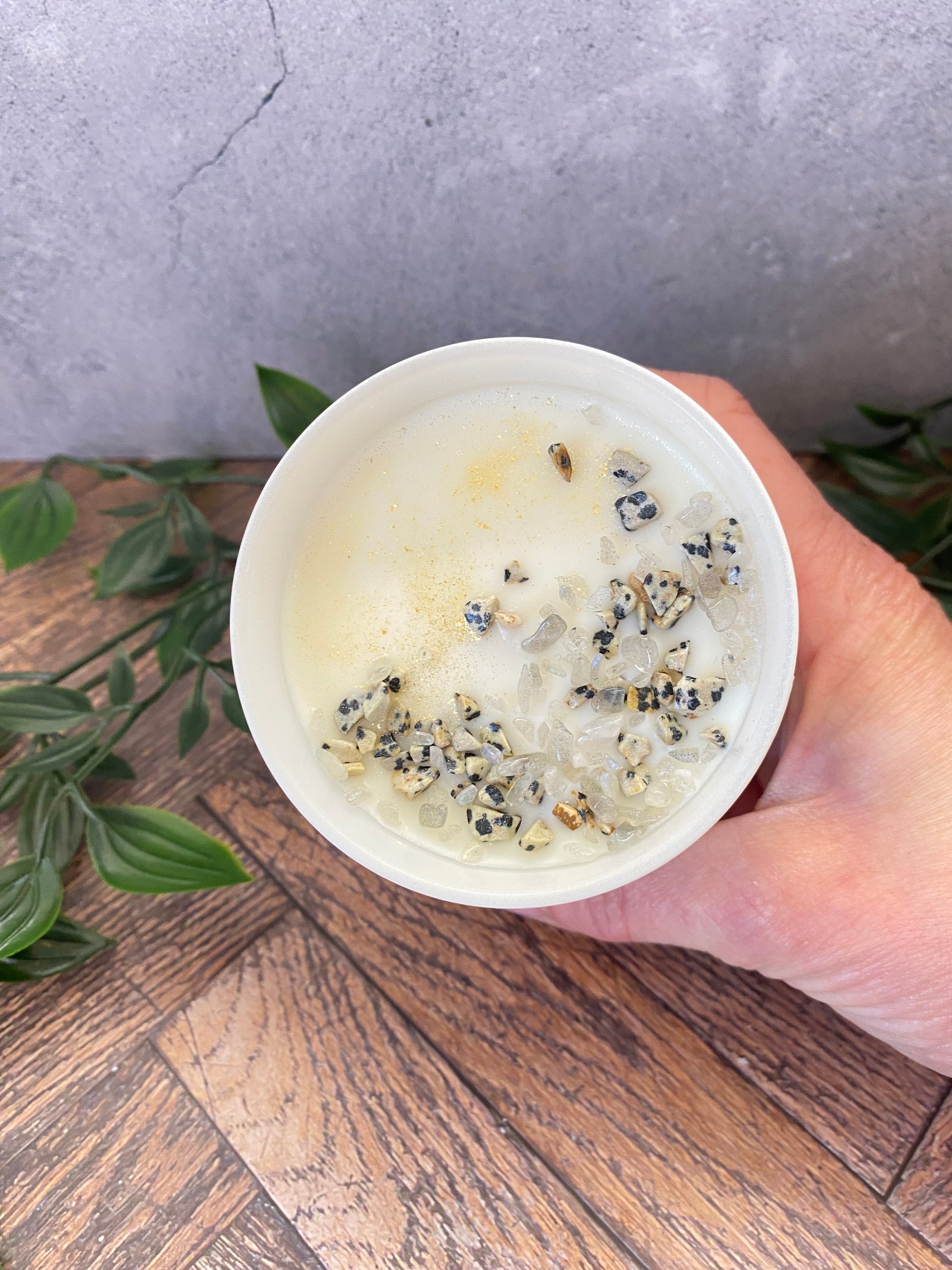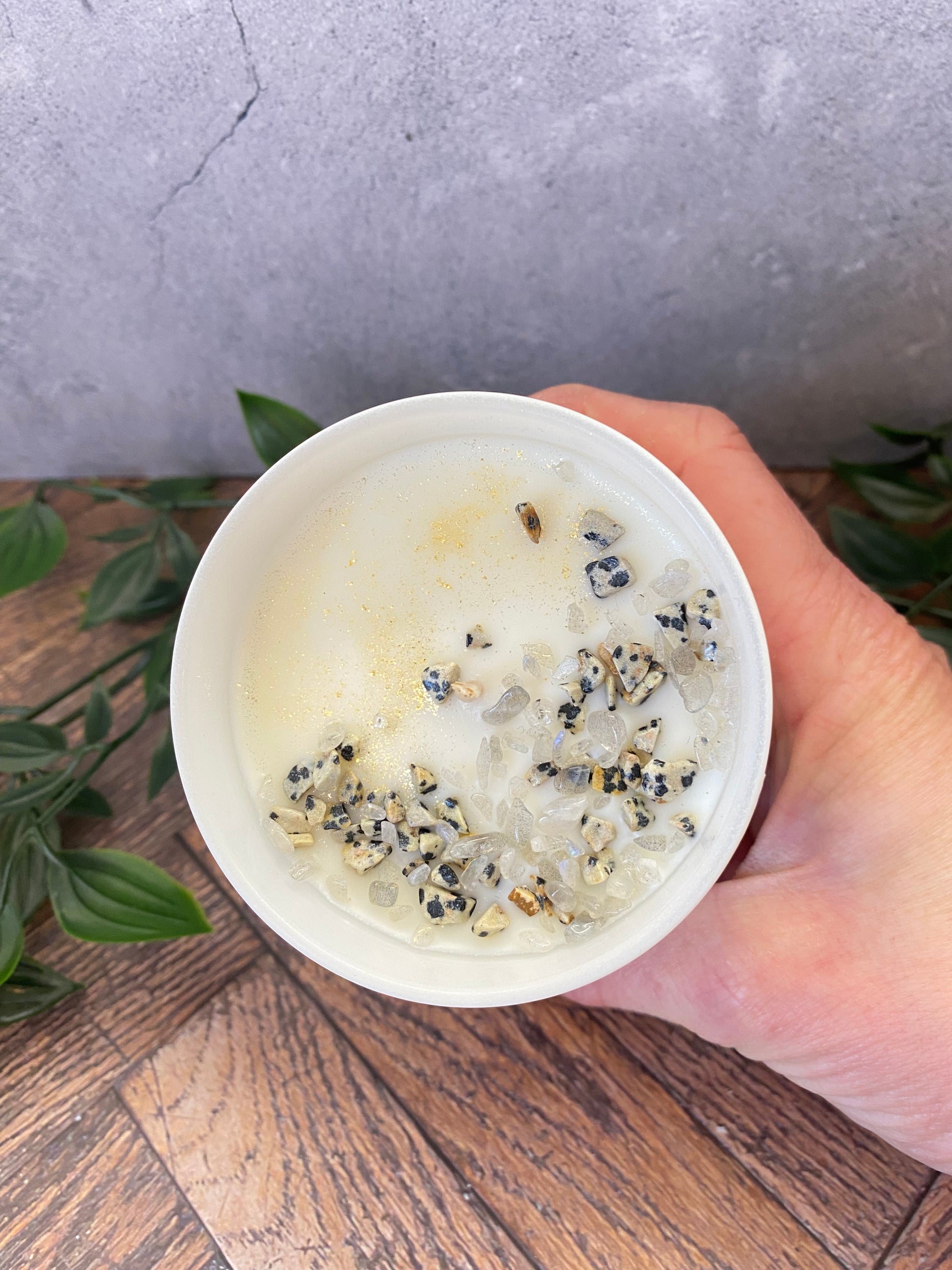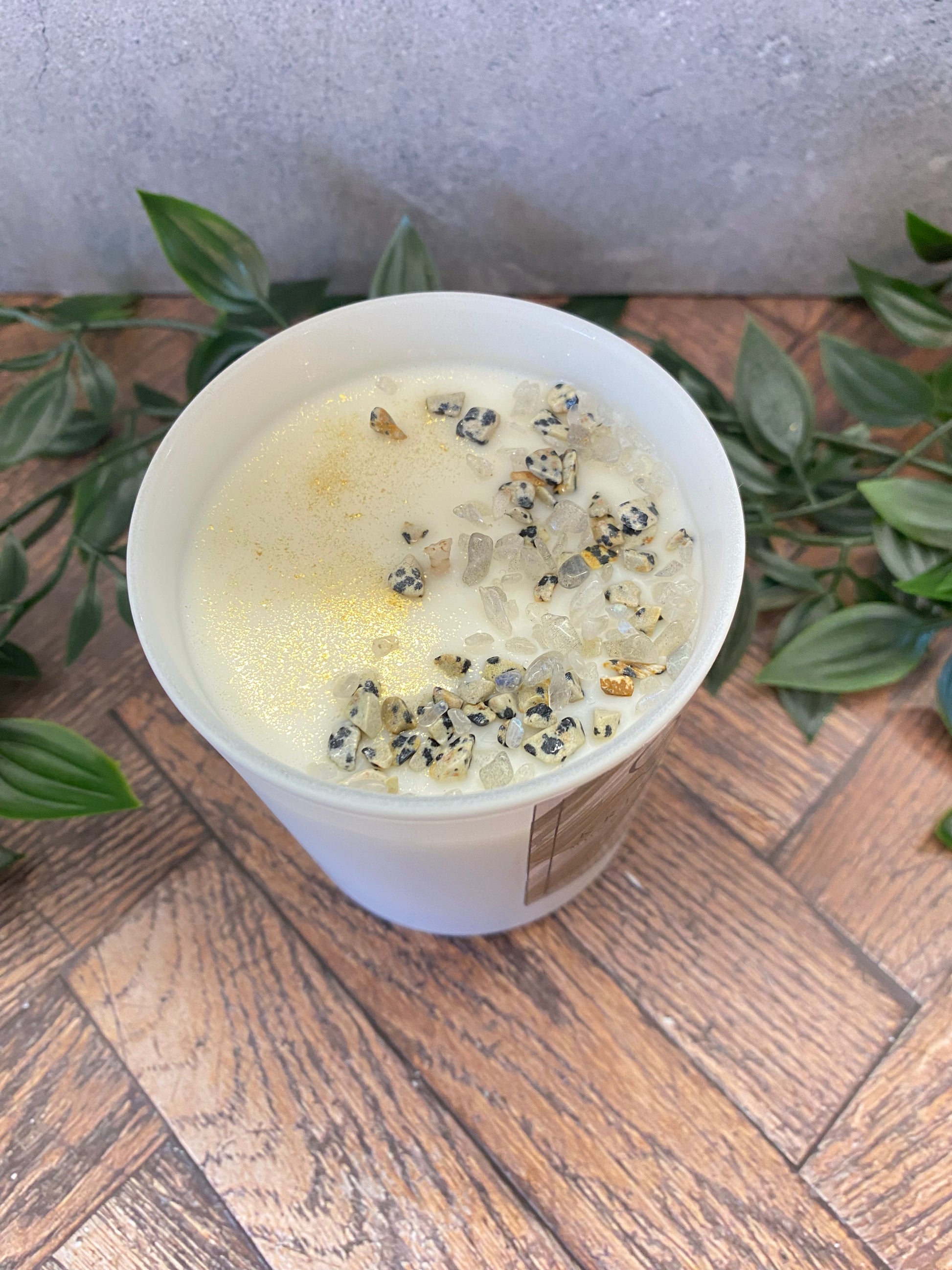 Handgegossene Kristallkerze aus Sojawachs – Dalmatiner Jaspis & Mondstein | Schutz, Intuition & Meditation
