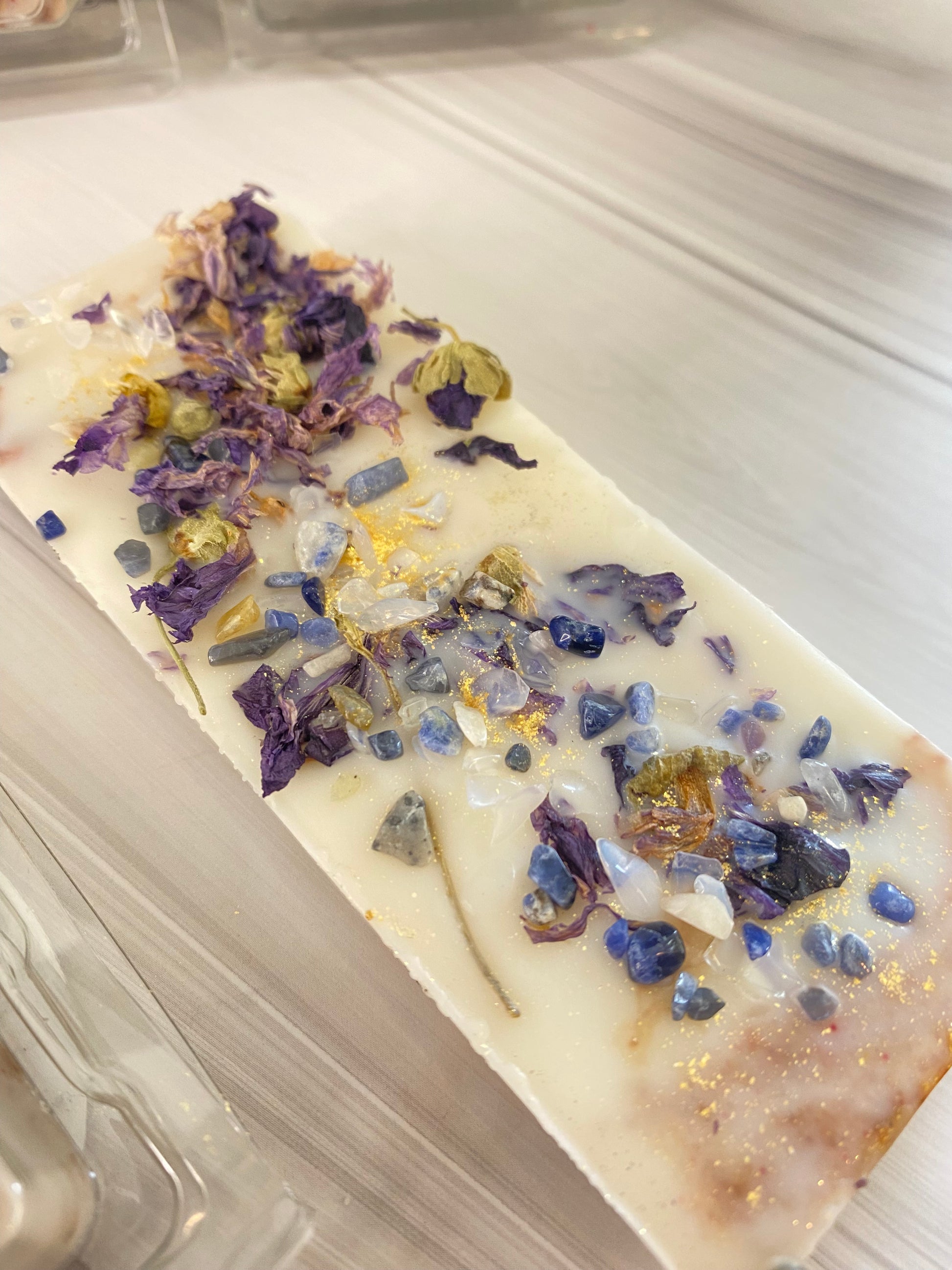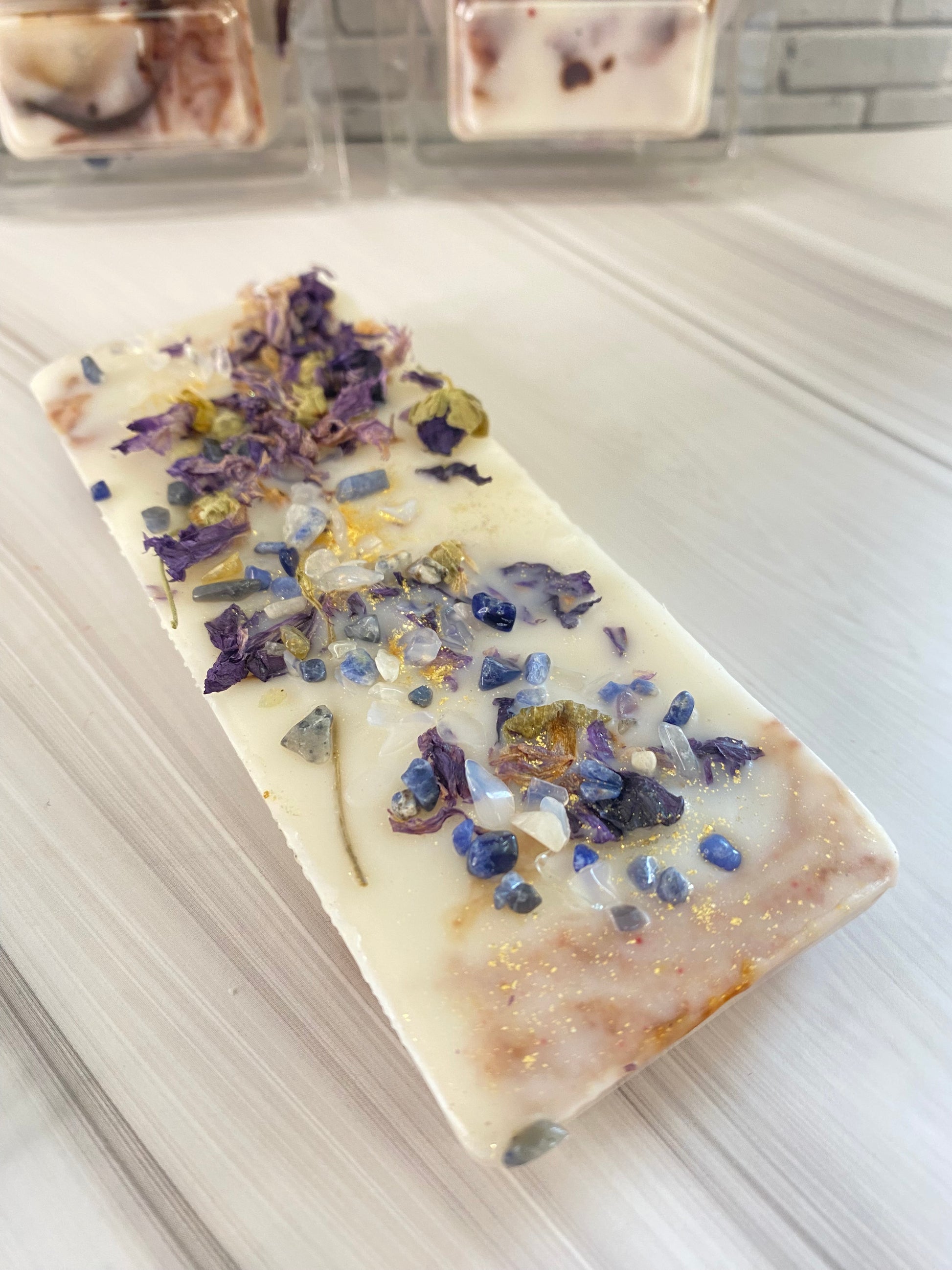 Jedes Stück ist liebevoll mit getrockneten Malvenblüten verziert und trägt auf der Rückseite kleine Schätze der Natur: Opalit- und Sodalith-Kristalle. Beim Schmelzen vereinen sich sanftes Schimmern von Mica, zarter Glitzer und die leuchtenden Kristalle mit dem warmen Kaffeearoma – ein wahrhaft magischer Moment für dein Zuhause.