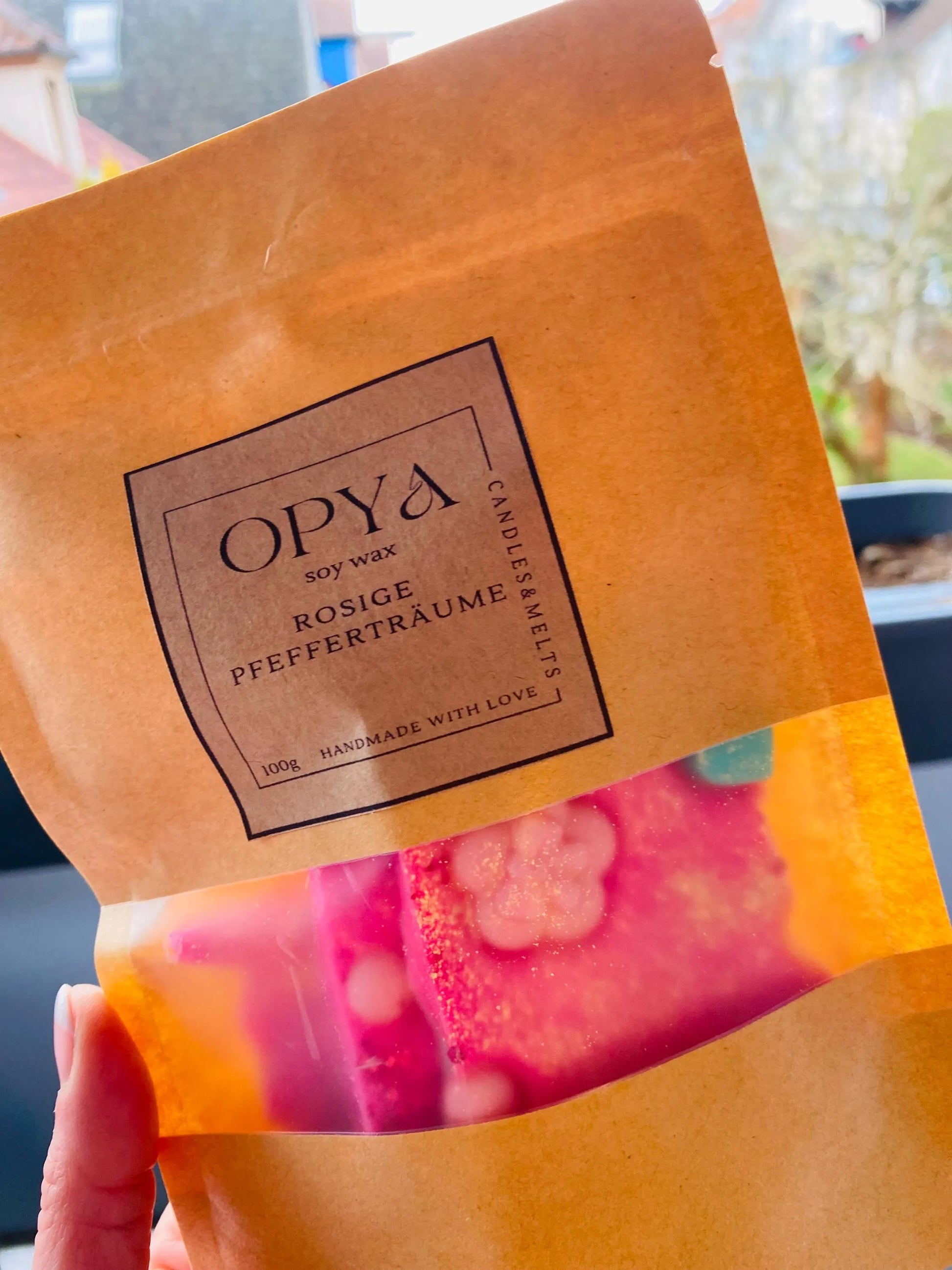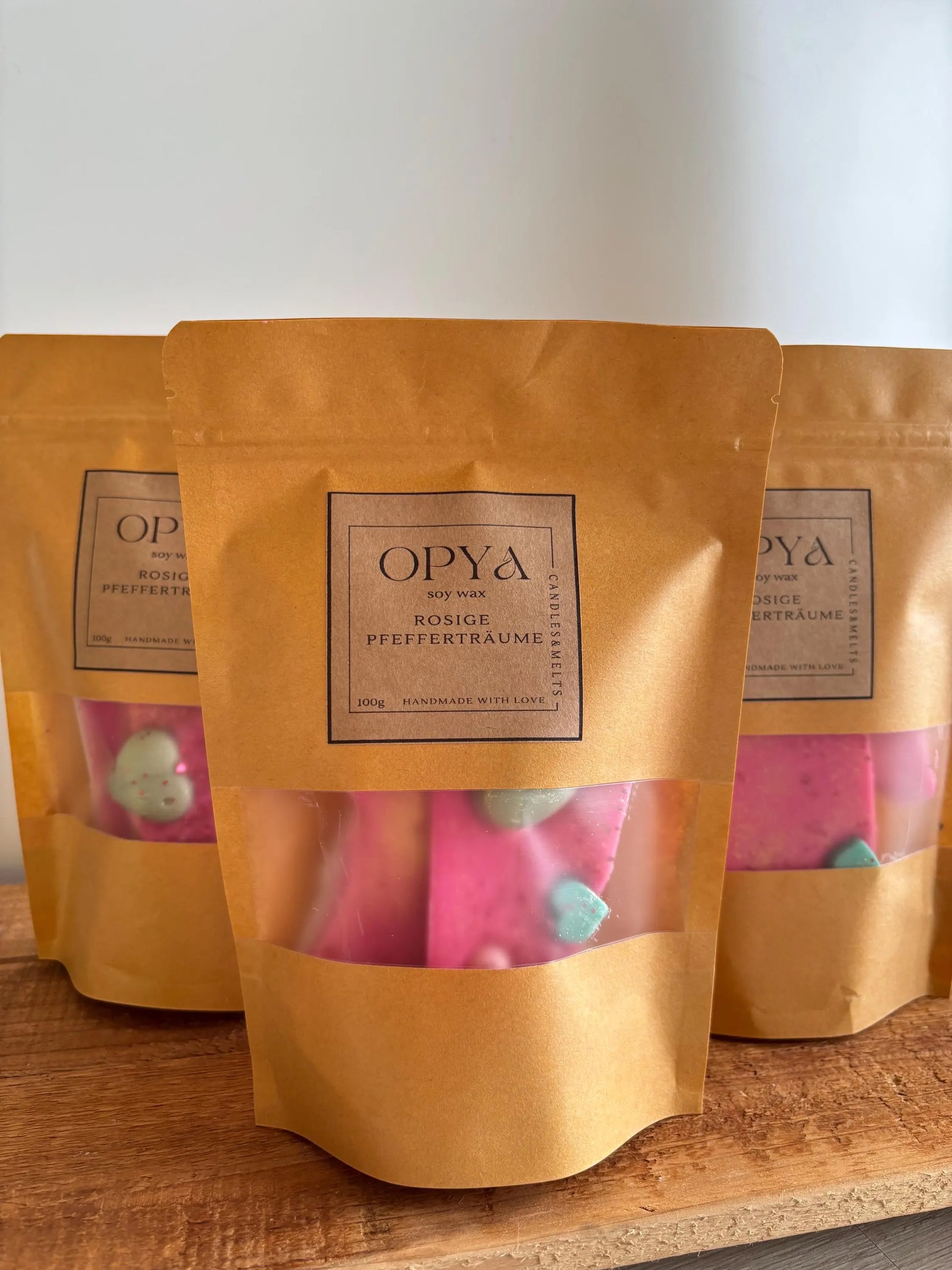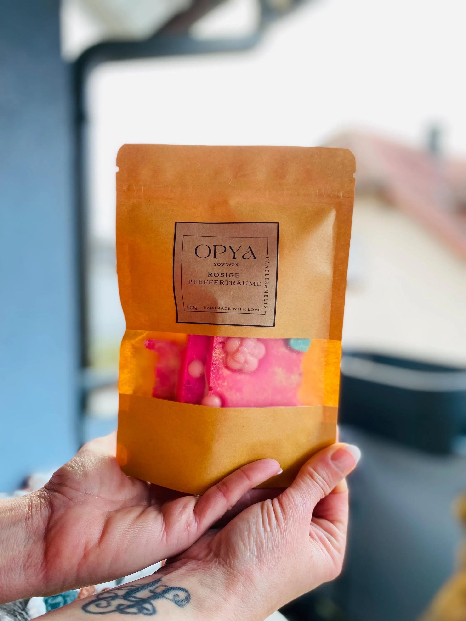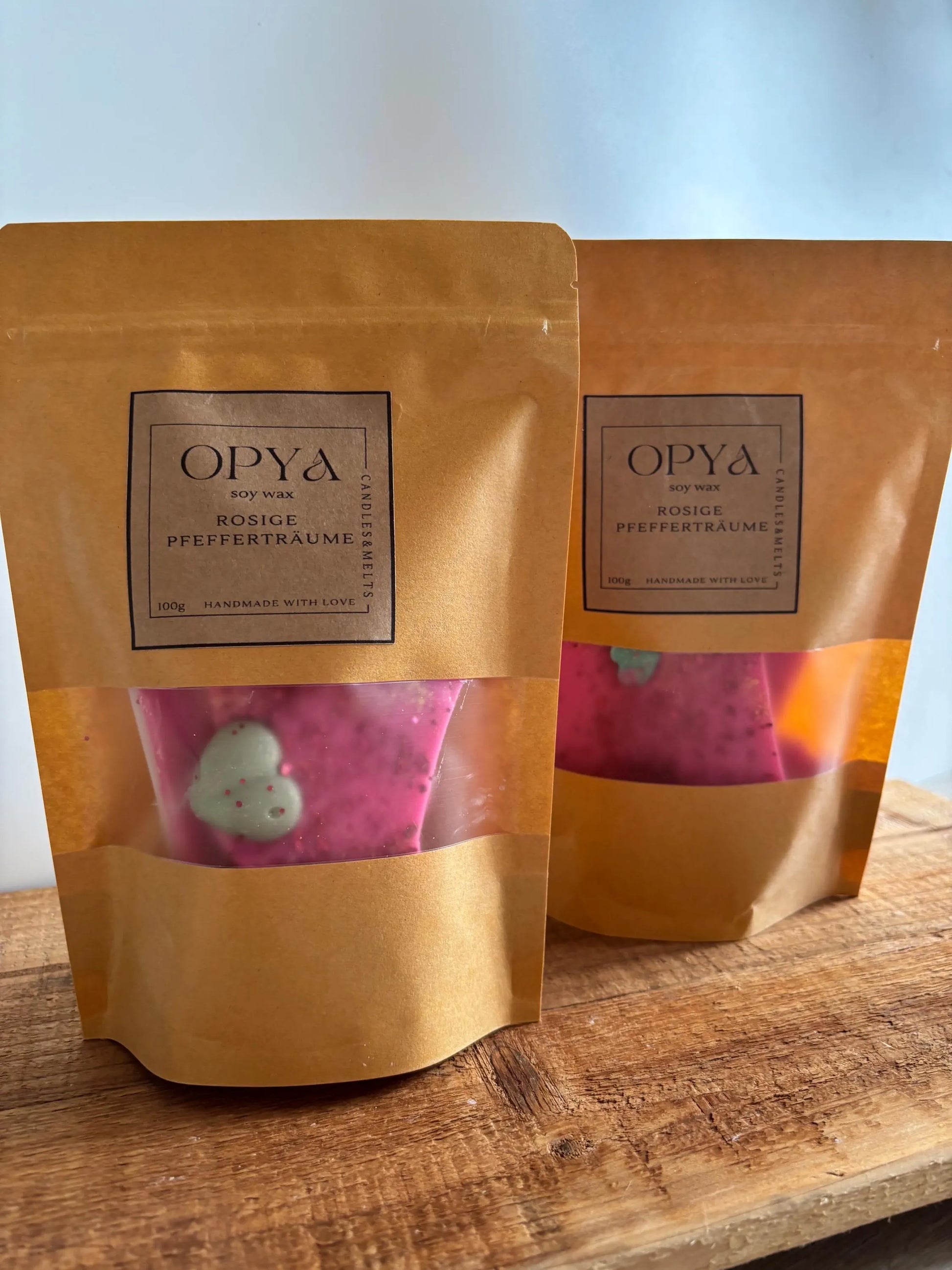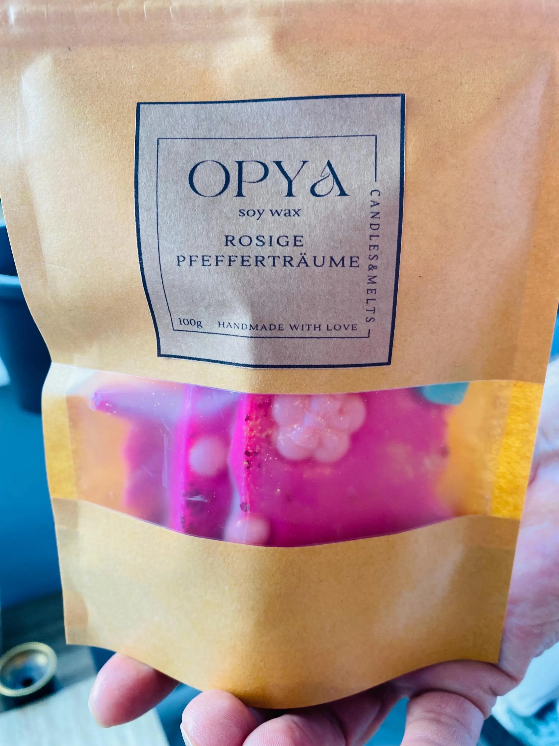Erlebe die zauberhafte Welt von Rosige Pfefferträume mit meinen handgefertigten Wachs Melts aus hochwertigem Sojawachs. Diese liebevoll gebrochenen Wachsstücke sind wie gemacht für Duftlampen und schaffen eine ganz besondere Stimmung in Deinem Zuhause. Produktdetails: 100g, verpackt in einer Papierhülle mit Sichtfenster (20 x 12,5 cm). Das pinke Wachs, verziert mit rosafarbenen Blüten, türkisfarbenen Herzen und funkelndem Glitzer, lässt beim Schmelzen schimmerndes Micapulver tanzen und sorgt für ein magisches Flair. Der Duft entführt Dich in einen blühenden arabischen Rosengarten, mit einer herrlichen Mischung aus fruchtigen und würzigen Noten. Ein liebevoll handgemachtes Geschenk, das Deine Sinne verführt.