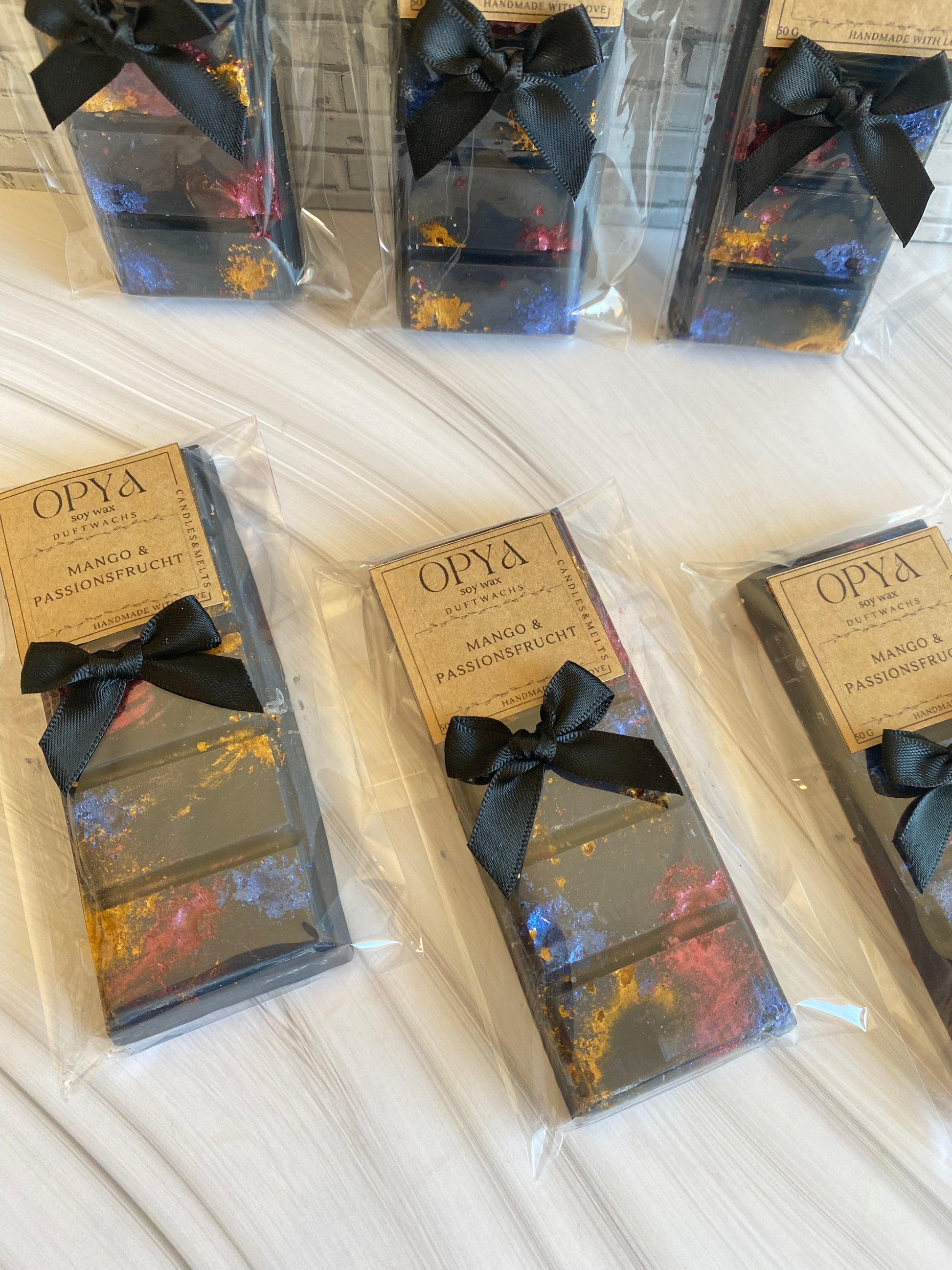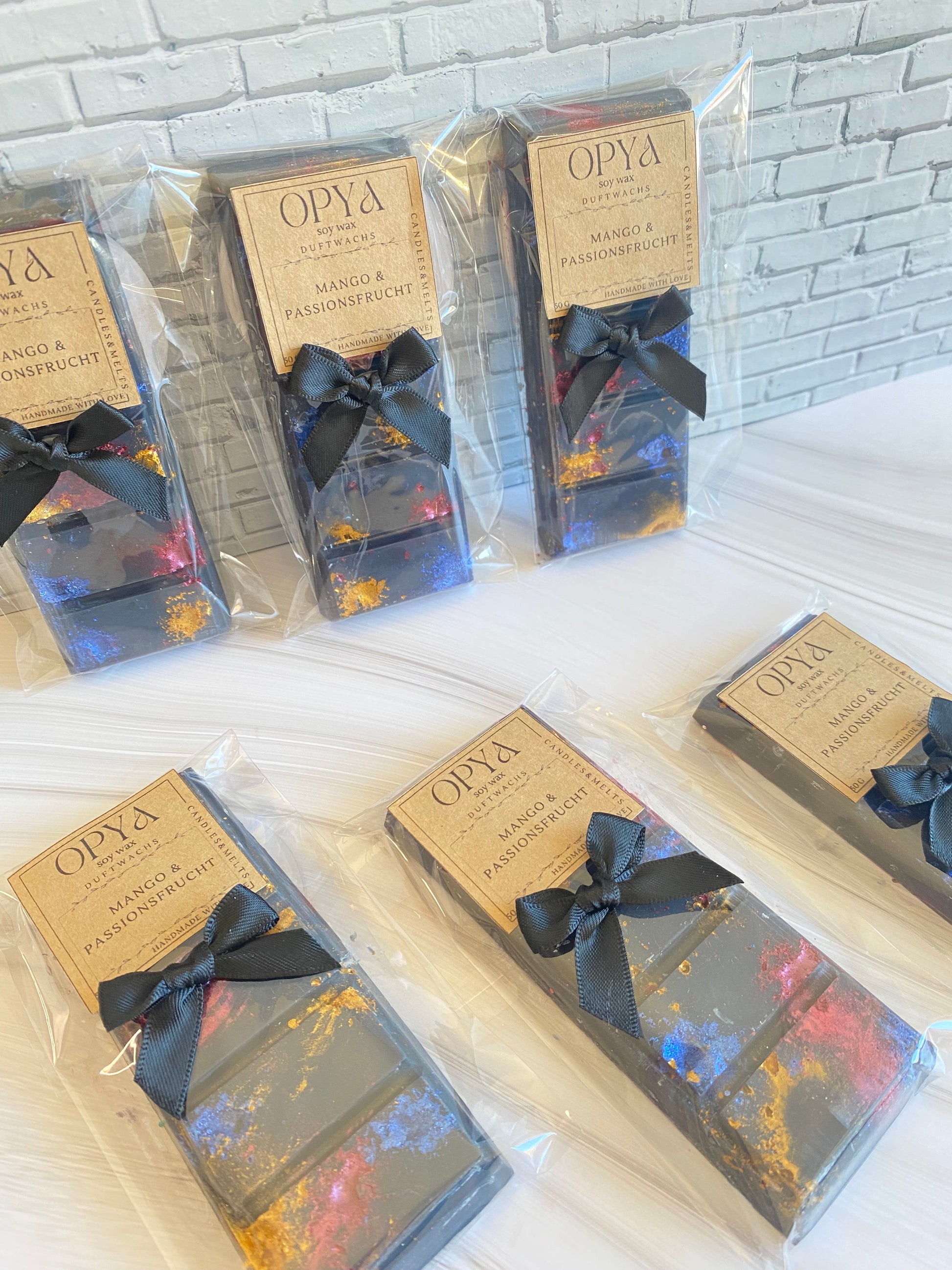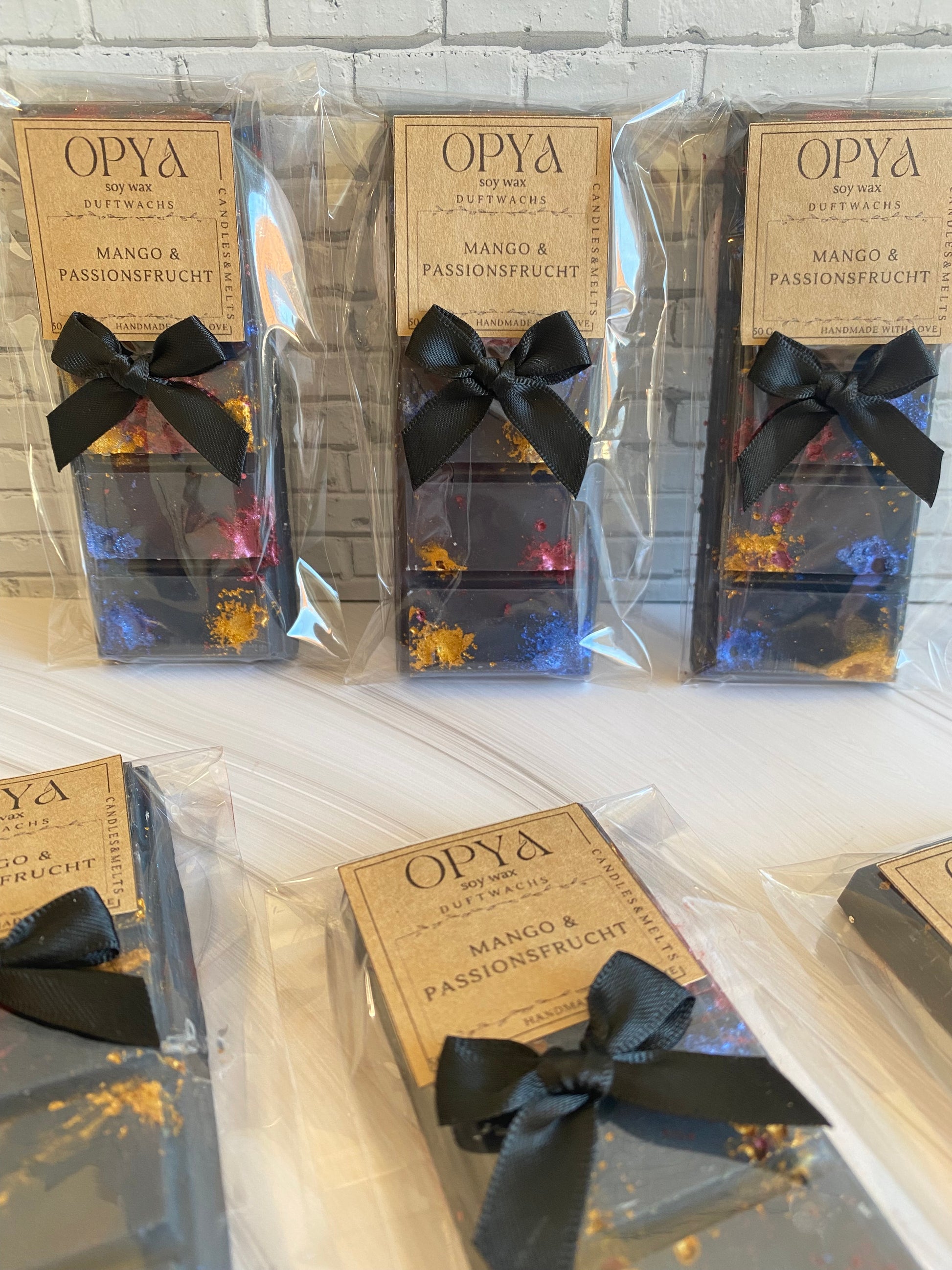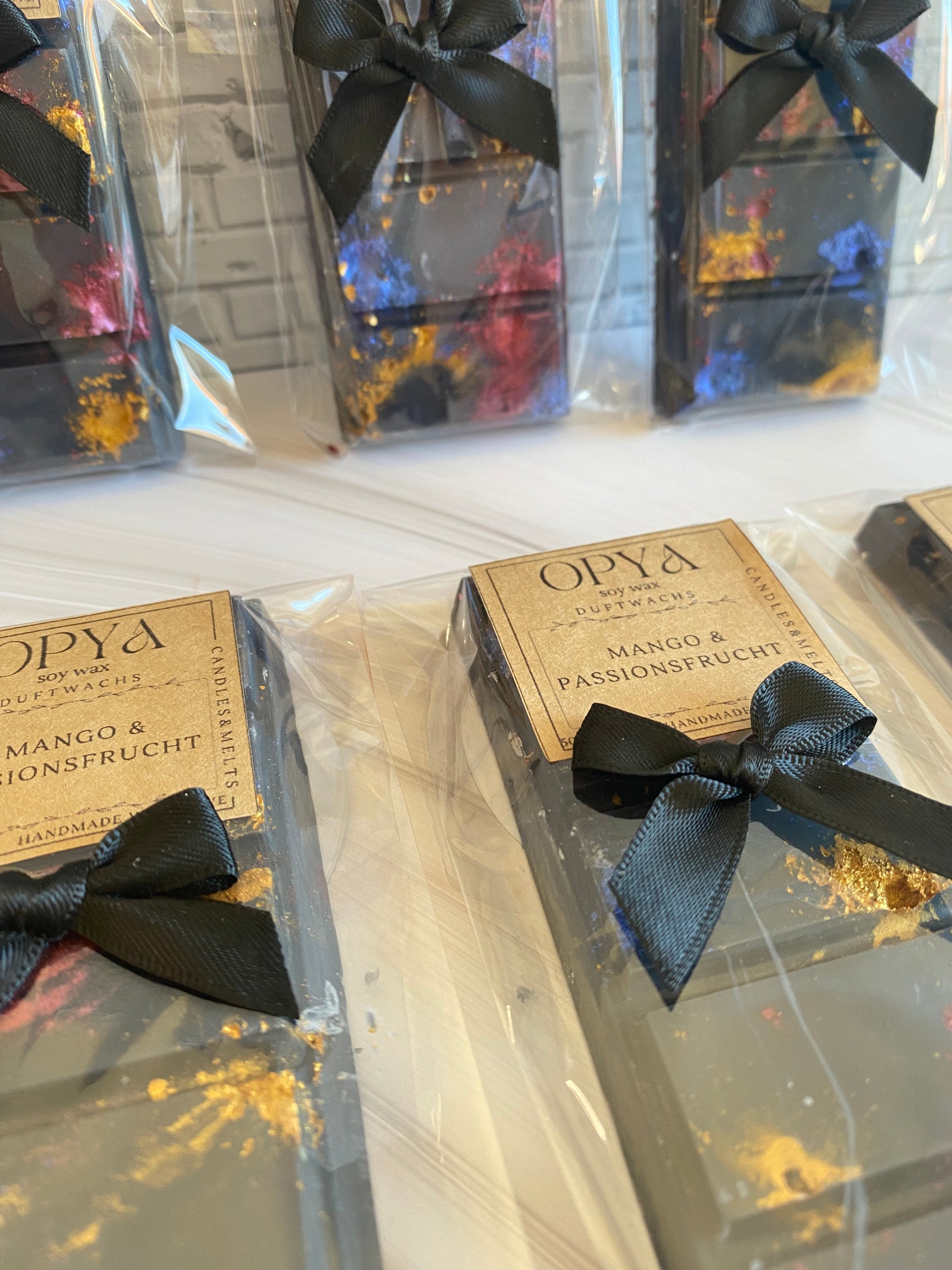 Das außergewöhnliche Design in Schwarz mit goldenen, blauen und dunkelrosanen Micapulver-Akzenten wird zum optischen Highlight, besonders beim Schmelzen. Auf der Rückseite funkelt zusätzlicher Glitzer, der diese Waxmelts zu einem echten Blickfang macht. Verpackt in schützender Folie und mit dekorativen Schleifen verziert, eignen sie sich perfekt als Geschenk oder für die eigene Duftoase.
