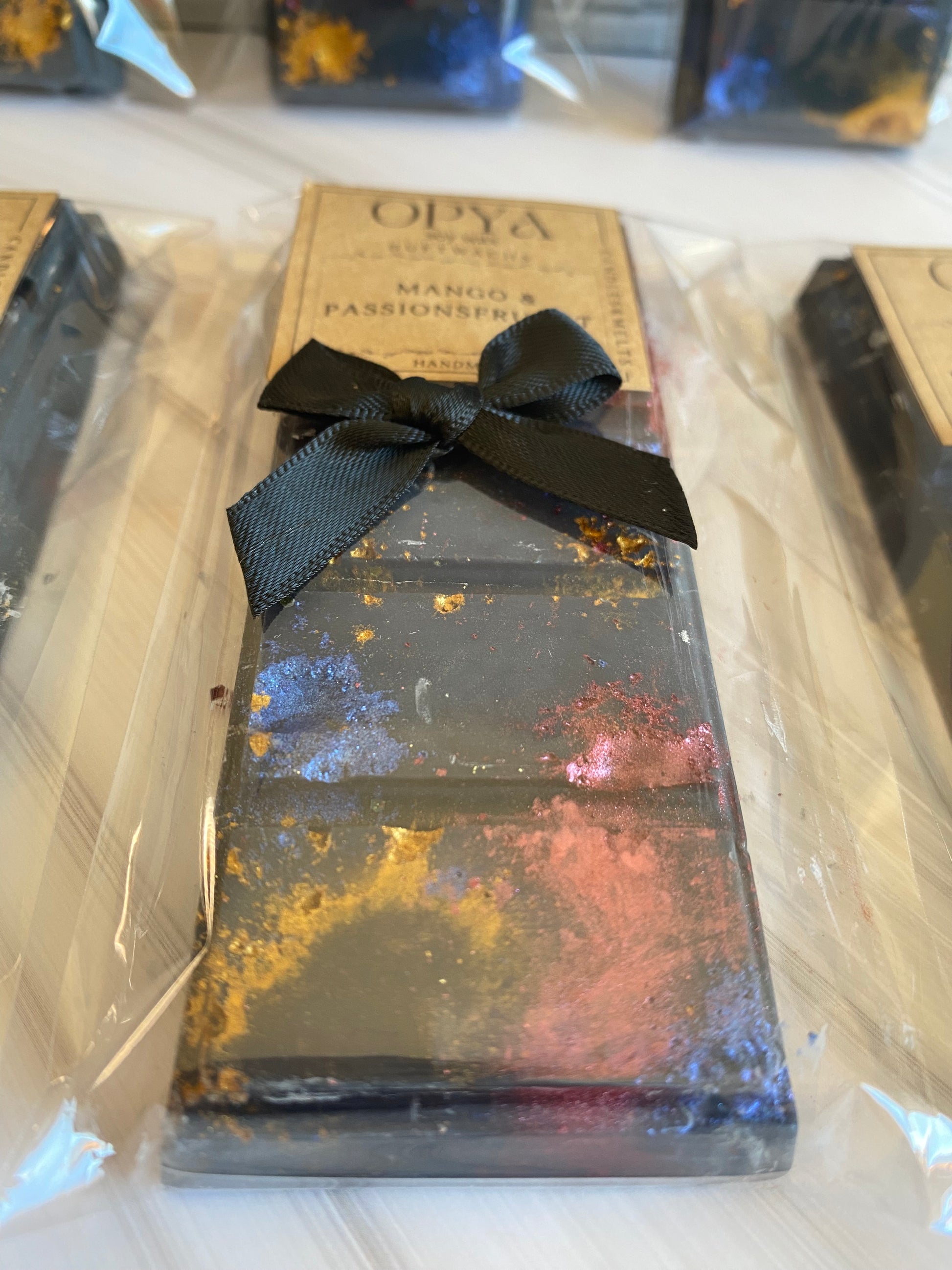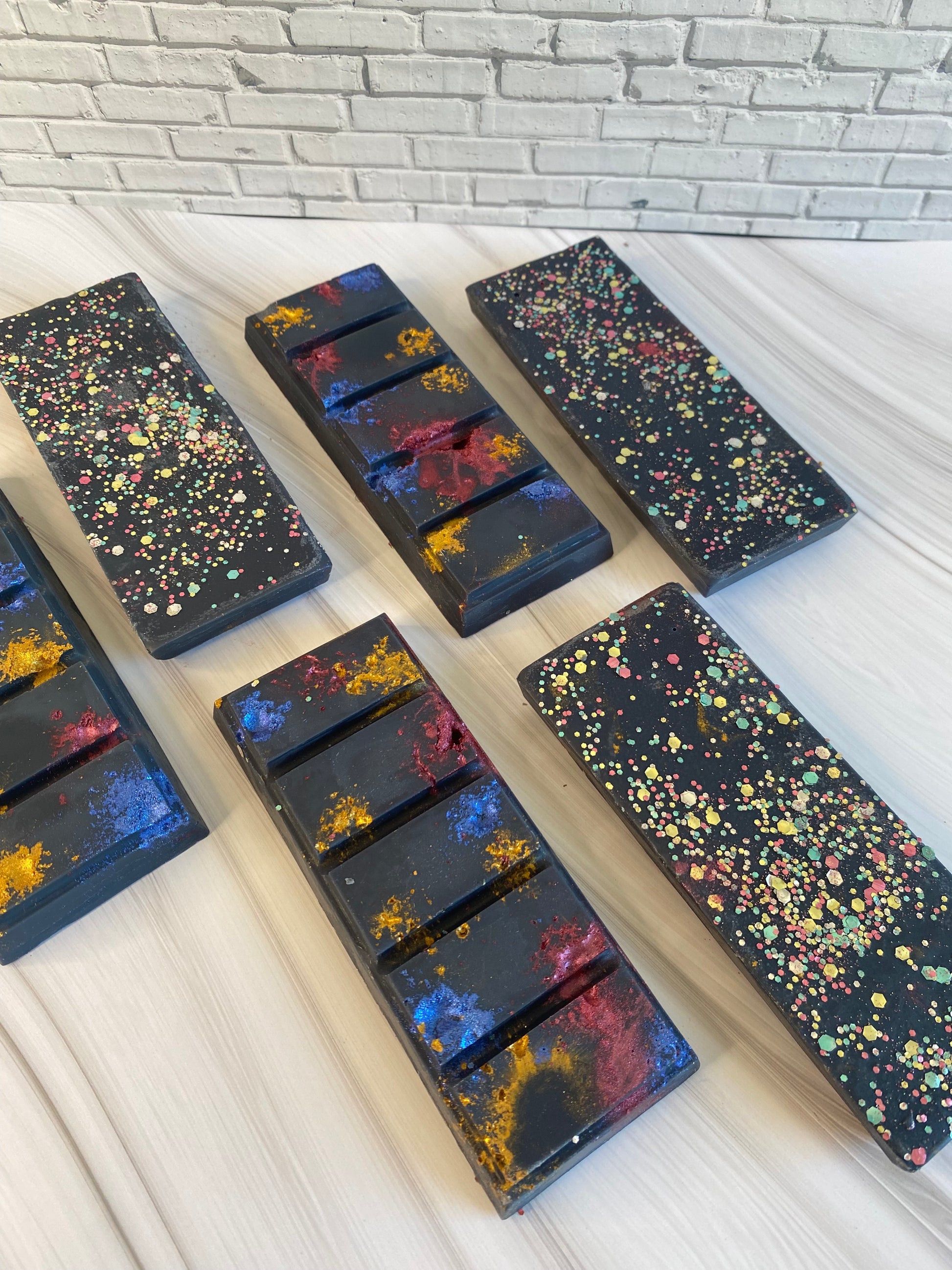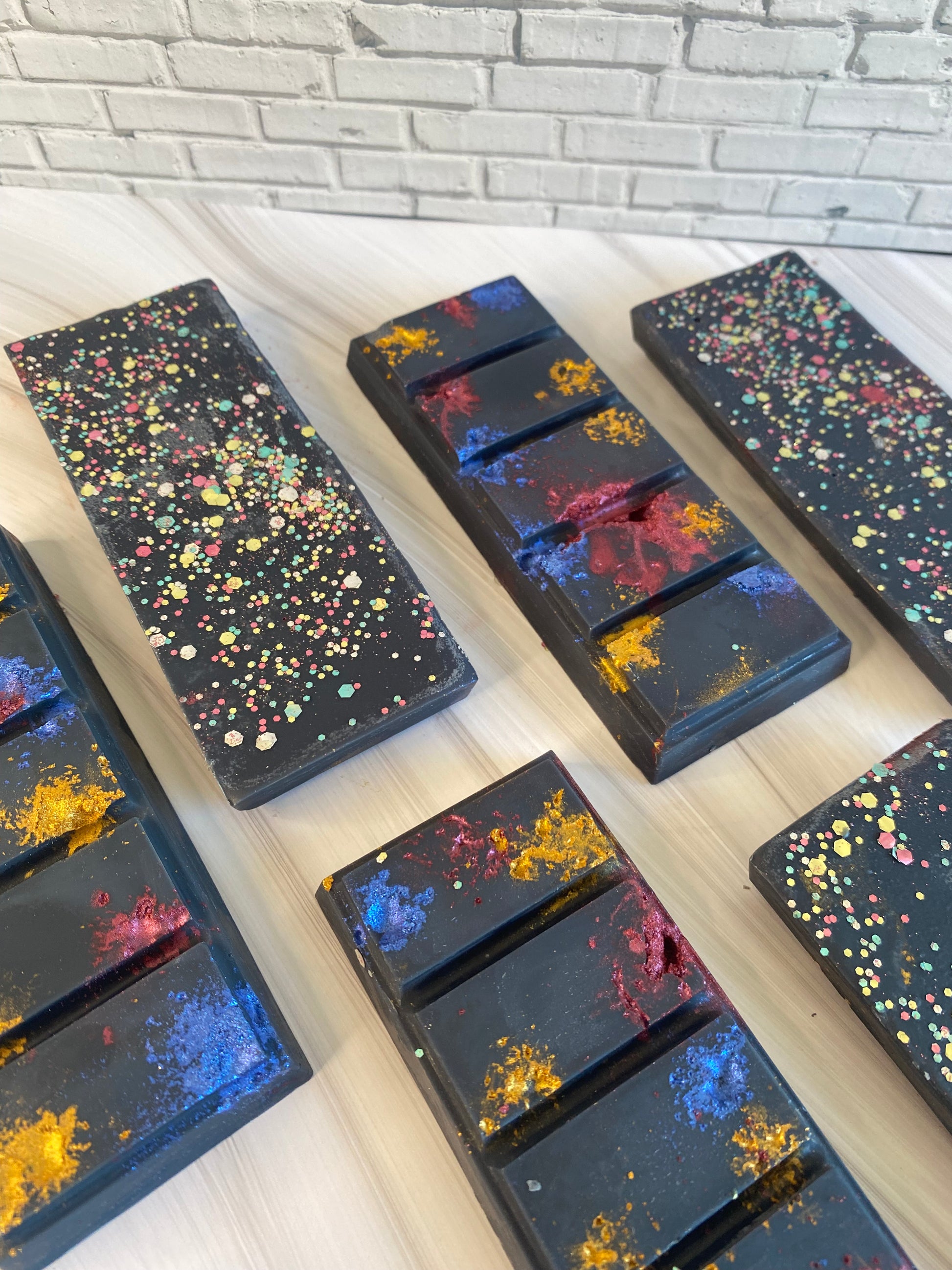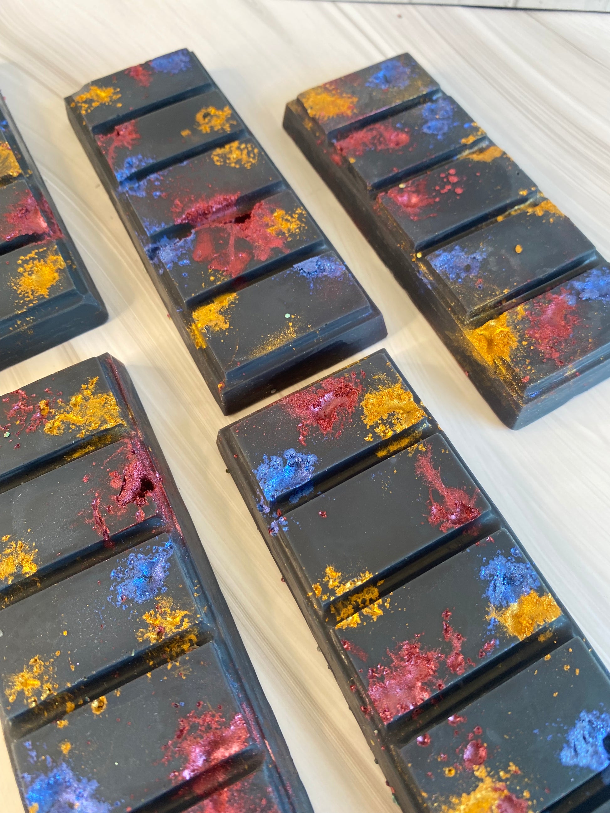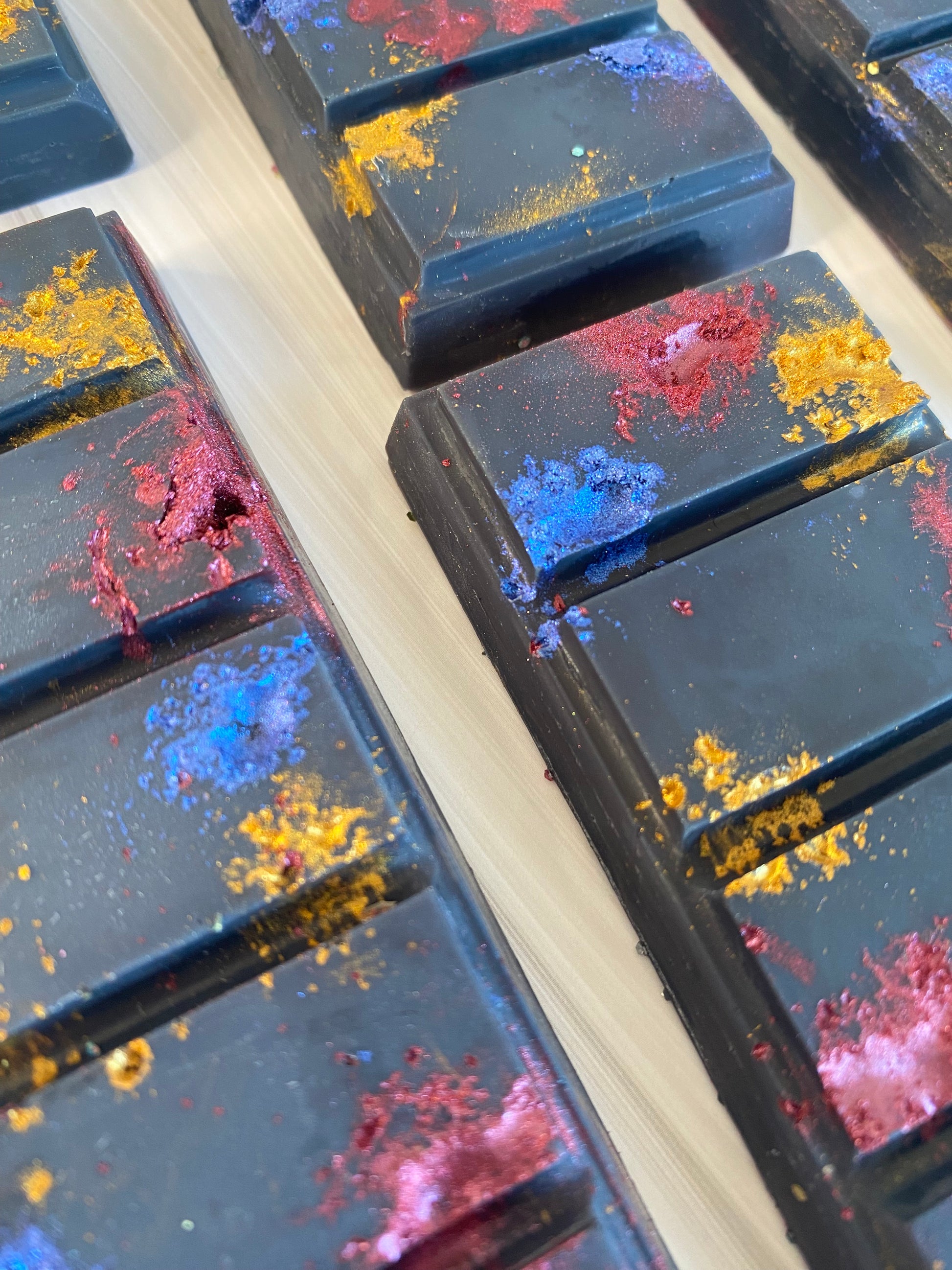 Das außergewöhnliche Design in Schwarz mit goldenen, blauen und dunkelrosanen Micapulver-Akzenten wird zum optischen Highlight, besonders beim Schmelzen. Auf der Rückseite funkelt zusätzlicher Glitzer, der diese Waxmelts zu einem echten Blickfang macht. Verpackt in schützender Folie und mit dekorativen Schleifen verziert, eignen sie sich perfekt als Geschenk oder für die eigene Duftoase.